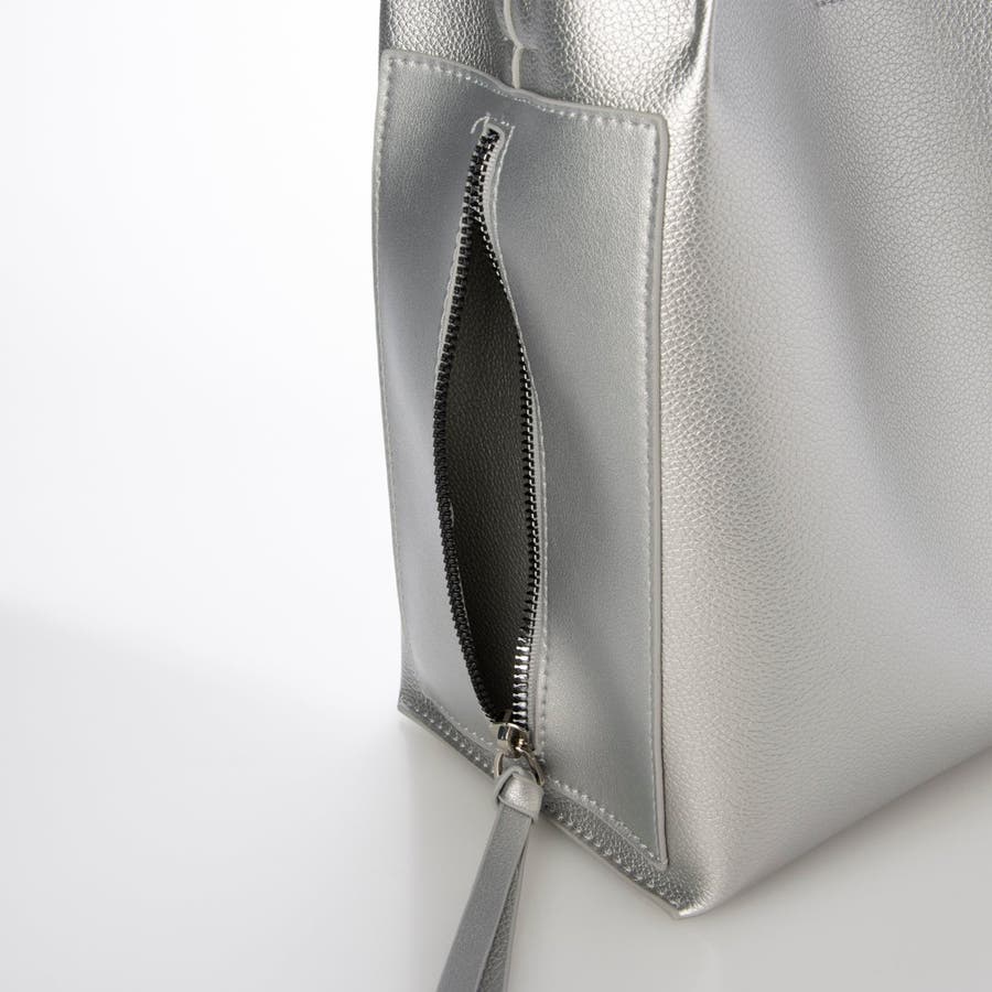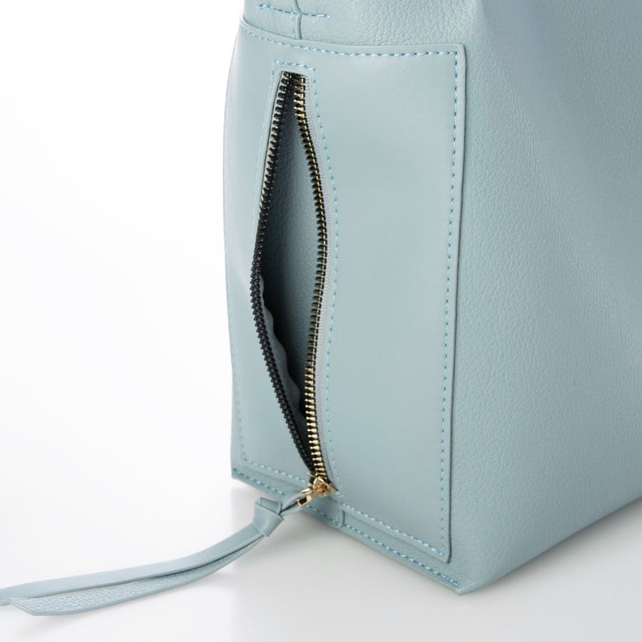 外側にスマホポケットとデザインを兼ねたファスナーポケットが付いていて使い勝手の良いトートバッグになっています。