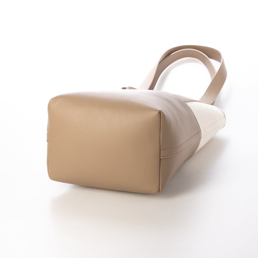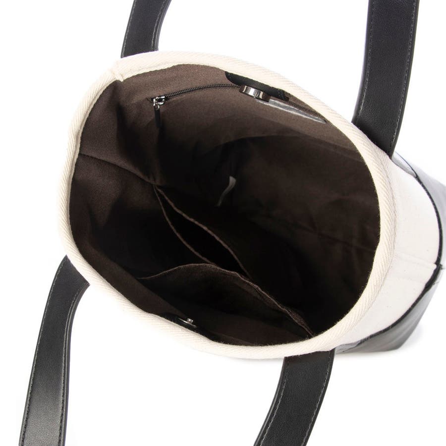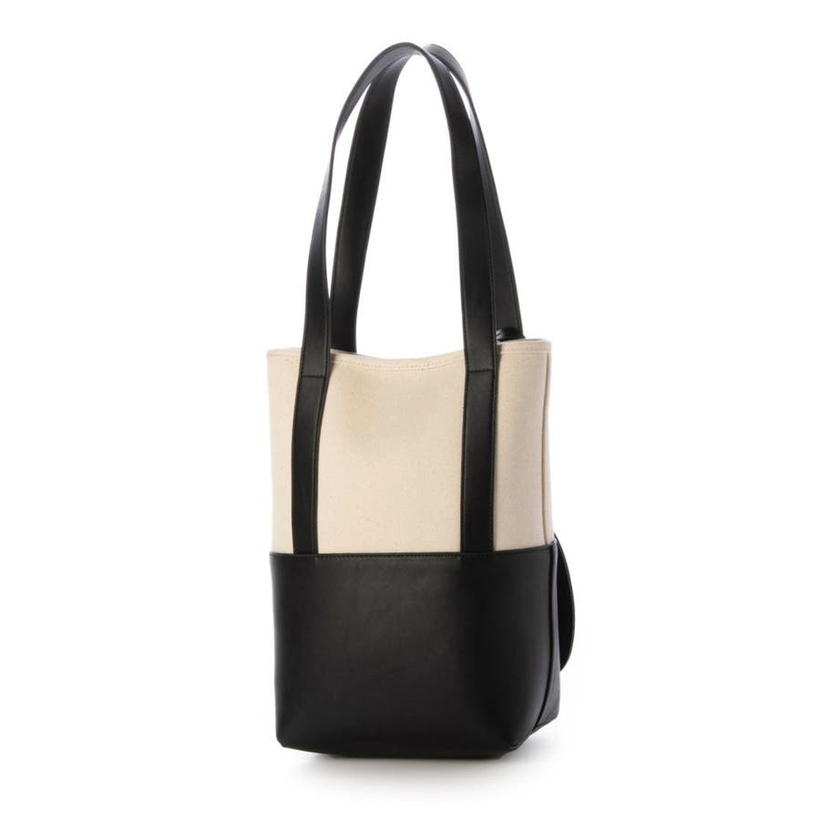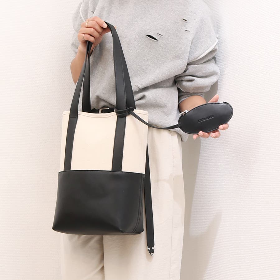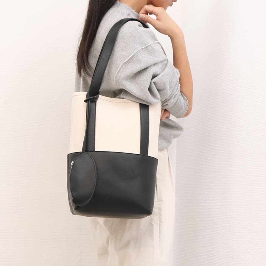 キャンバス素材と合成皮革を組み合わせたシンプルなバケツ型トートバッグ。