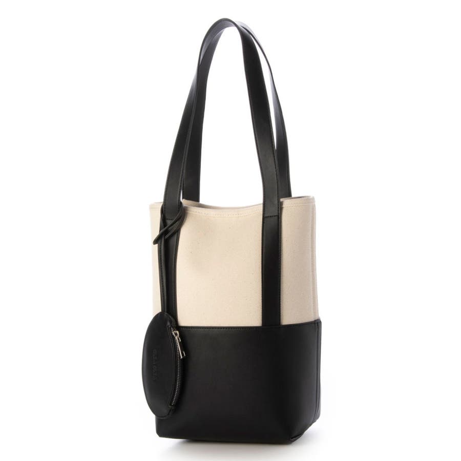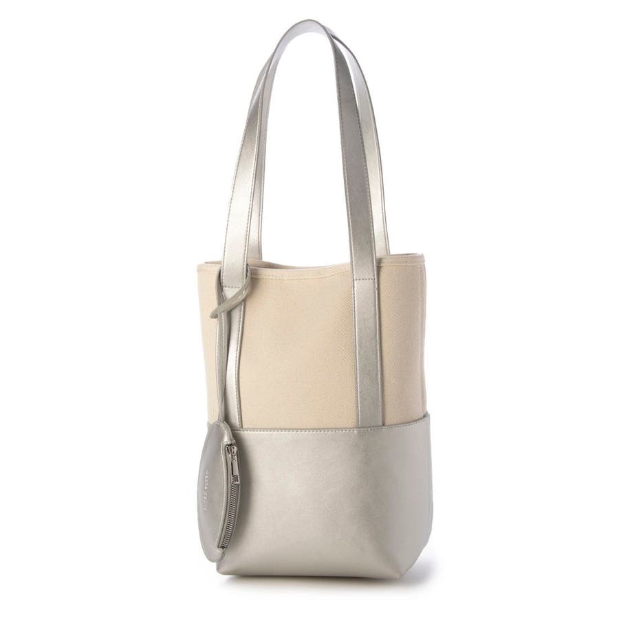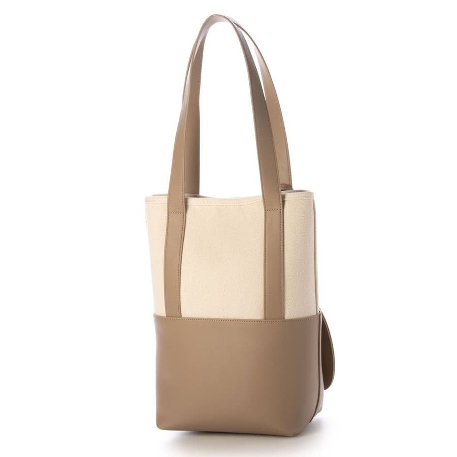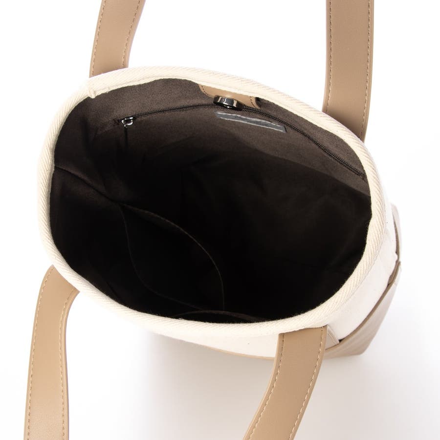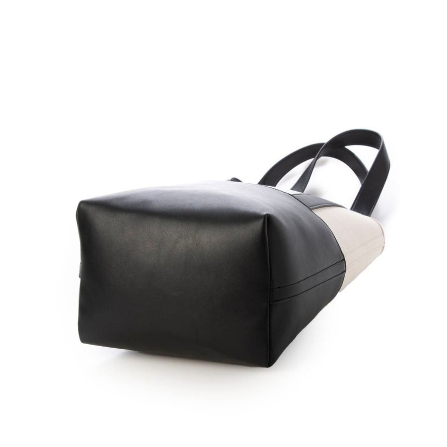 キャンバス素材と合成皮革を組み合わせたシンプルなバケツ型トートバッグ。
