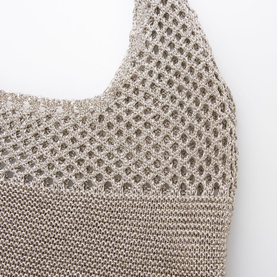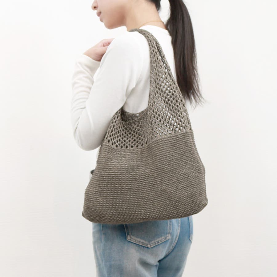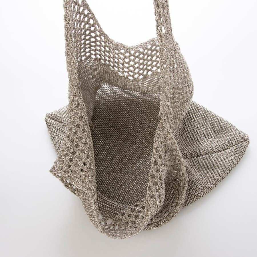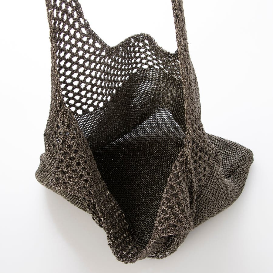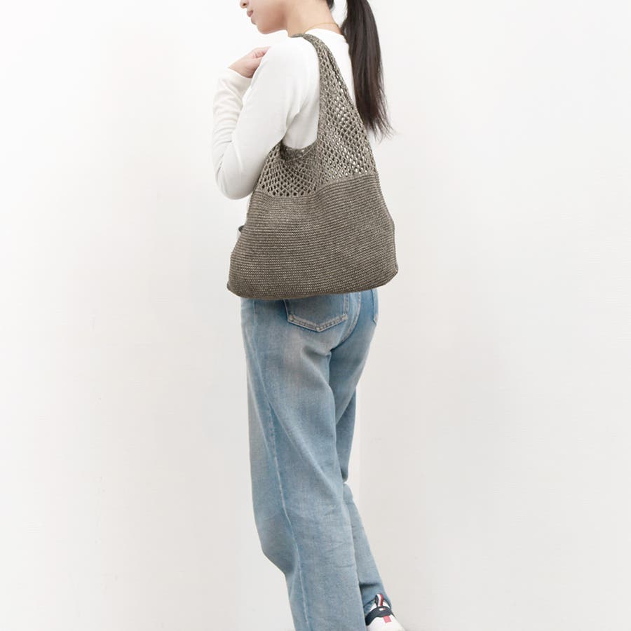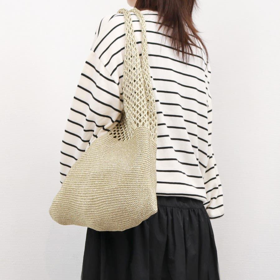 ラメ糸を編み込んだクロッシェトートバッグ。裾部分と編み方を変えたコンビが雰囲気のあるトートバッグです。長財布、500mlボトルが入るデイリーに使いやすいサイズで、折り畳めるので普段使っているバッグやトラベルバッグに入れて持ち運べ、旅行で荷物が多くなった時にも活躍します。バッグ2個持ちのサブバッグにもおすすめです。
