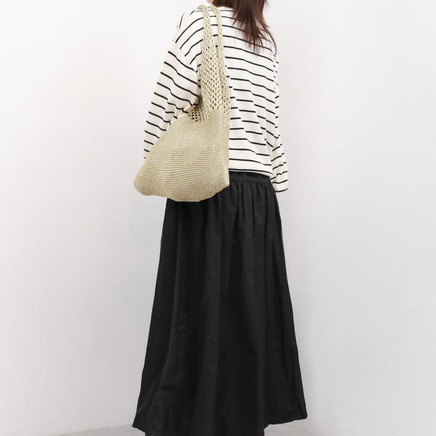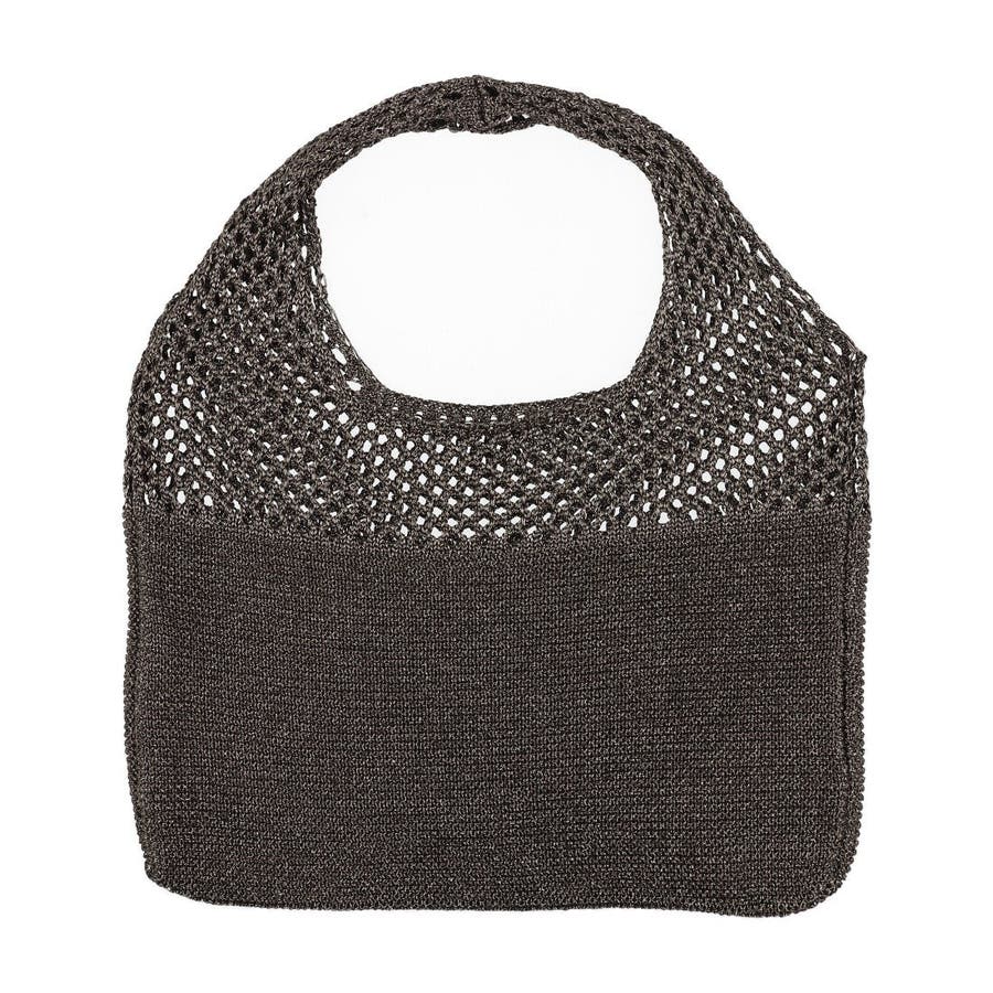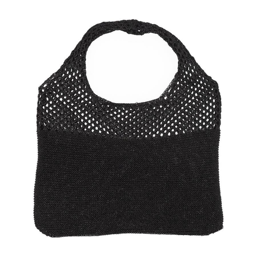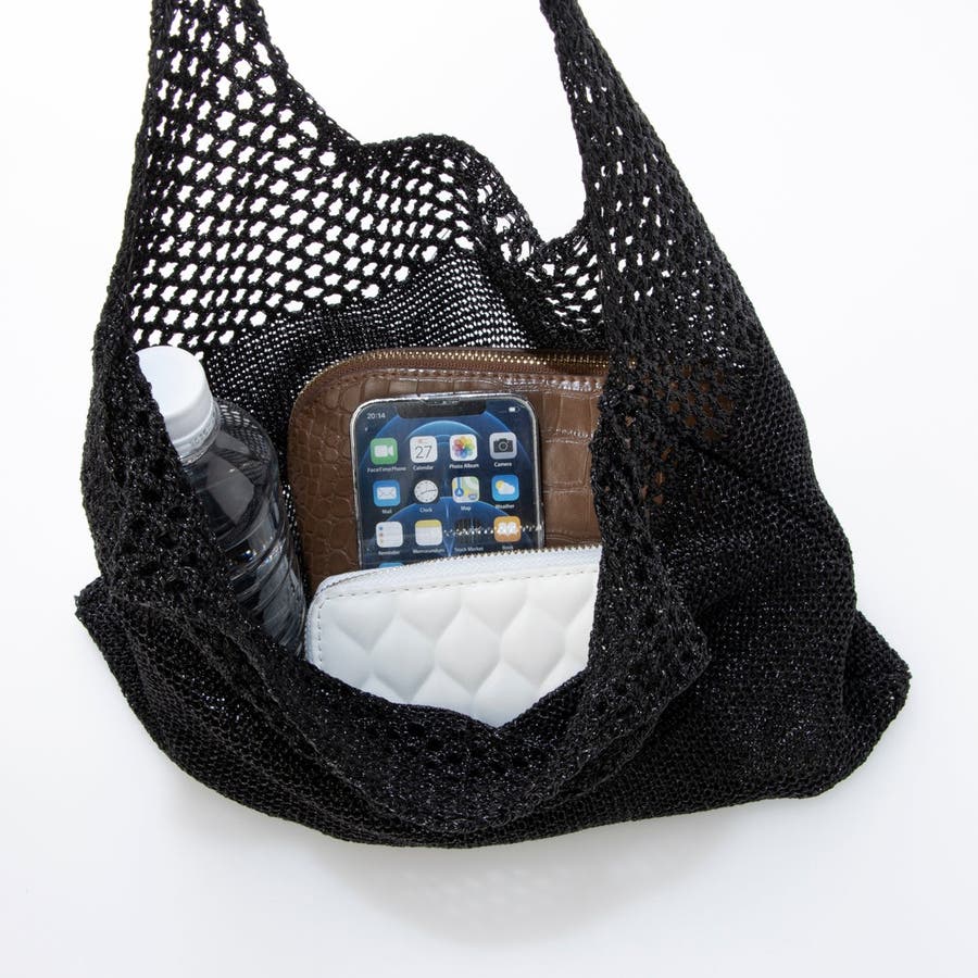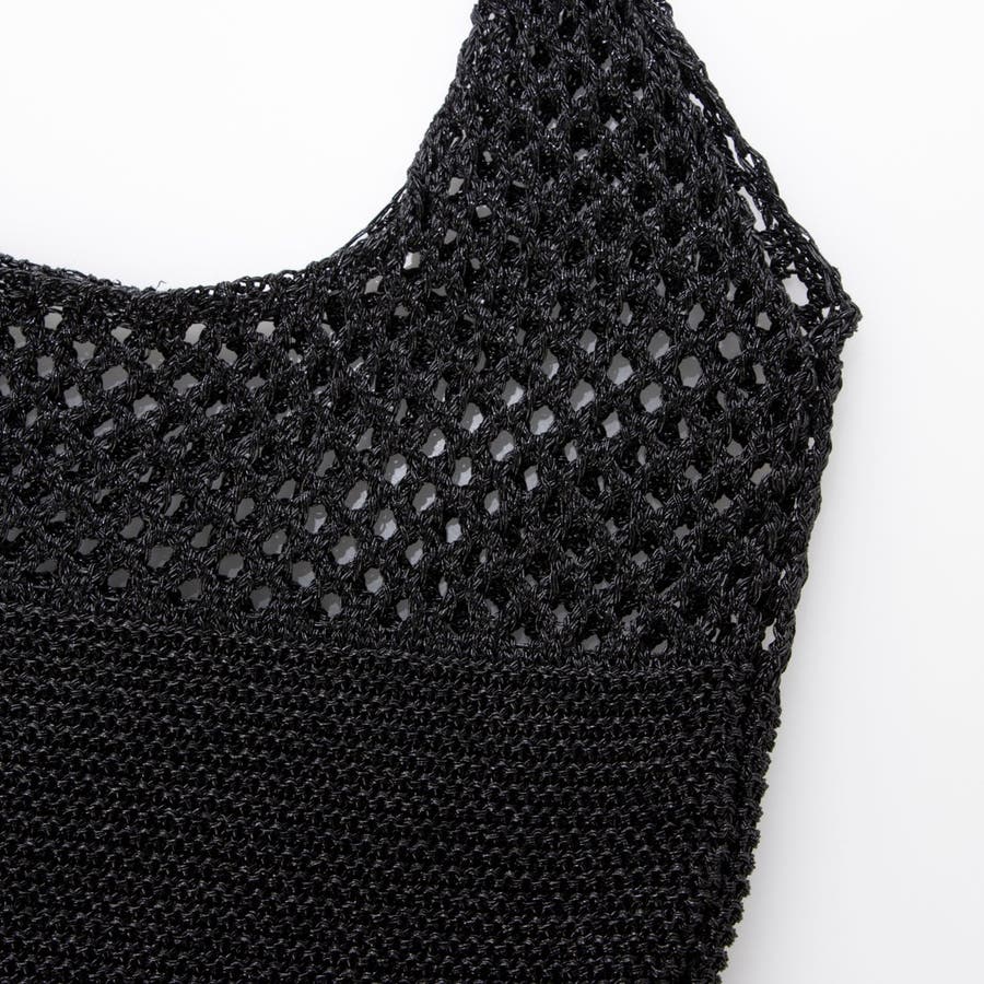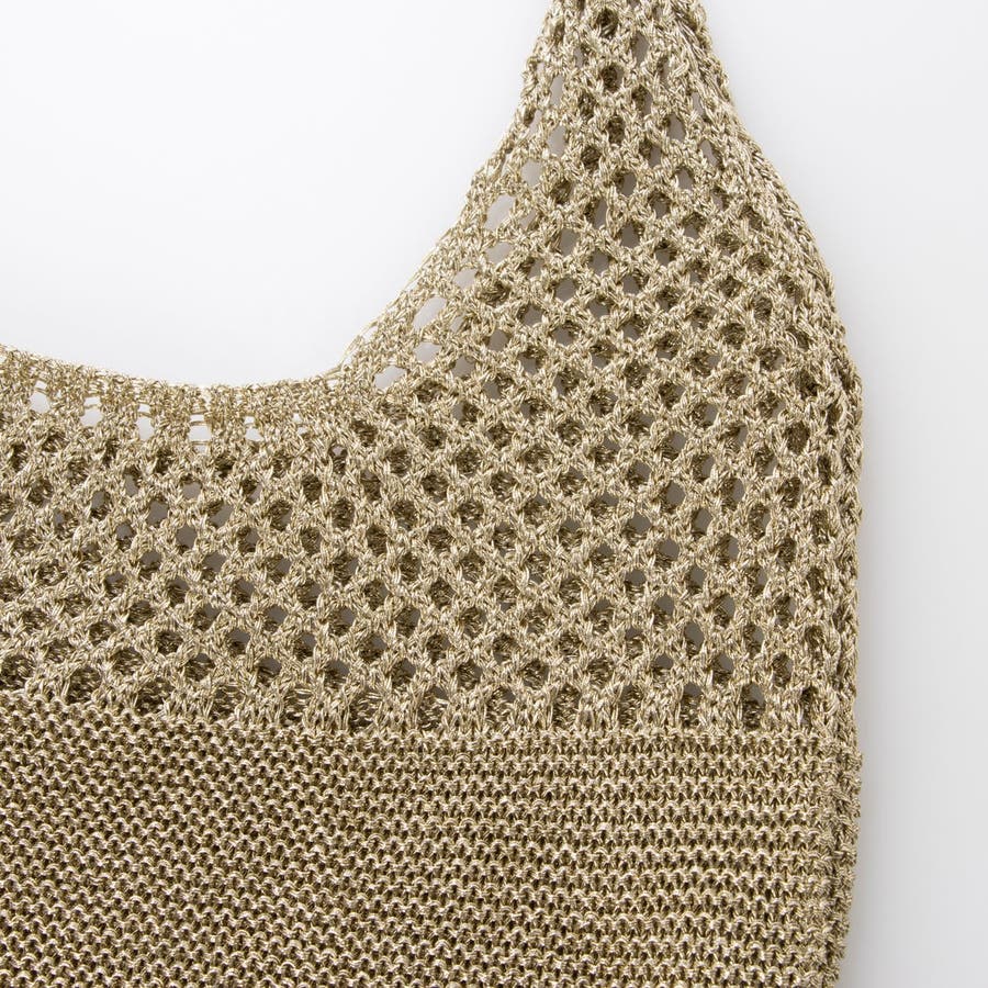 ラメ糸を編み込んだクロッシェトートバッグ。裾部分と編み方を変えたコンビが雰囲気のあるトートバッグです。長財布、500mlボトルが入るデイリーに使いやすいサイズで、折り畳めるので普段使っているバッグやトラベルバッグに入れて持ち運べ、旅行で荷物が多くなった時にも活躍します。バッグ2個持ちのサブバッグにもおすすめです。