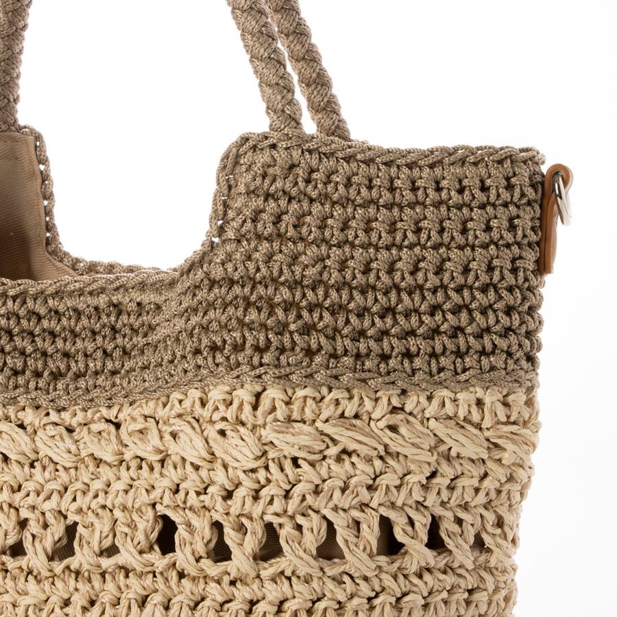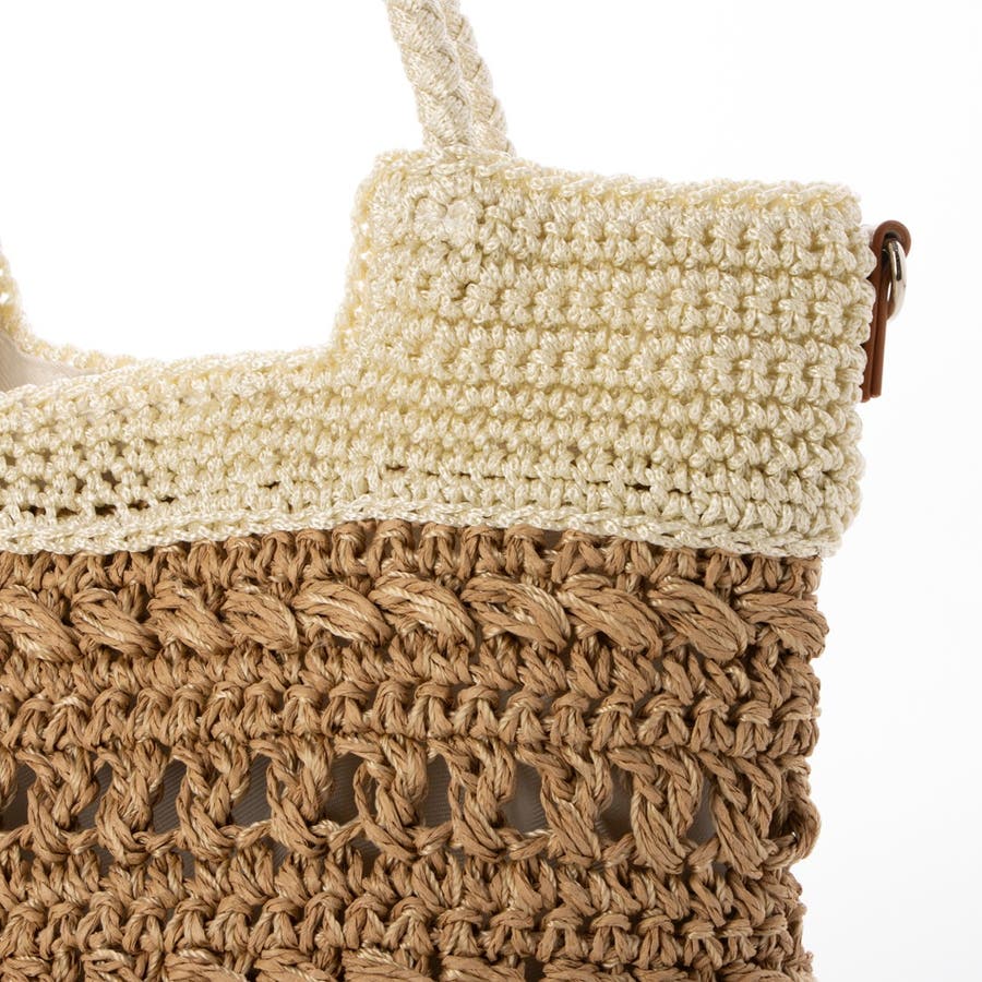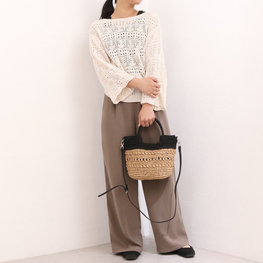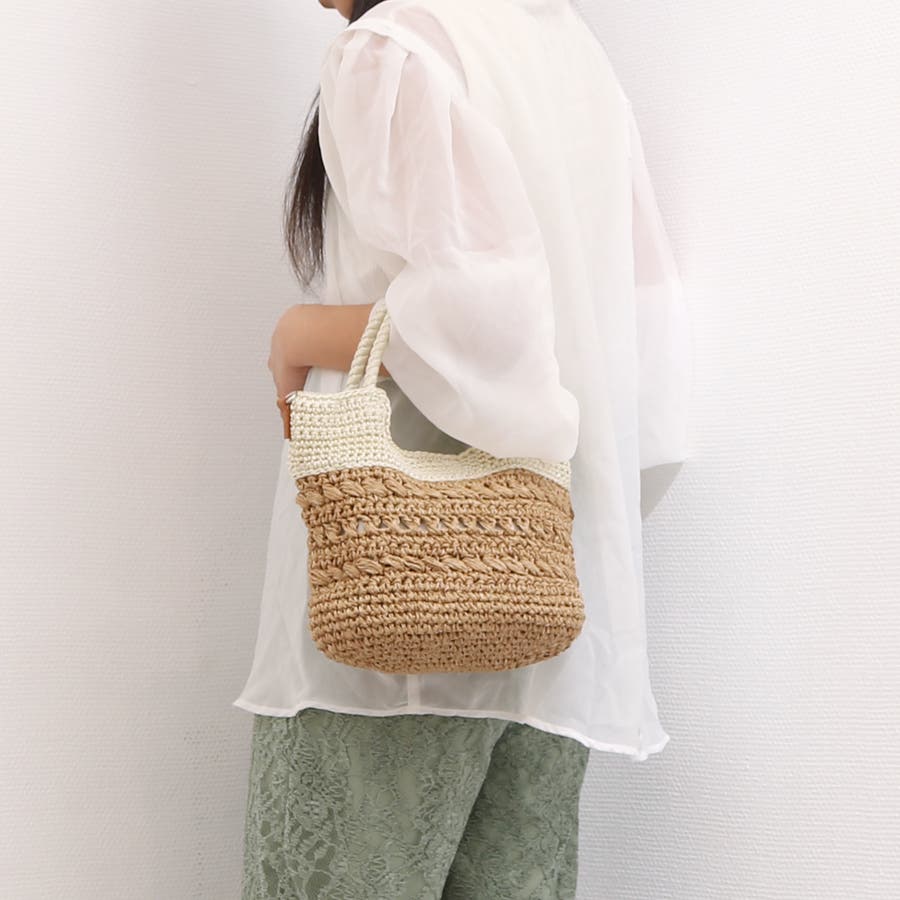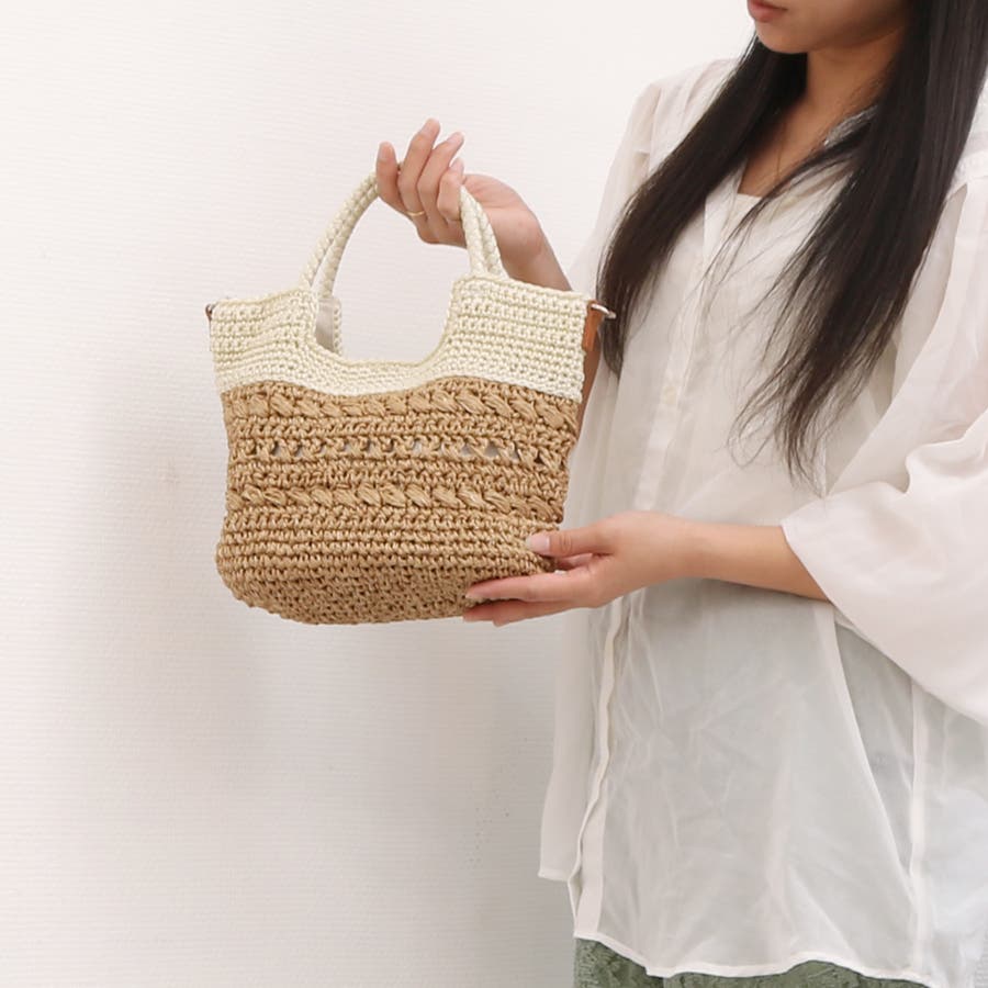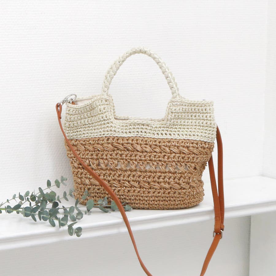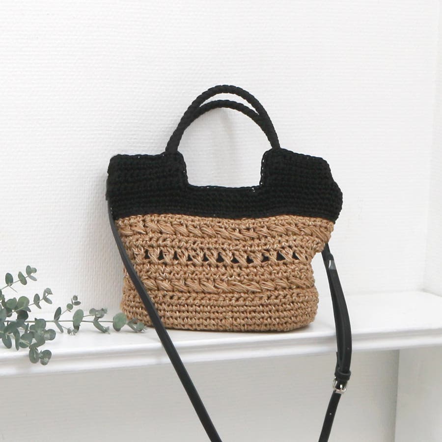 柄編みのボディとカラー配色のシンプルなクロッシェバッグ。