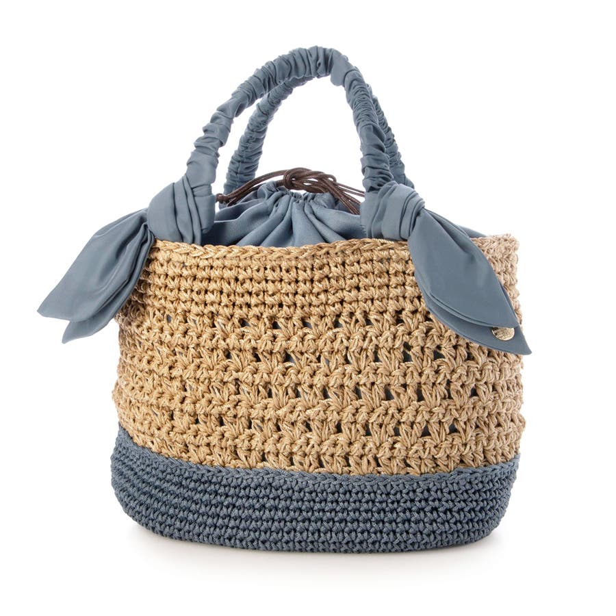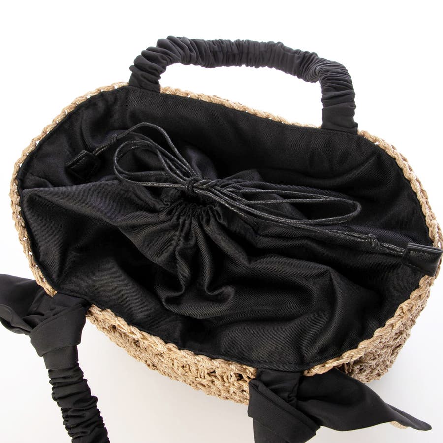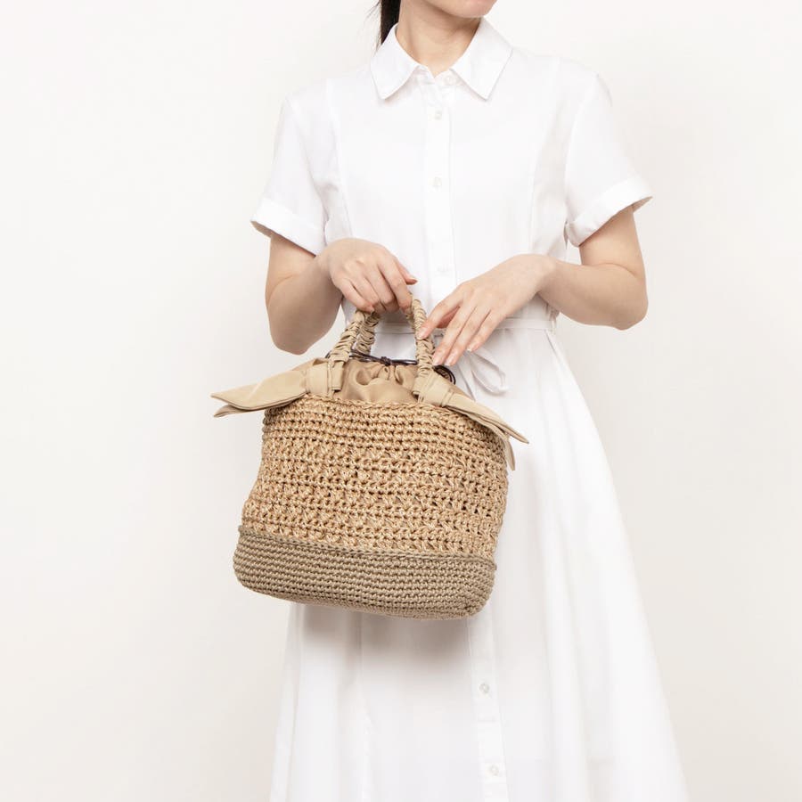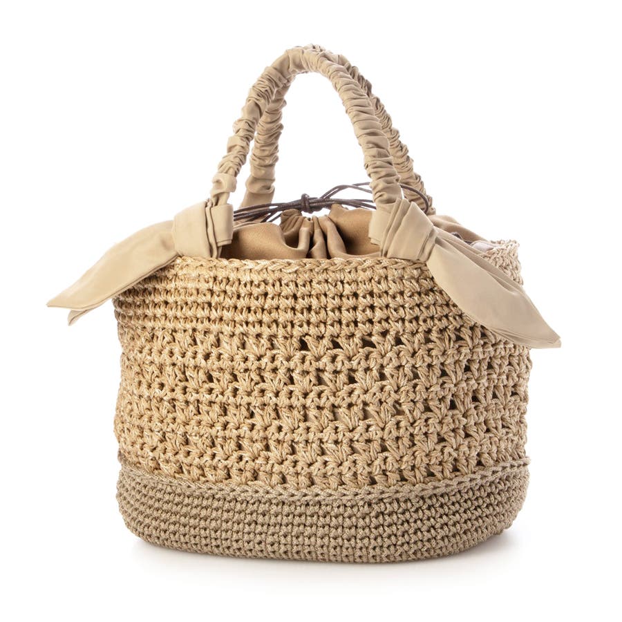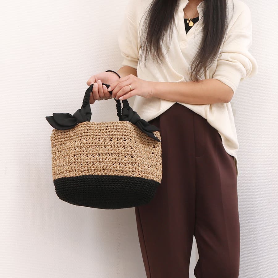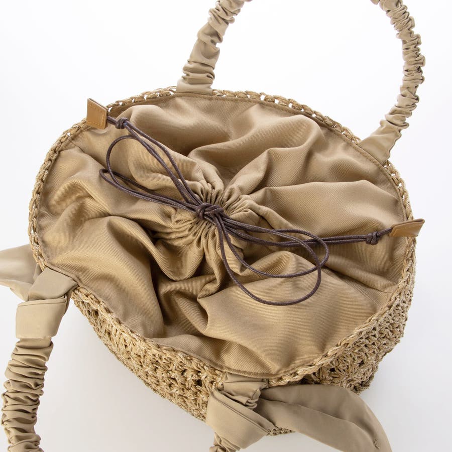 キャザーを寄せたクシュクシュハンドルと両側に下がったリボンがポイントのカゴトートバッグ。