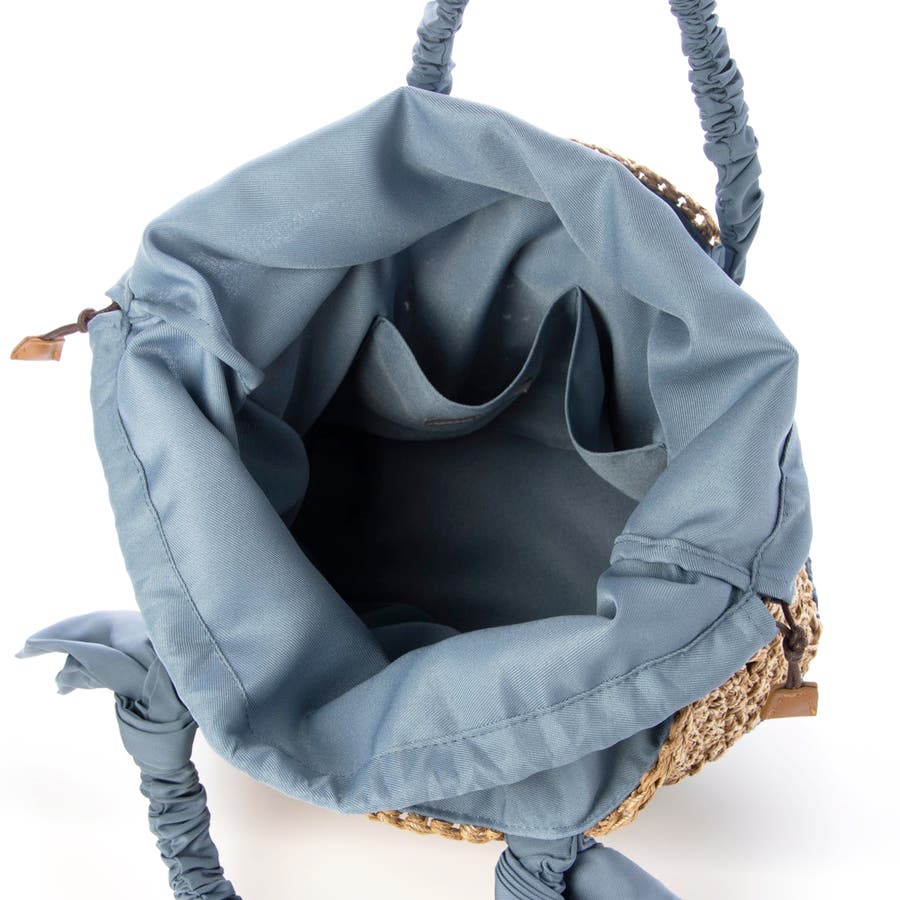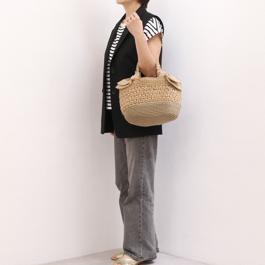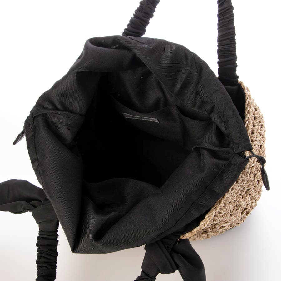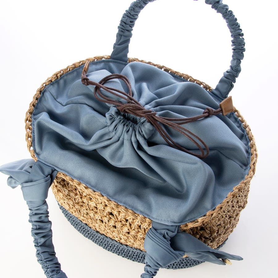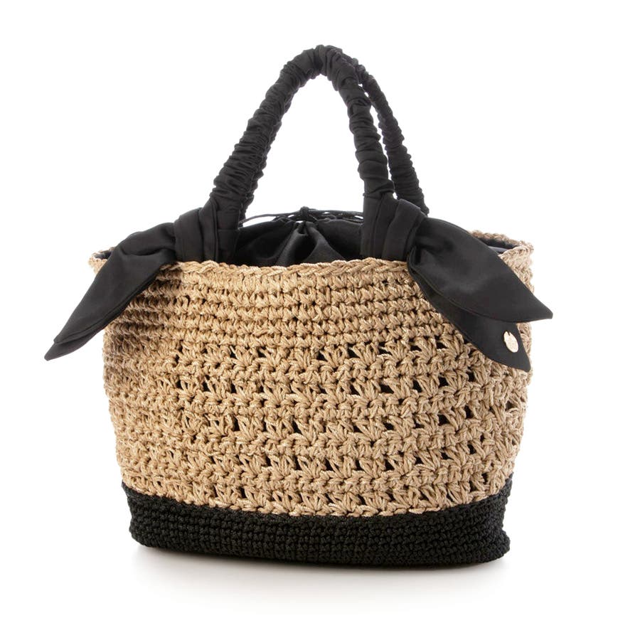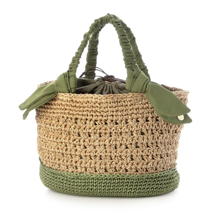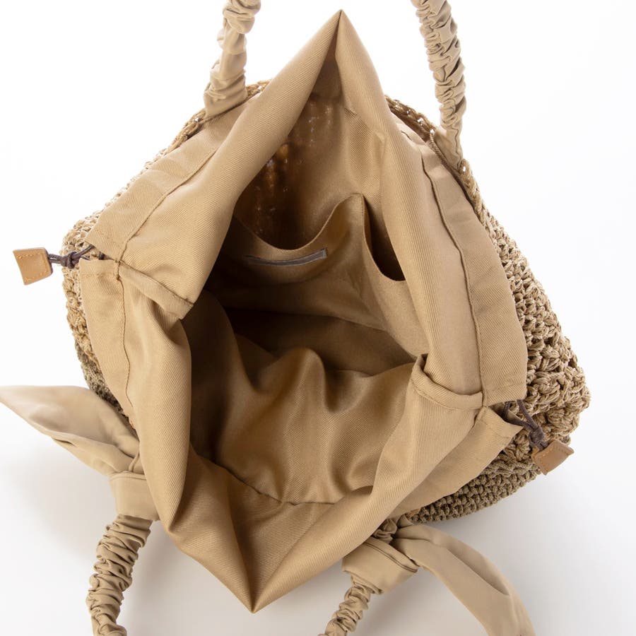 キャザーを寄せたクシュクシュハンドルと両側に下がったリボンがポイントのカゴトートバッグ。