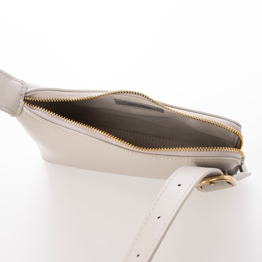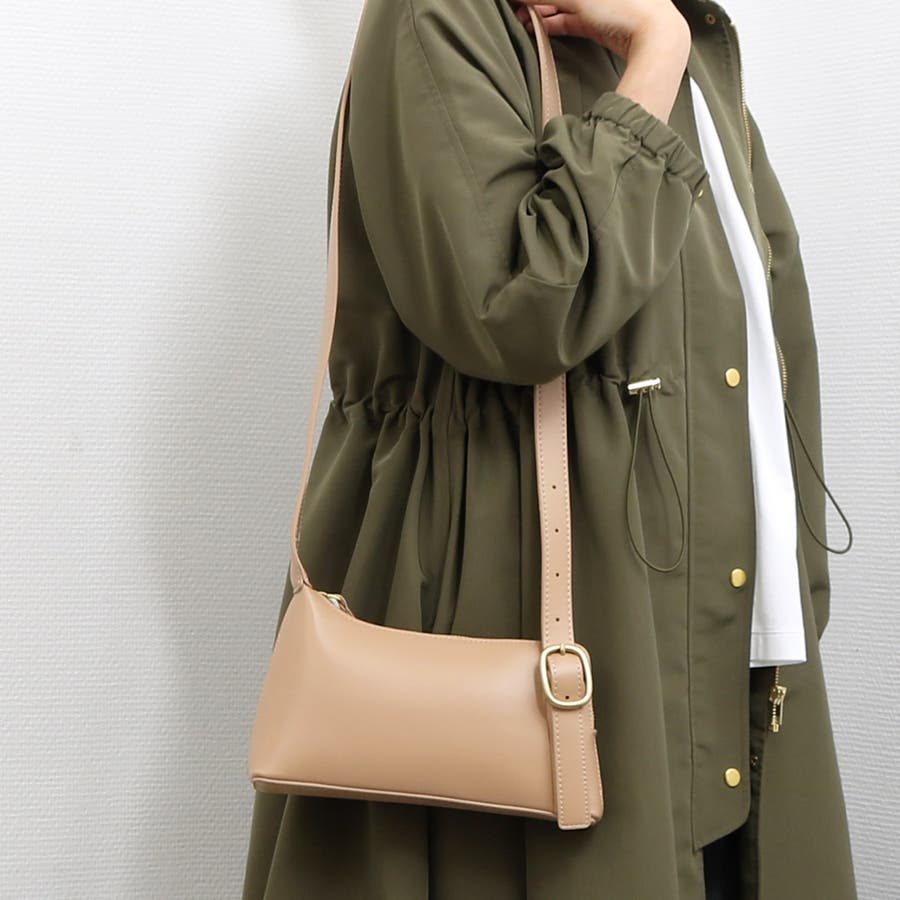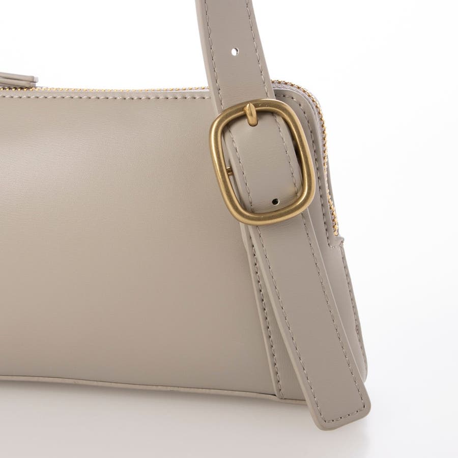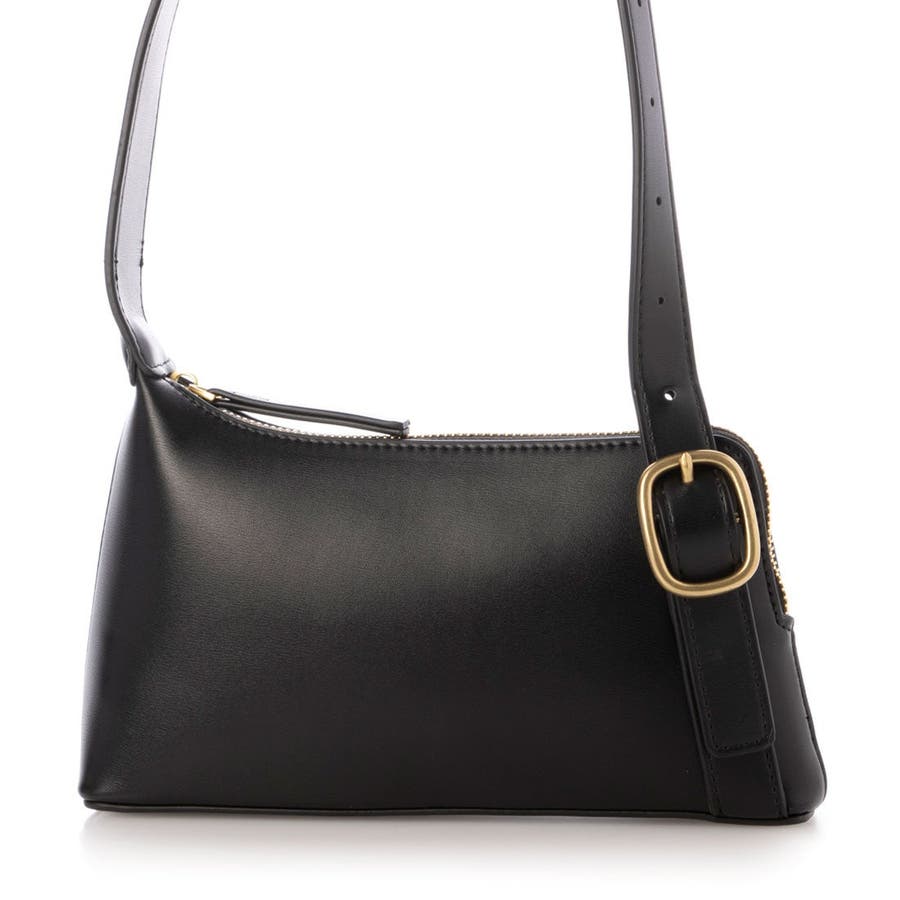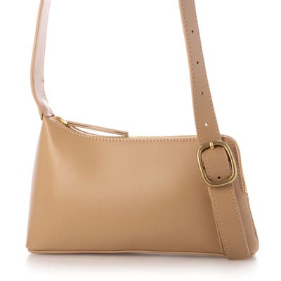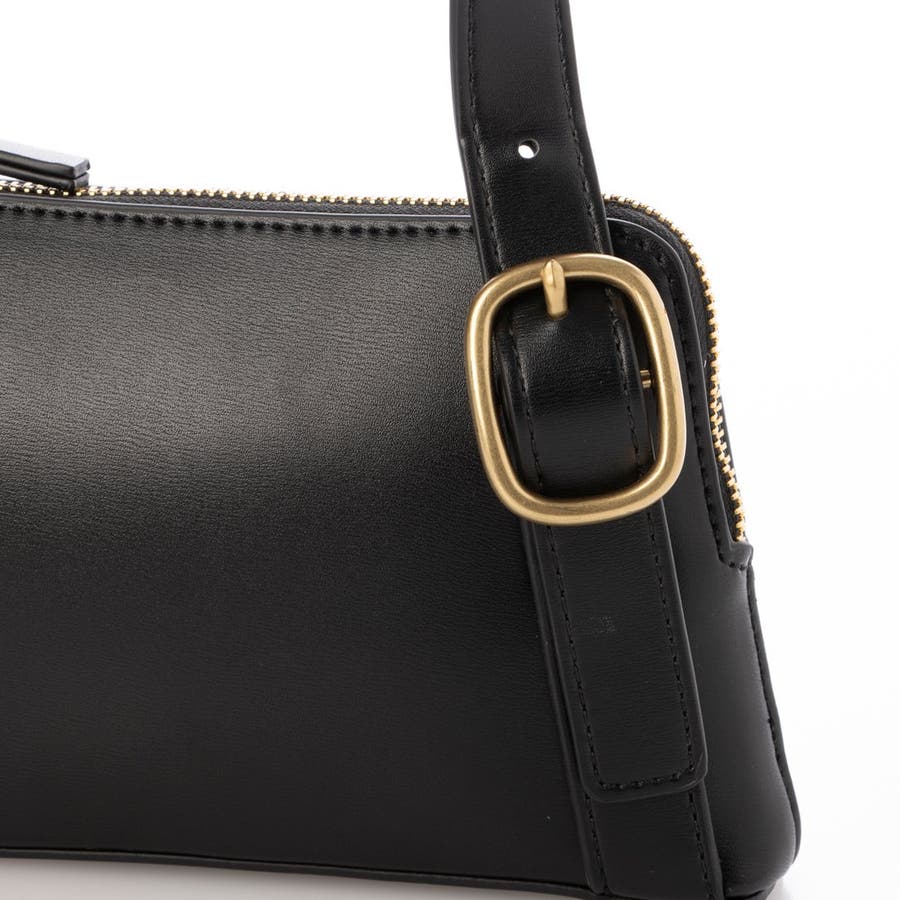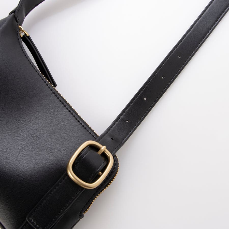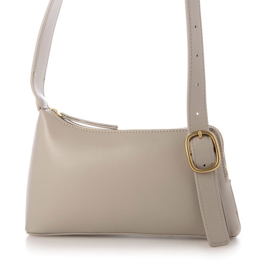正面に見える大きめバックルとアシンメトリーなフォルムがトレンド感のあるミニショルダーバッグ。
