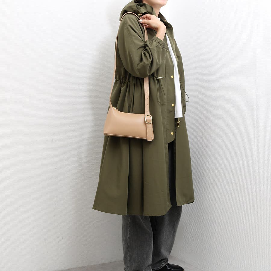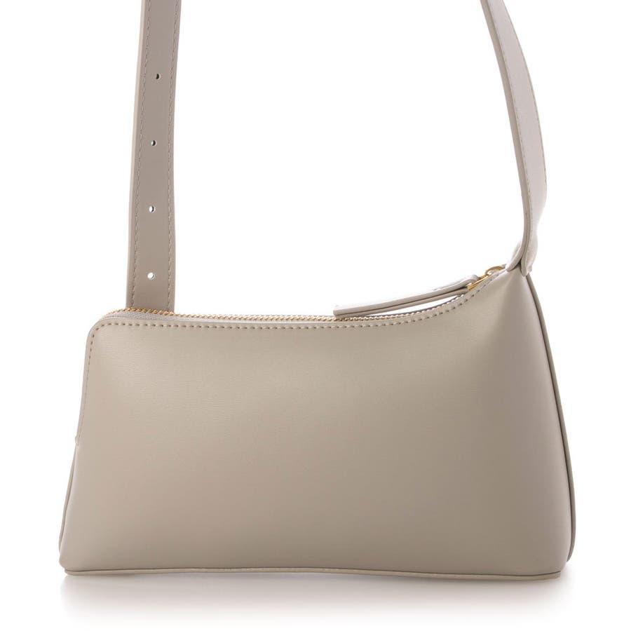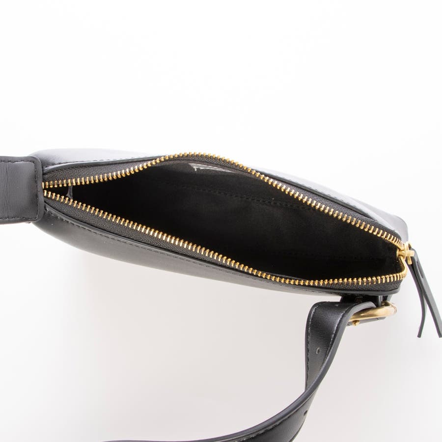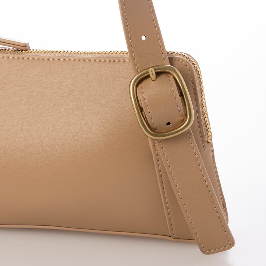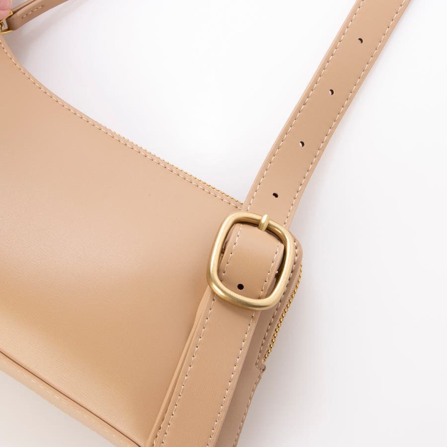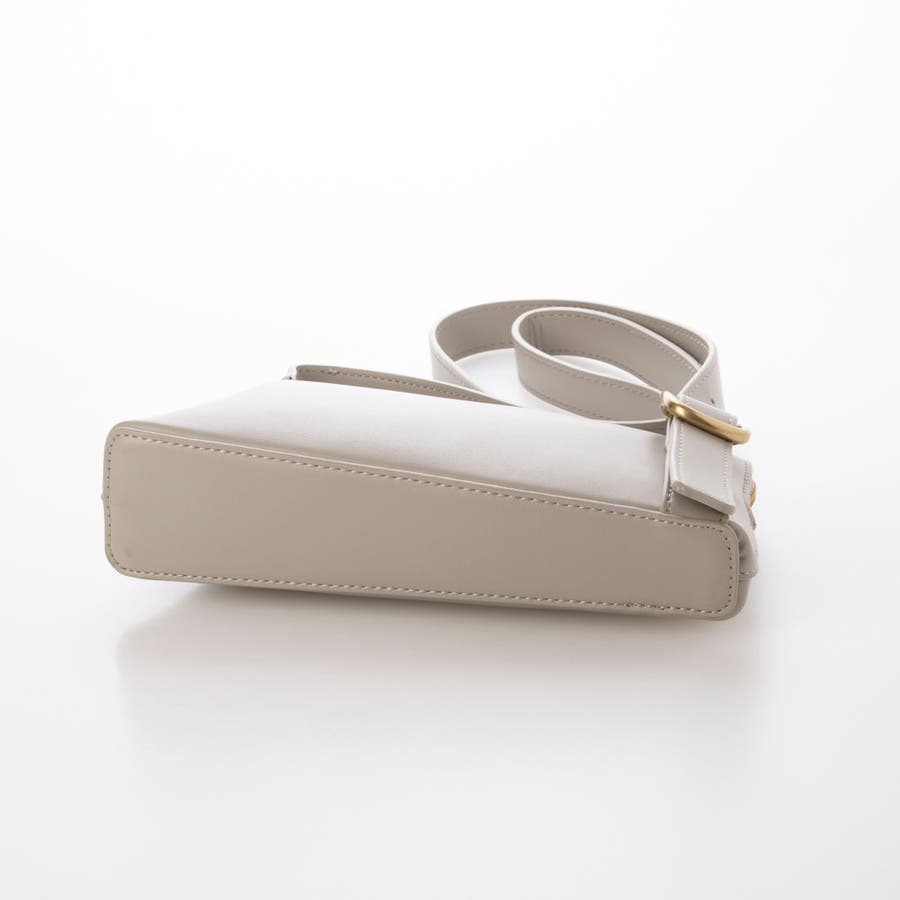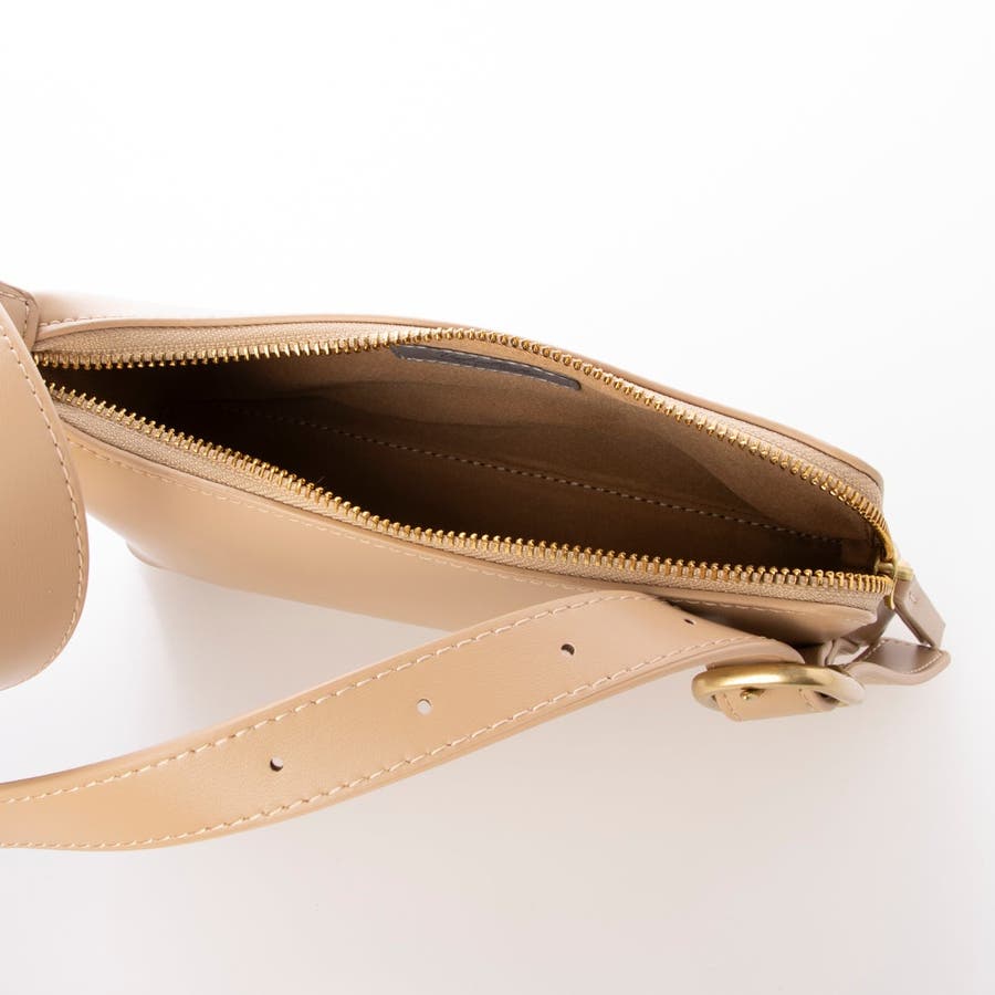 正面に見える大きめバックルとアシンメトリーなフォルムがトレンド感のあるミニショルダーバッグ。