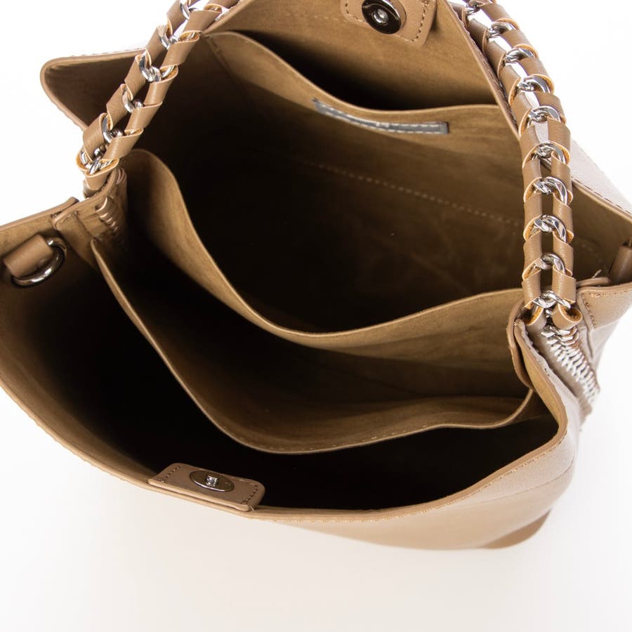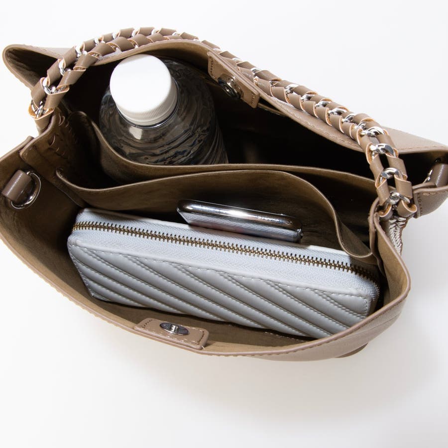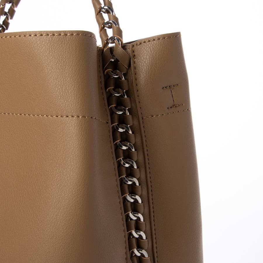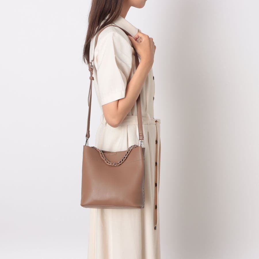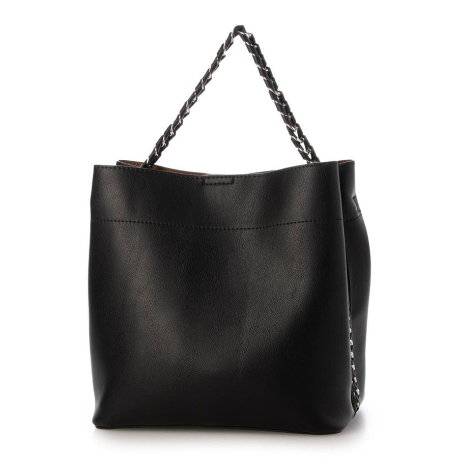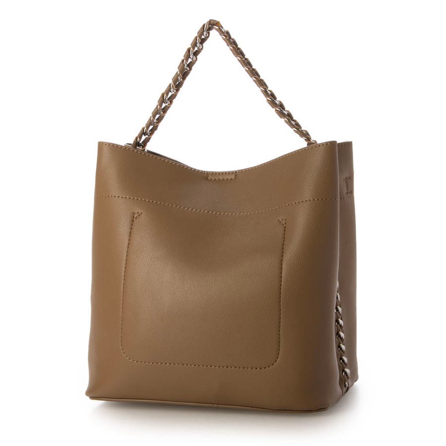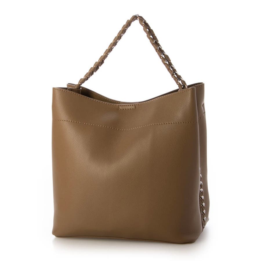 サイドのかがりチェーンがデザインポイントの2wayトートバッグ。