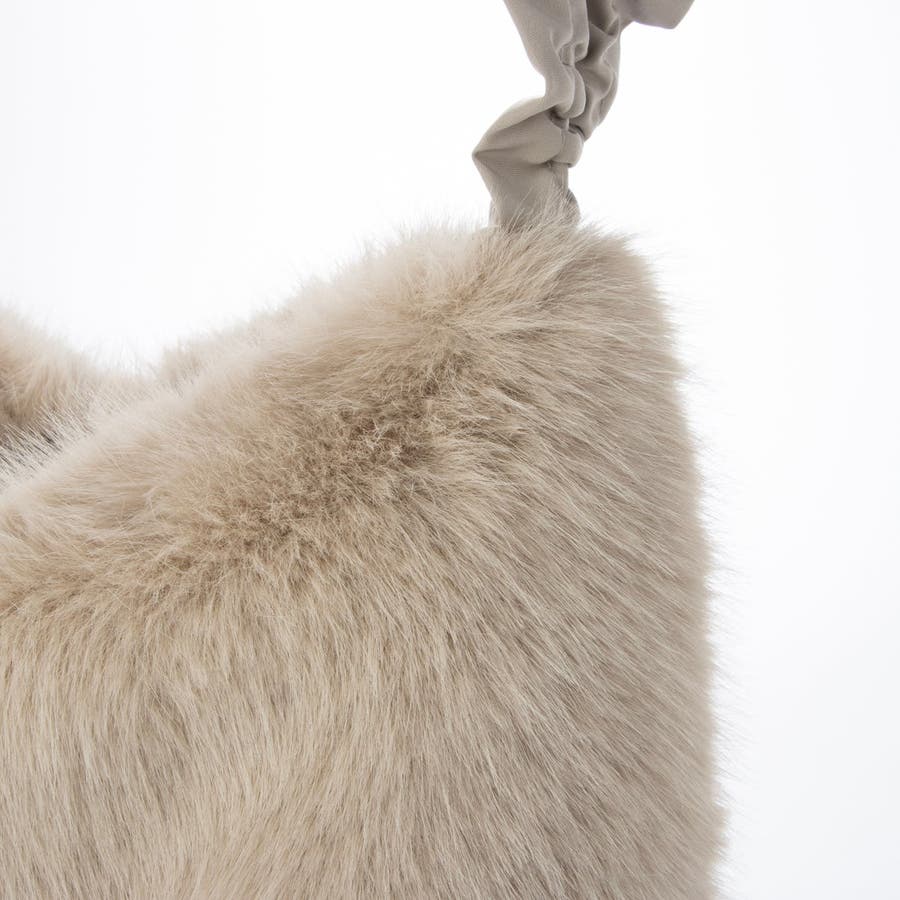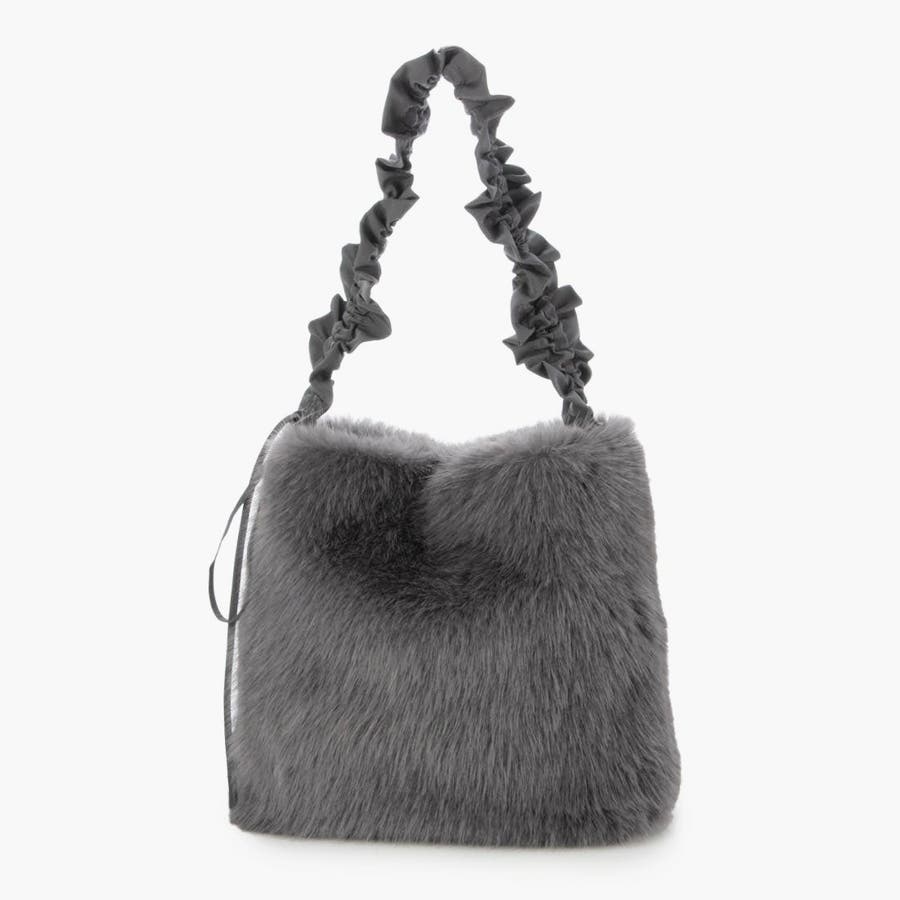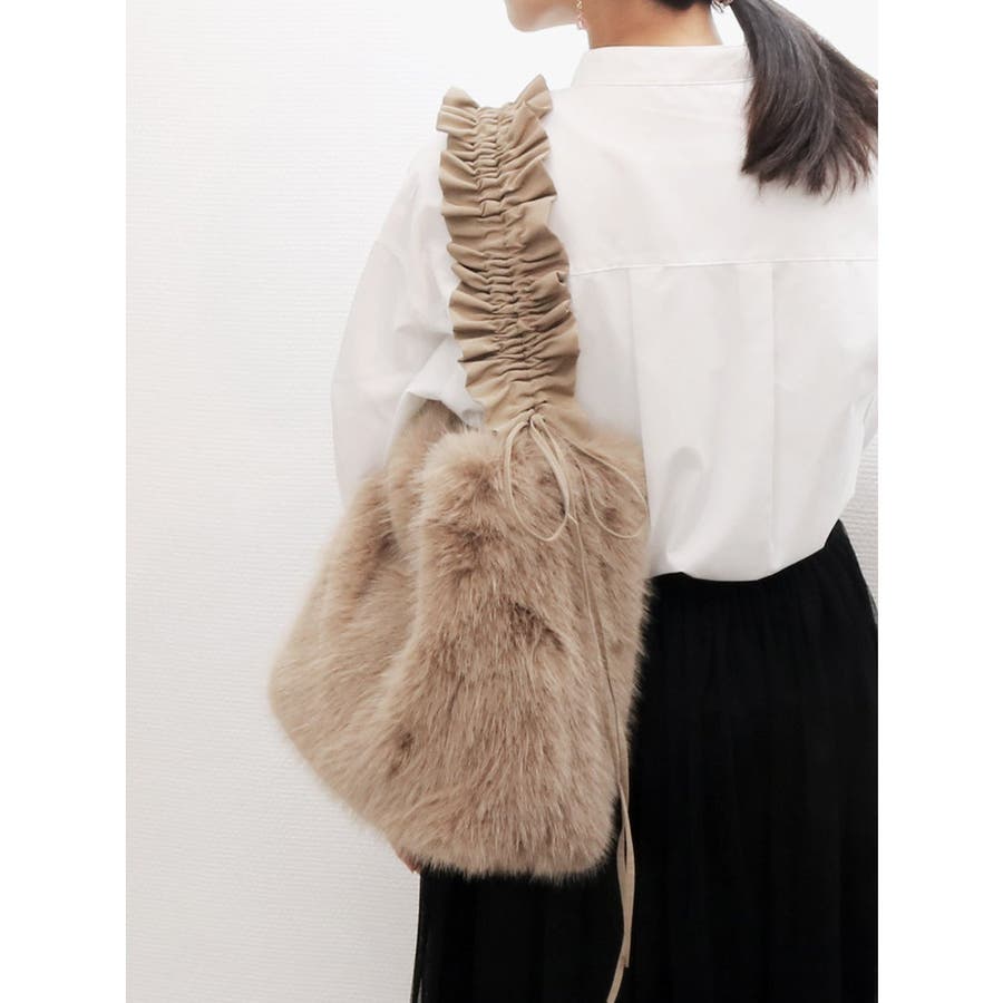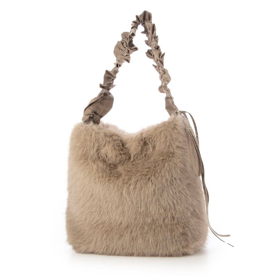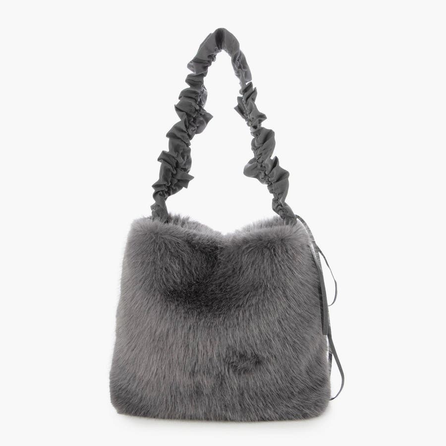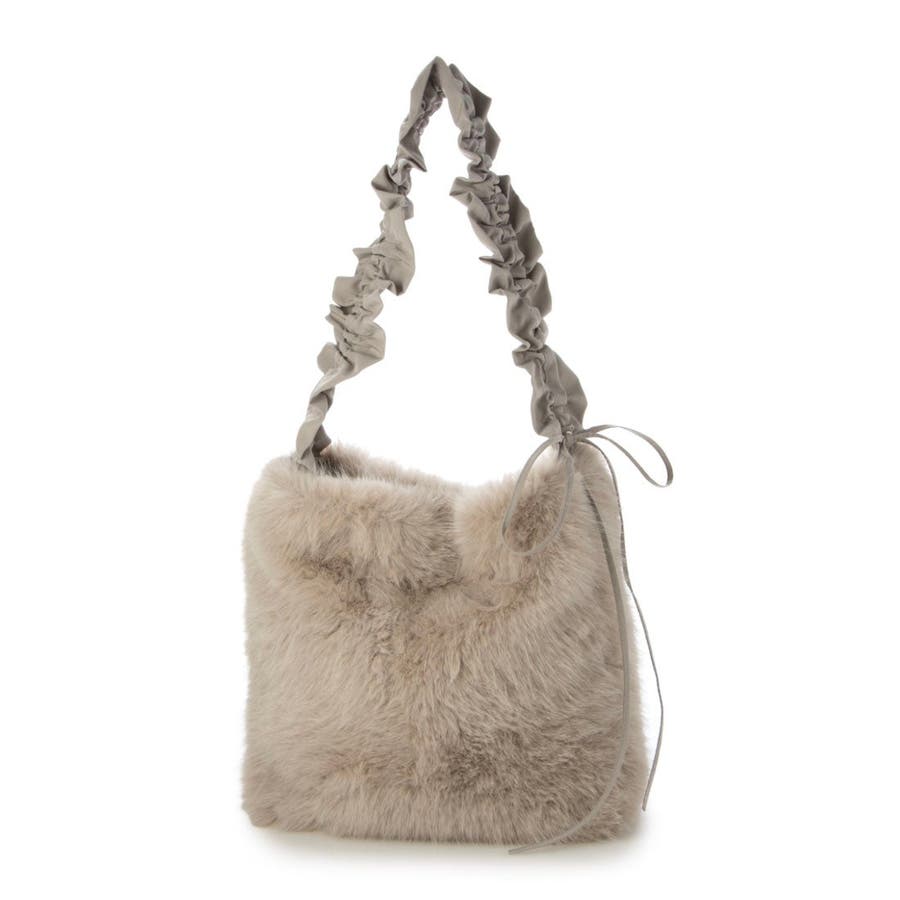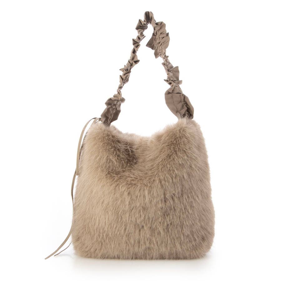 クシュっと寄せたギャザーショルダーとフワフワで手触りの良いエコファーボディがポイントのトートバッグ。