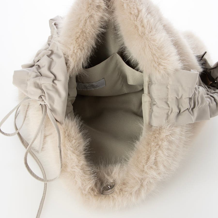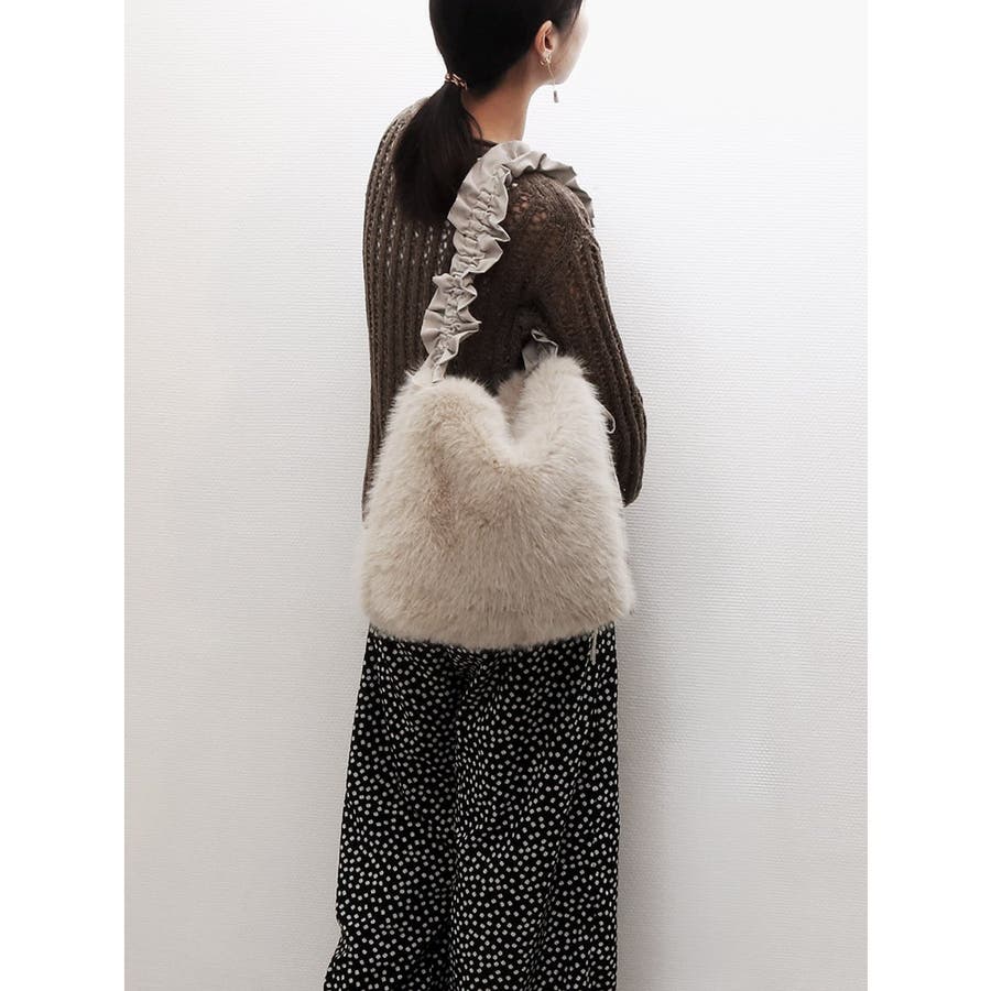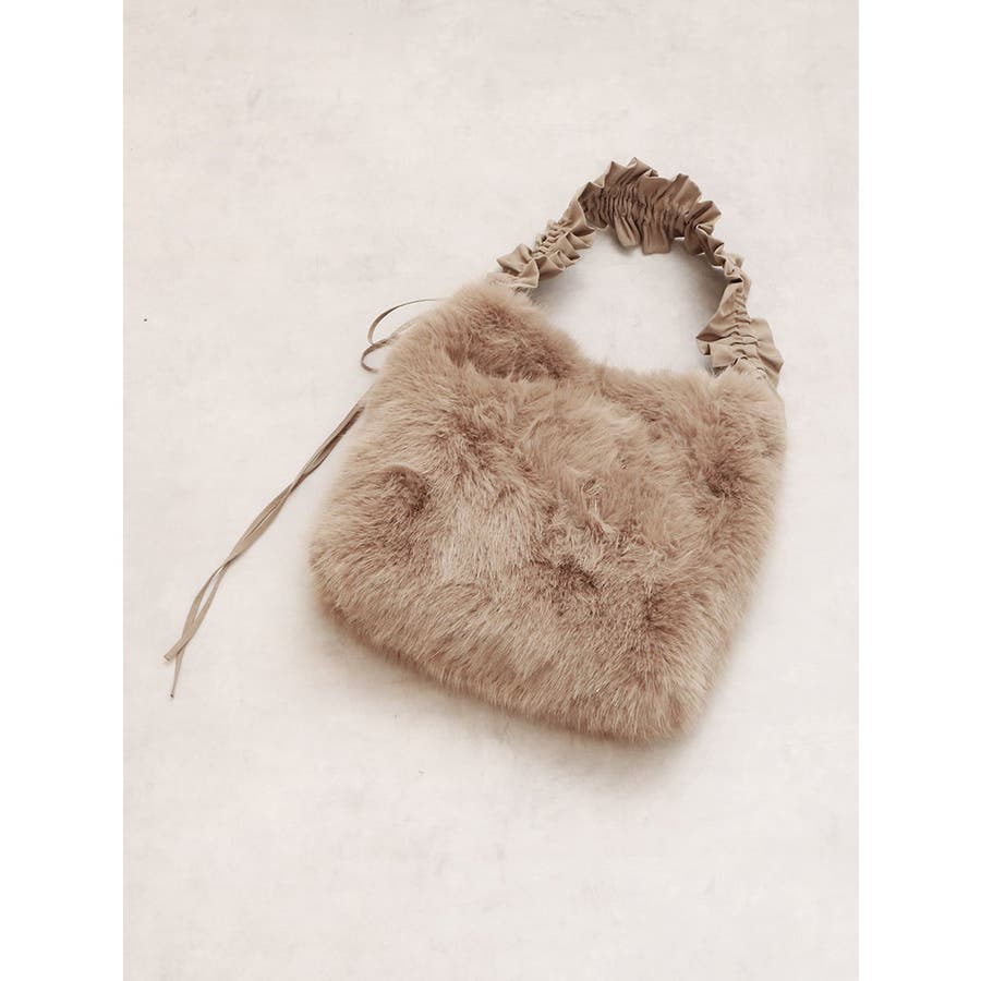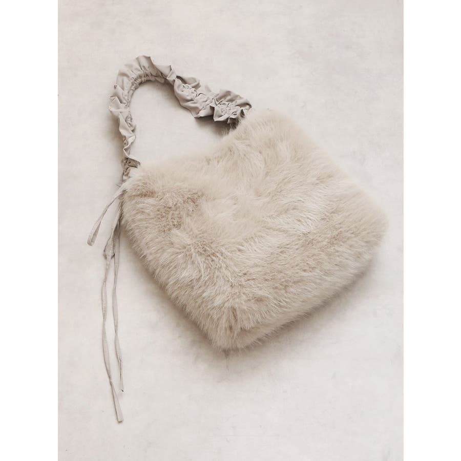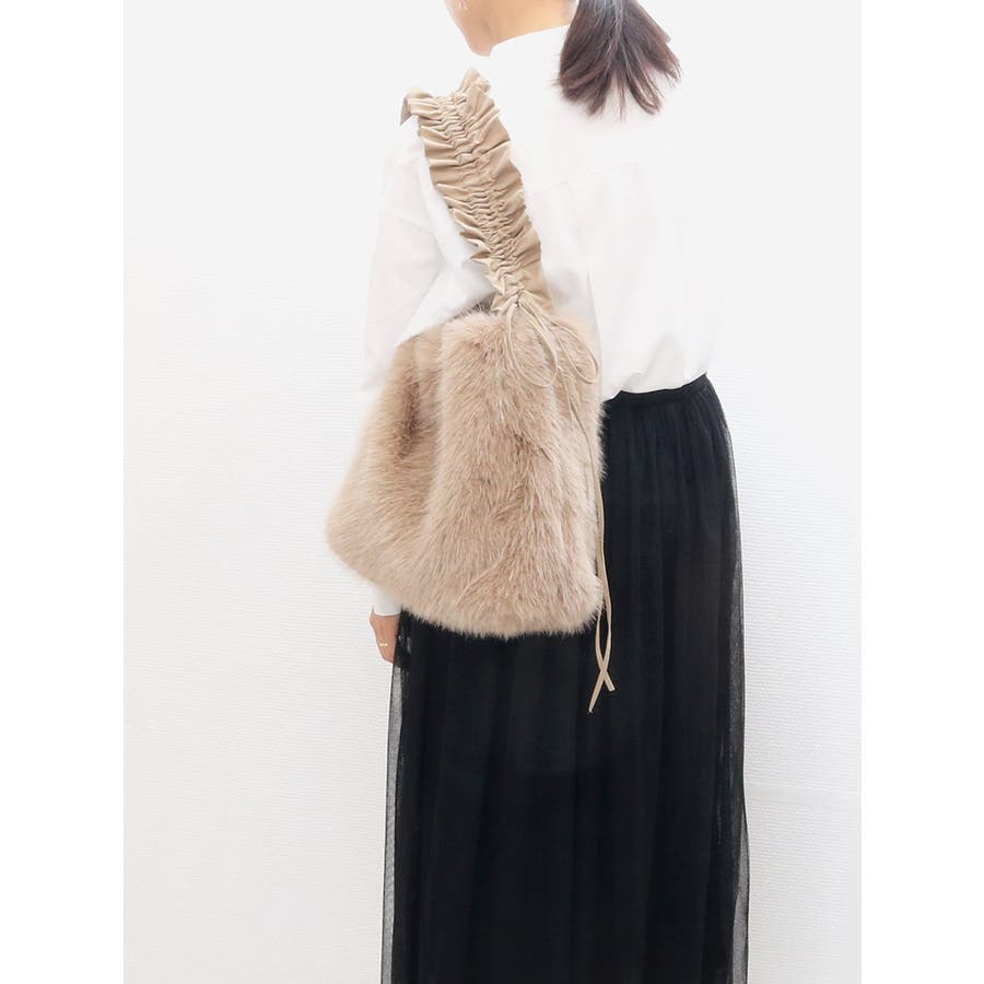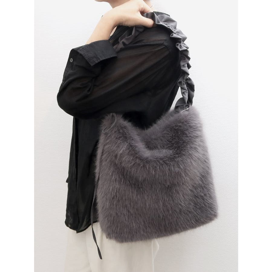 クシュっと寄せたギャザーショルダーとフワフワで手触りの良いエコファーボディがポイントのトートバッグ。