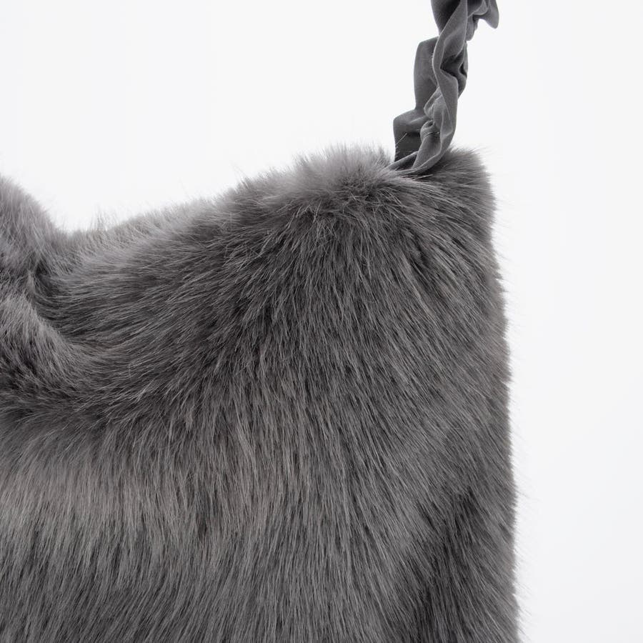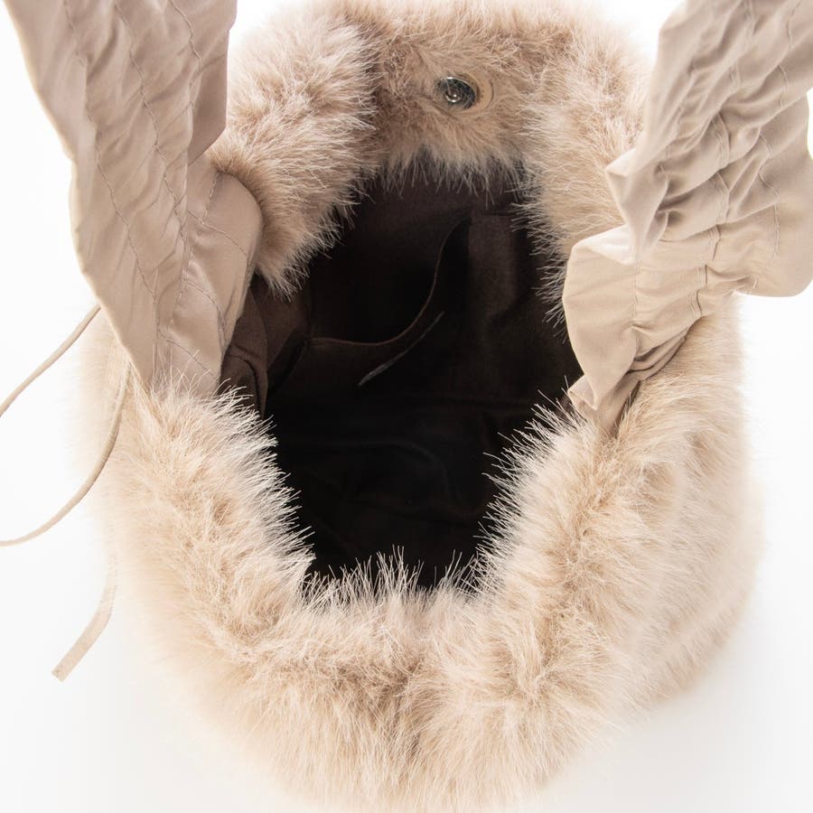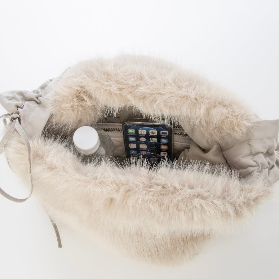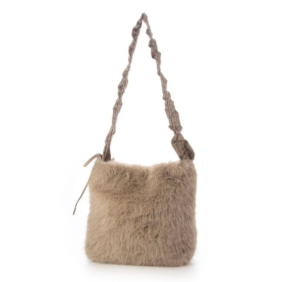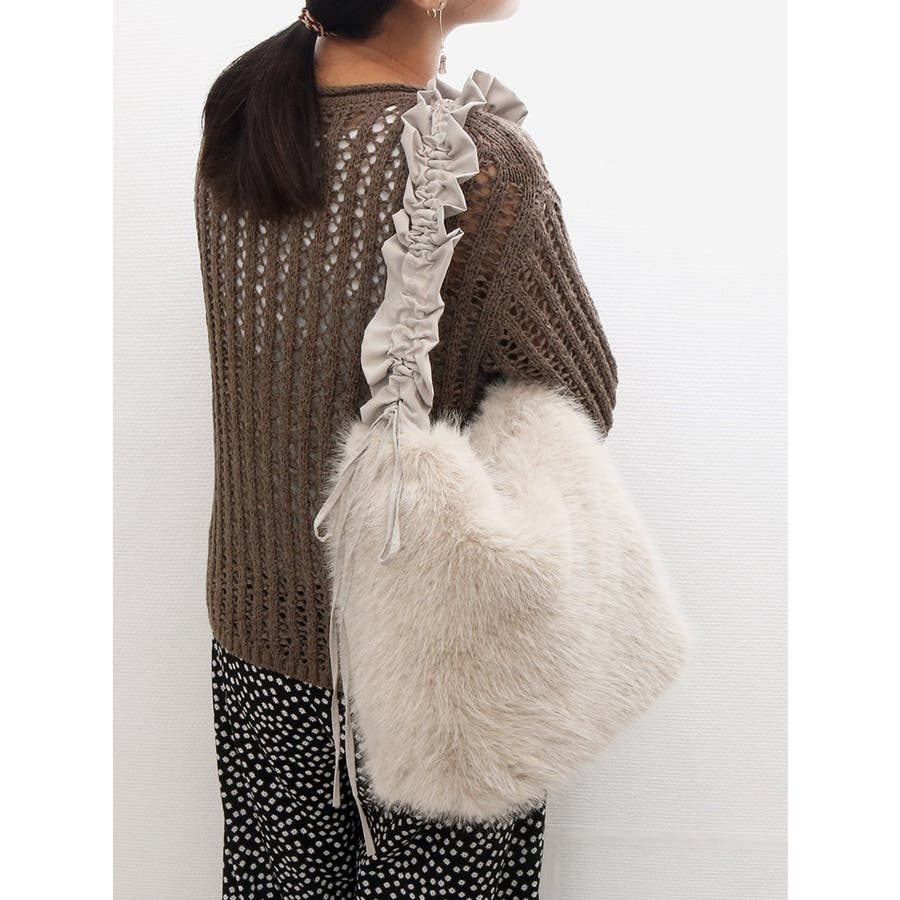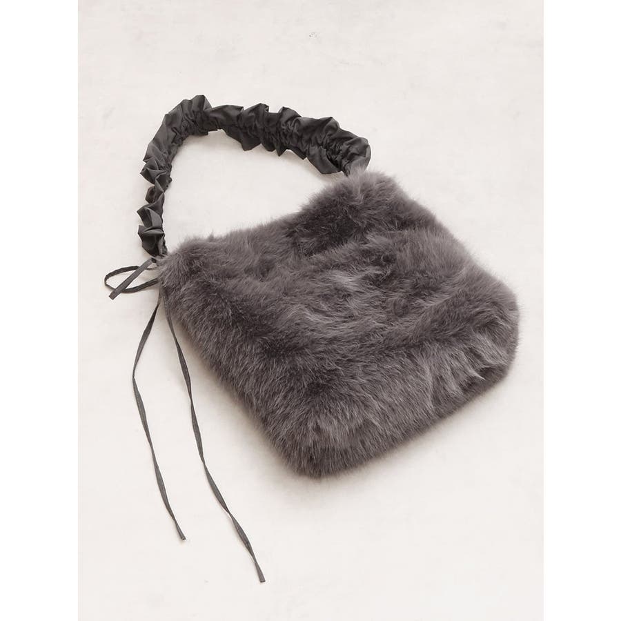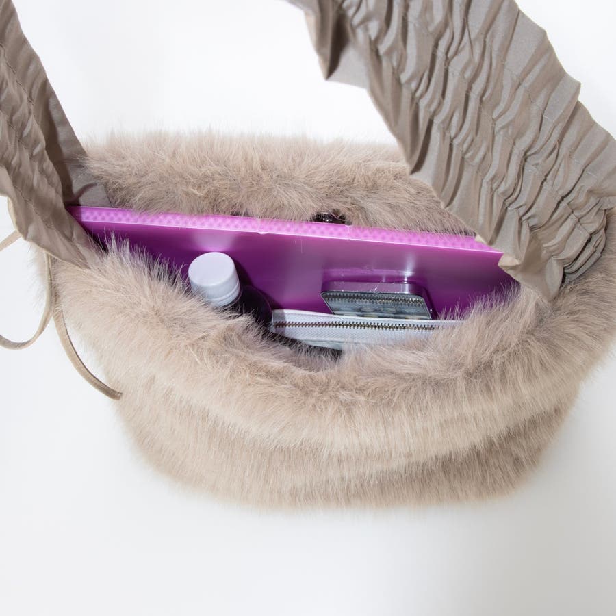 クシュっと寄せたギャザーショルダーとフワフワで手触りの良いエコファーボディがポイントのトートバッグ。