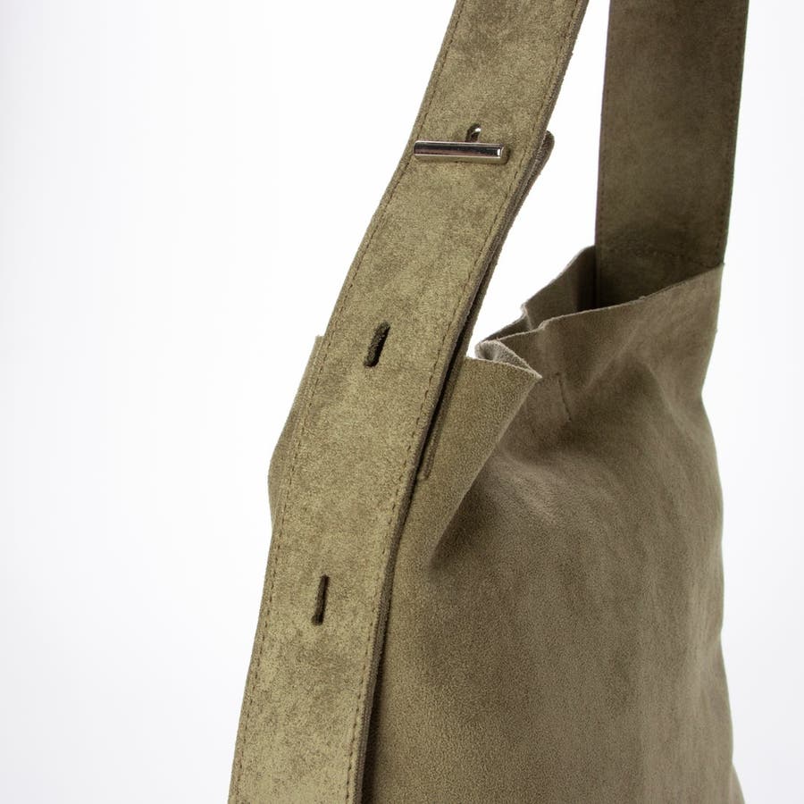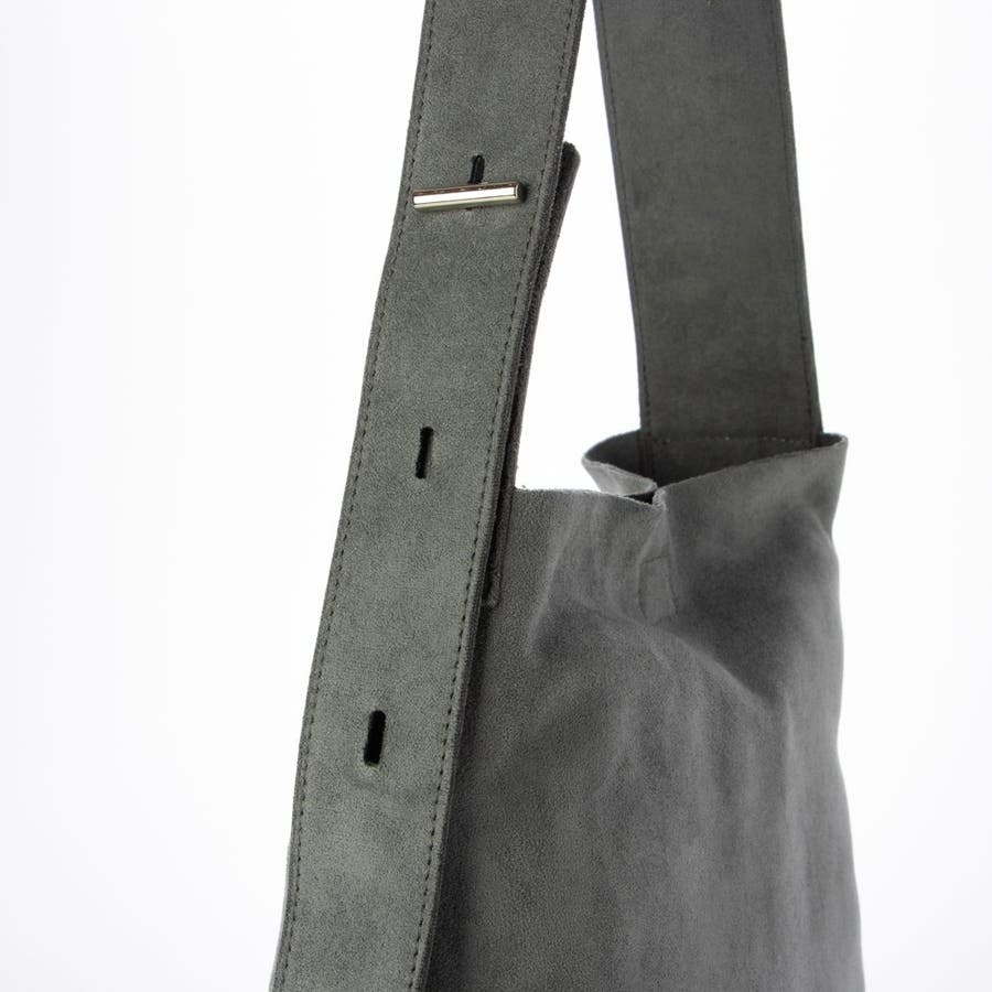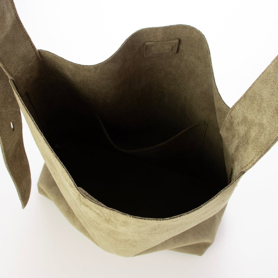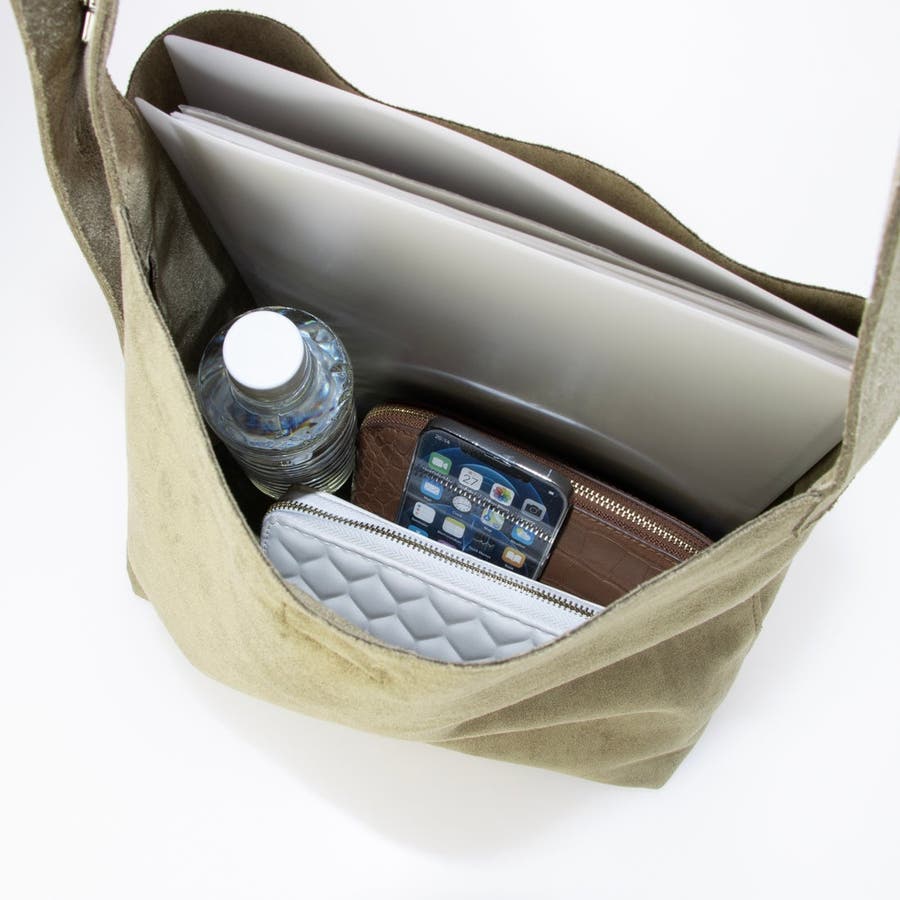 あえて裏地を付けない1枚仕立てが本革風で大人のカジュアルスタイルにおすすめしたいホーボーバッグです。