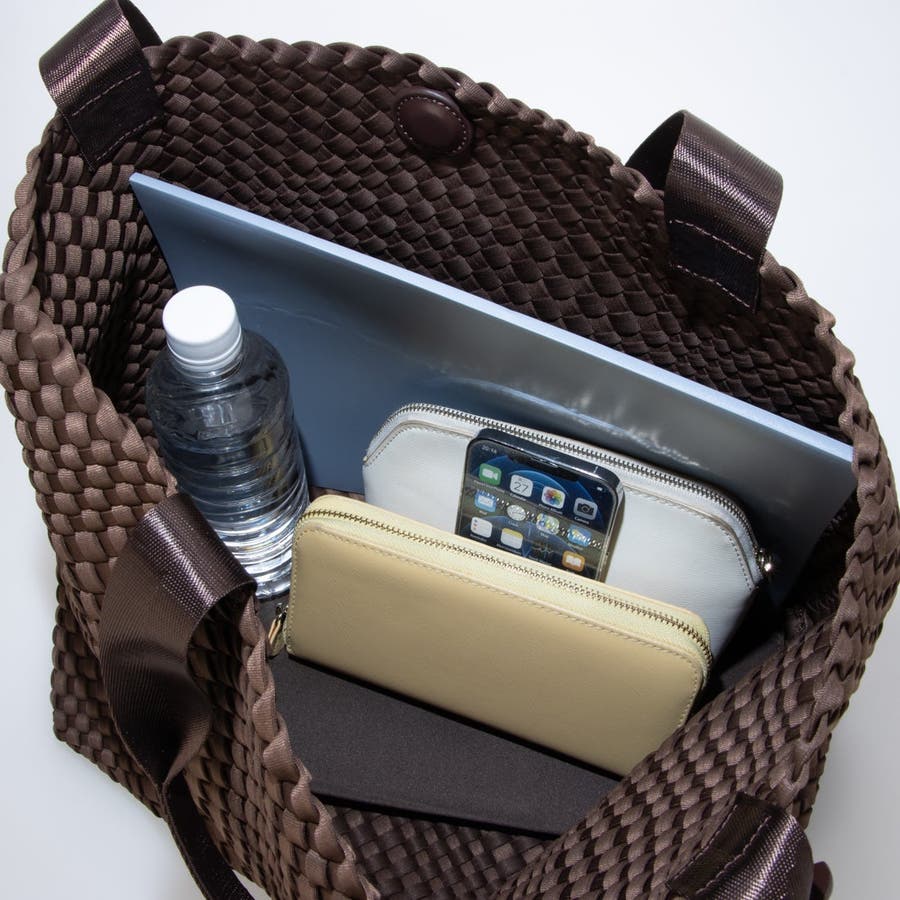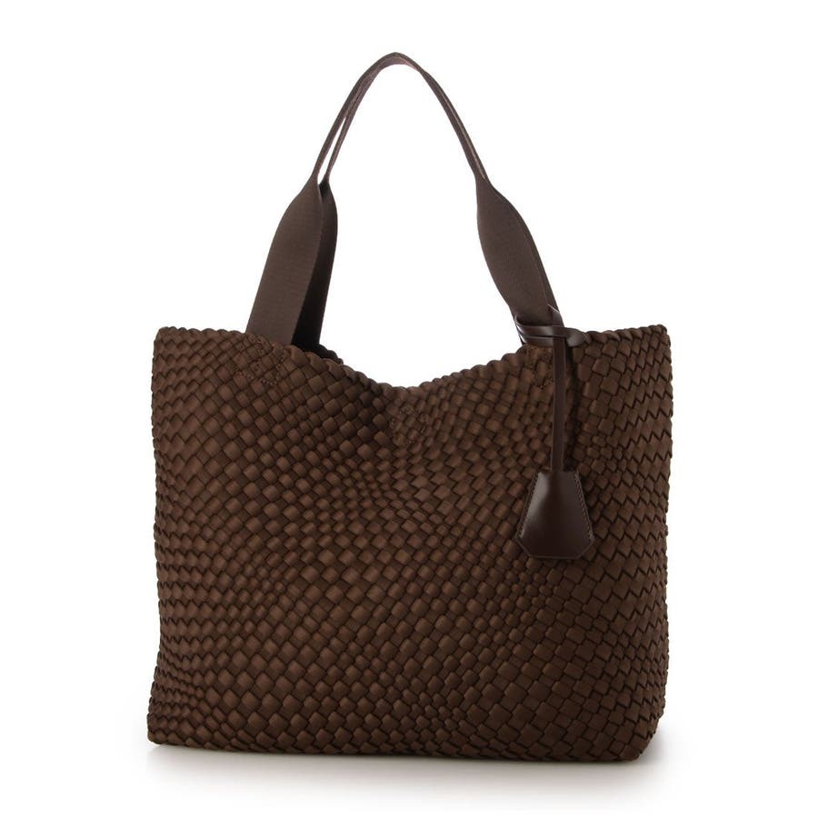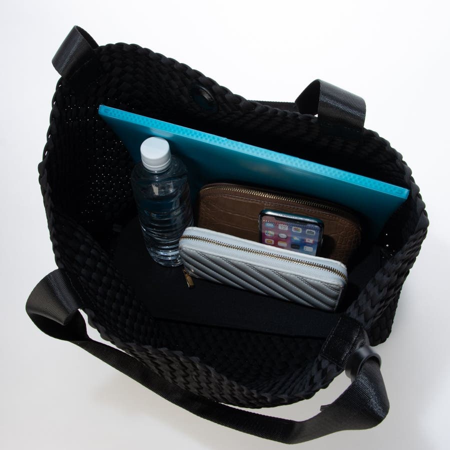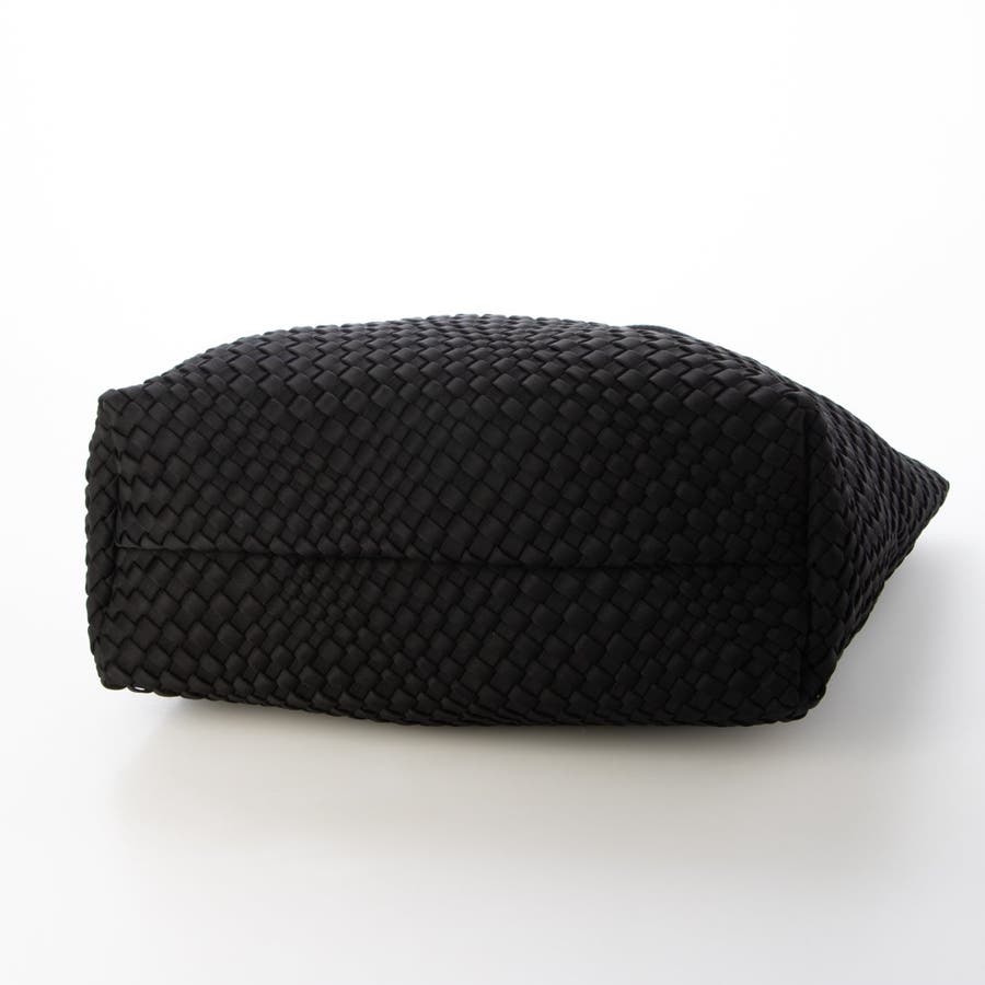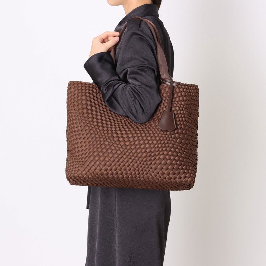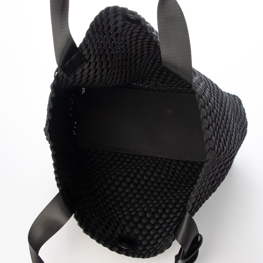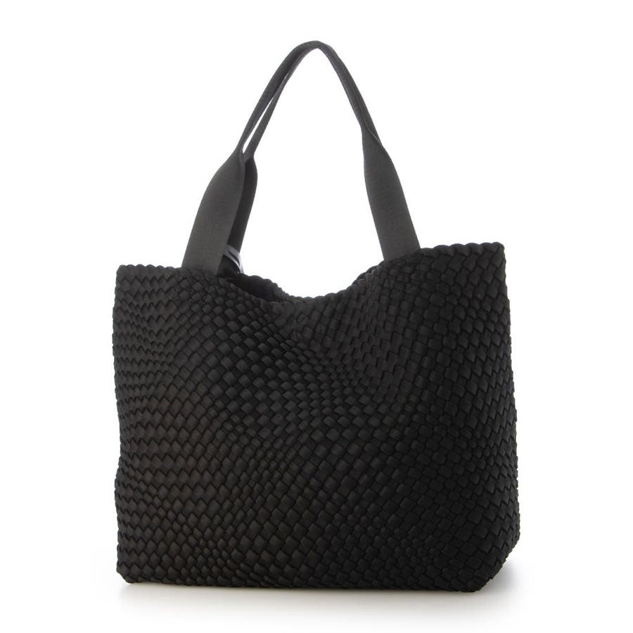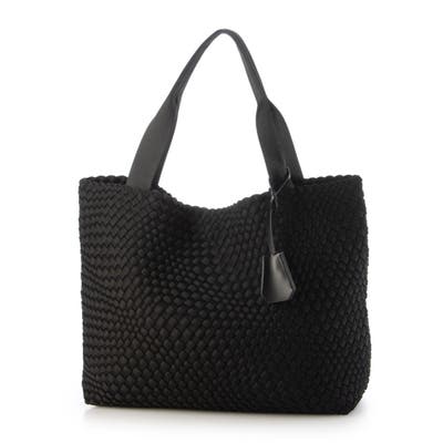 ウェットスーツ素材を使用した大人っぽくトレンド感のあるメッシュ編みトートバッグ。