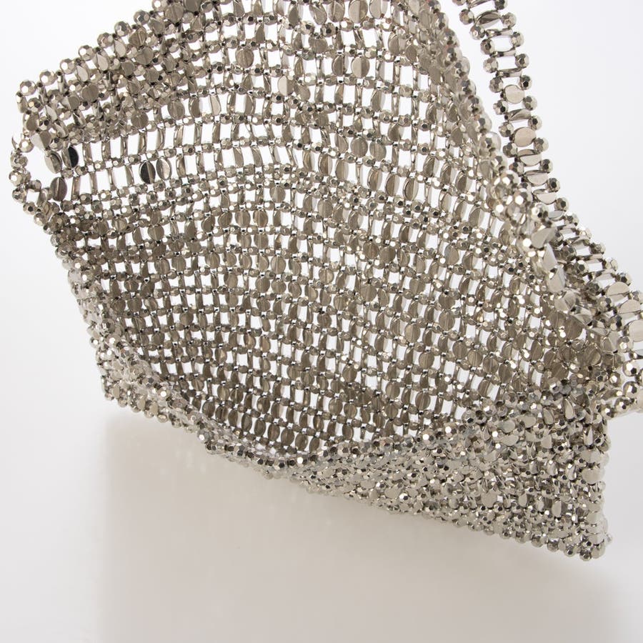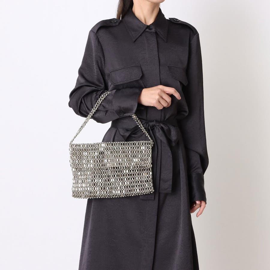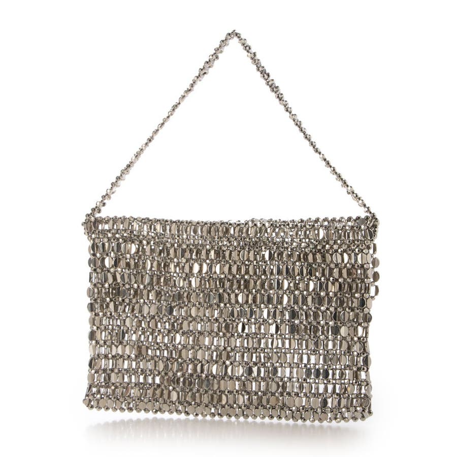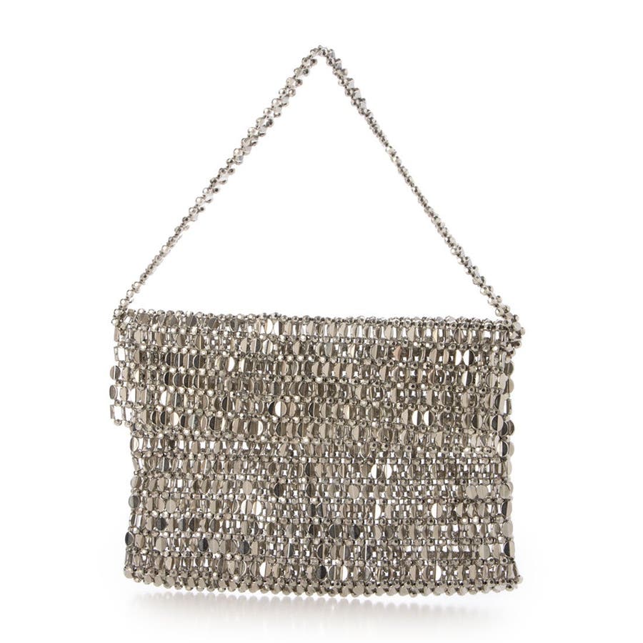 シルバーの楕円ビーズをひとつひとつ丁寧に編み込んだ、ほどよく華やかなフラップ付きハンドバッグ。