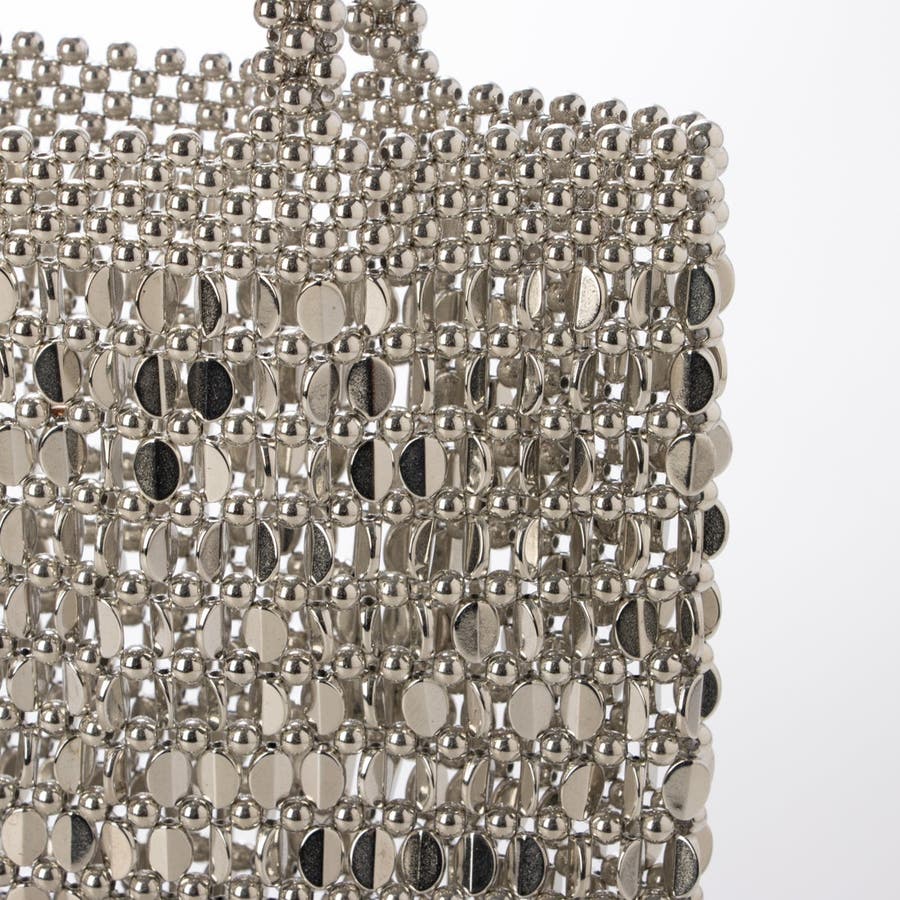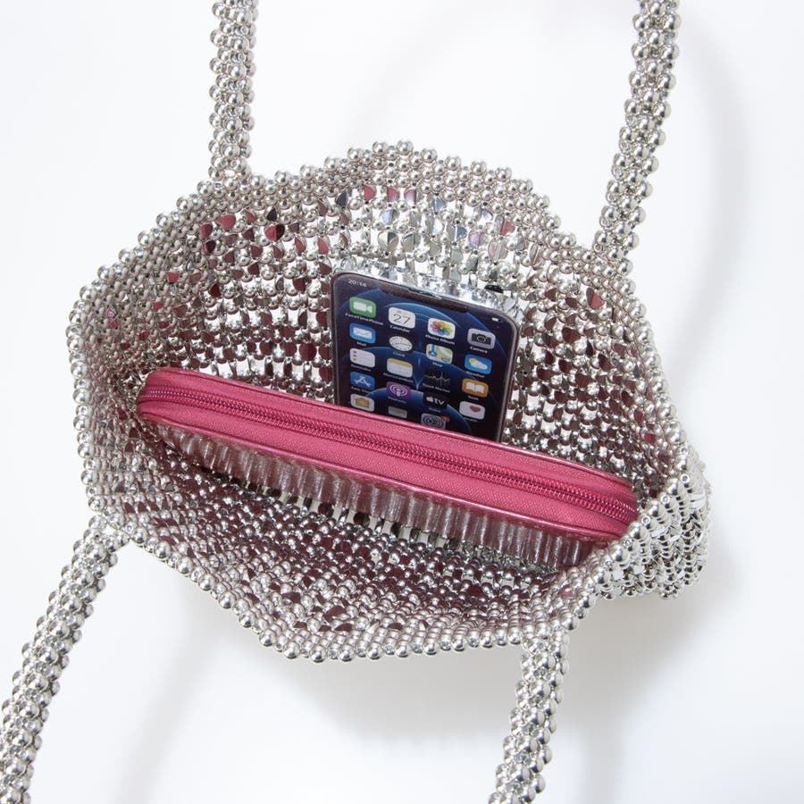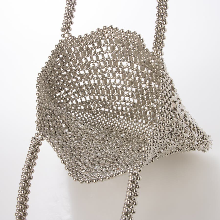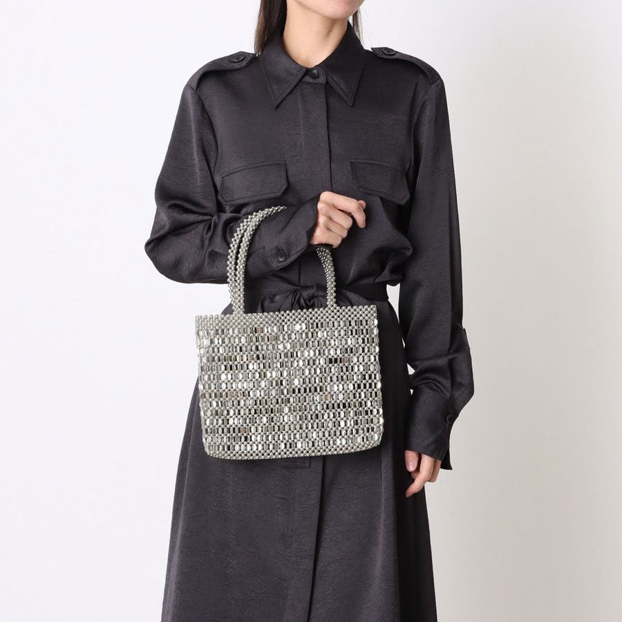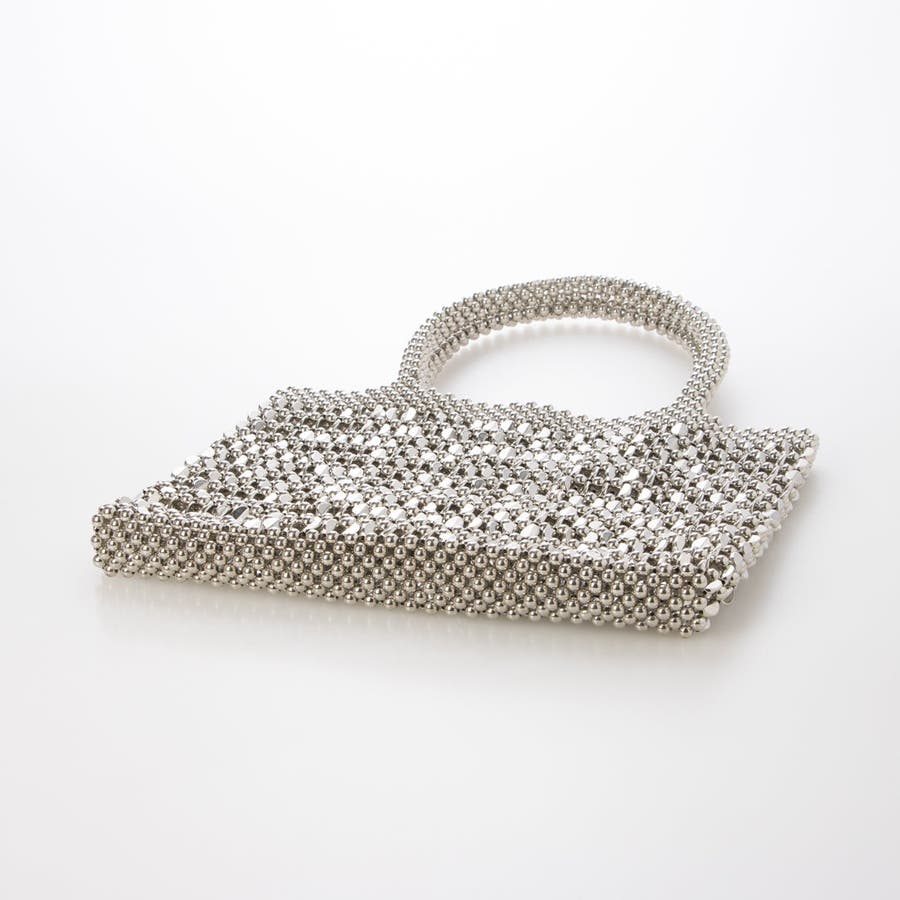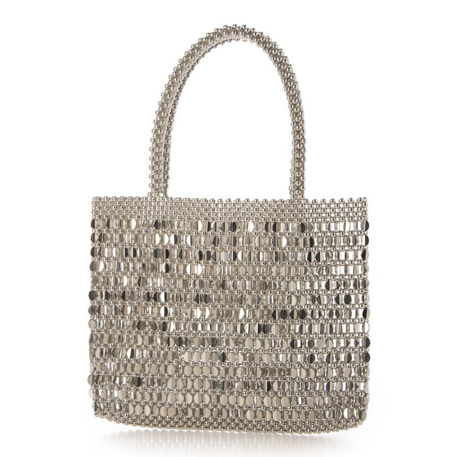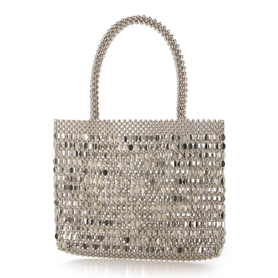 シルバーの楕円ビーズをひとつひとつ丁寧に編み込んだ、ほどよく華やかな手提げトート。