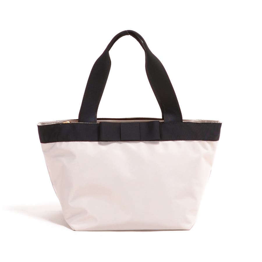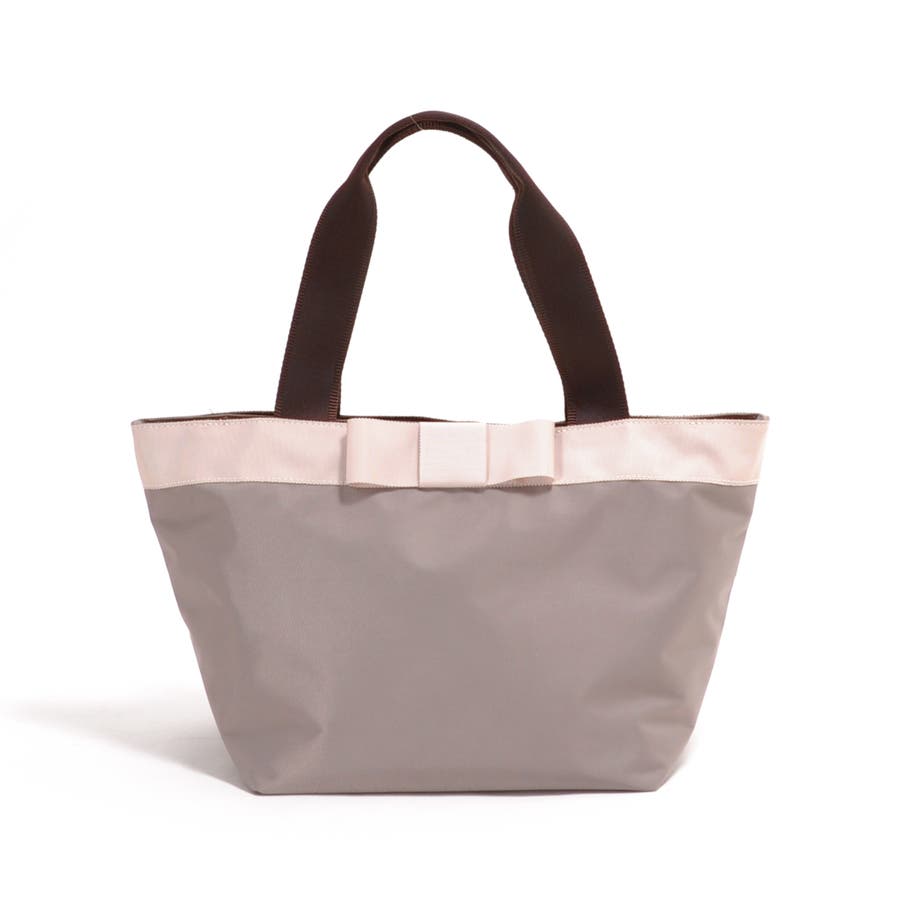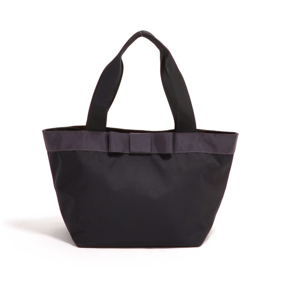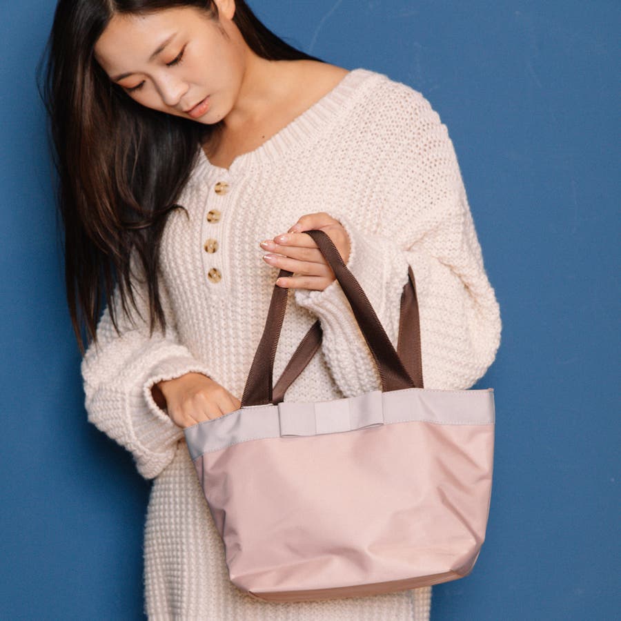 口元部分がリボンモチーフのバイカラーになったナイロントートバッグ。