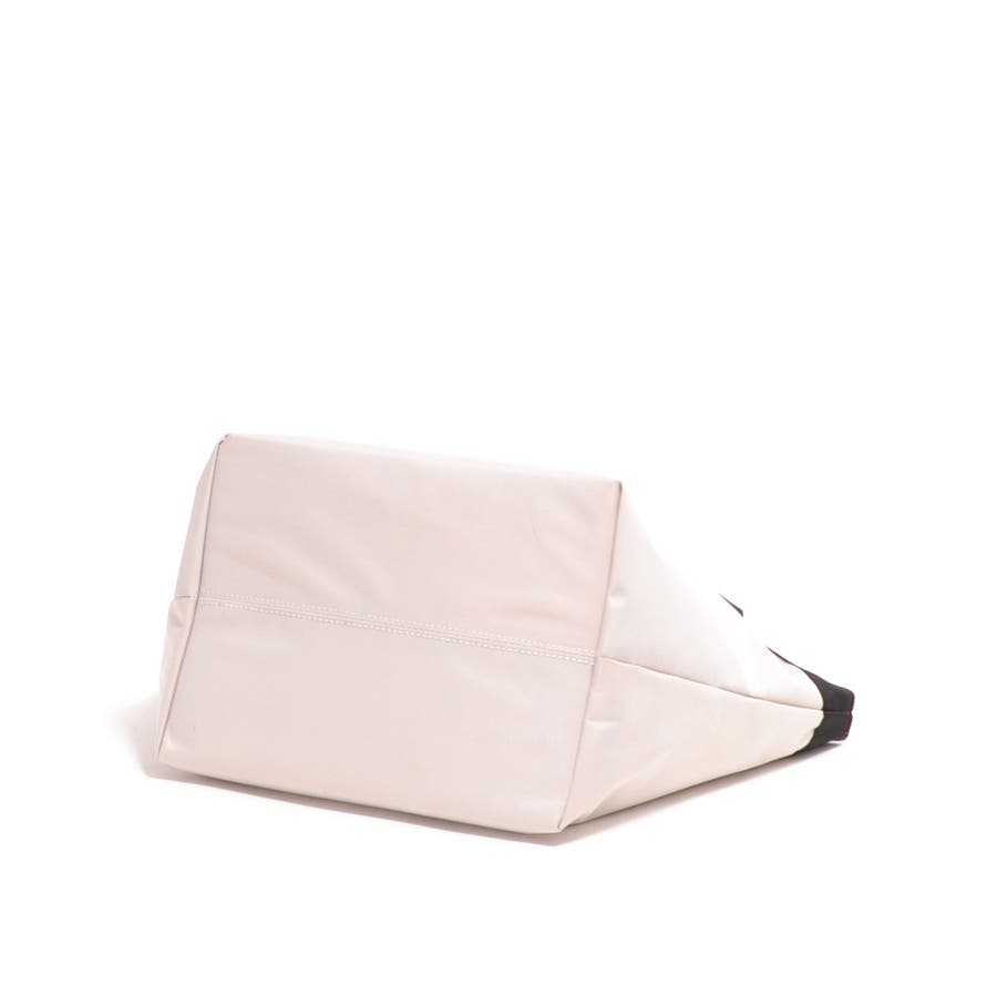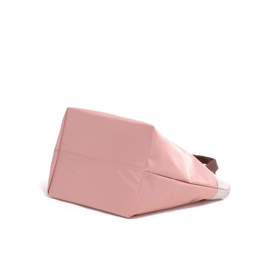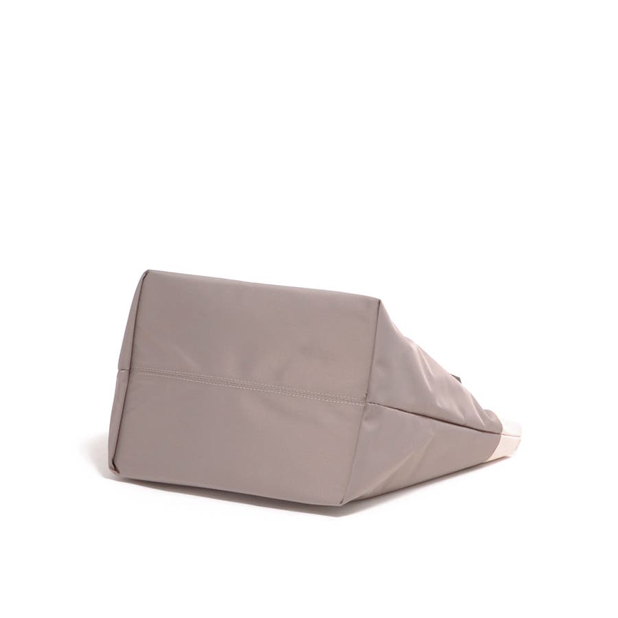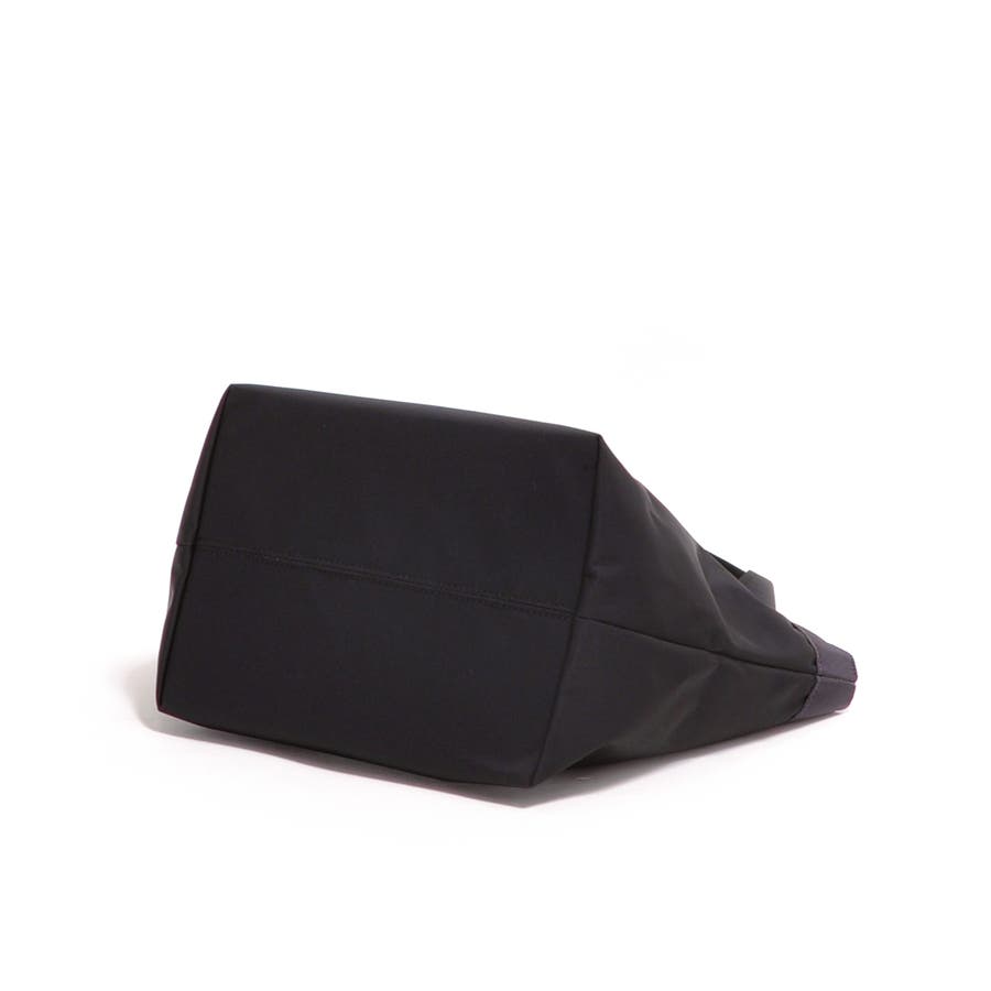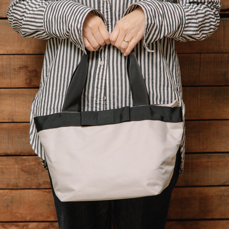 口元部分がリボンモチーフのバイカラーになったナイロントートバッグ。