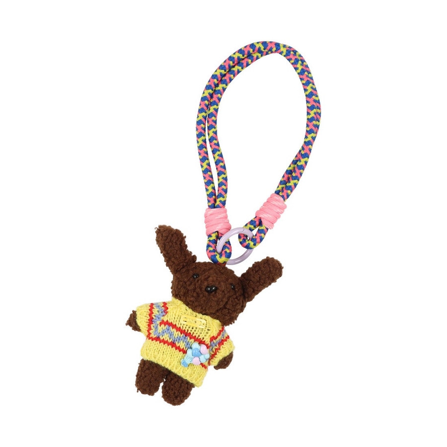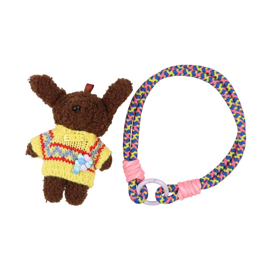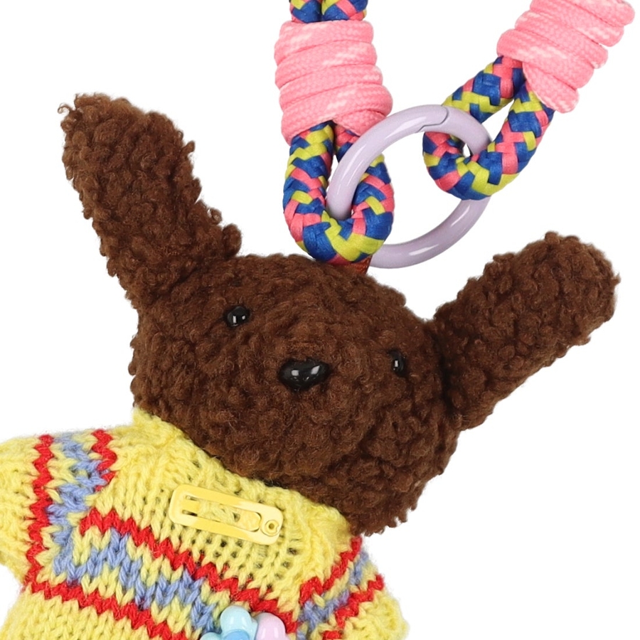 かわいらしいクマのぬいぐるみとカラフルなロープハンドルを組み合わせたバッグチャーム。