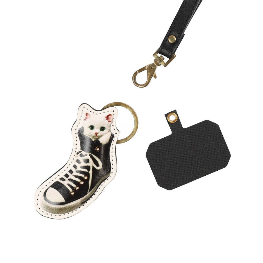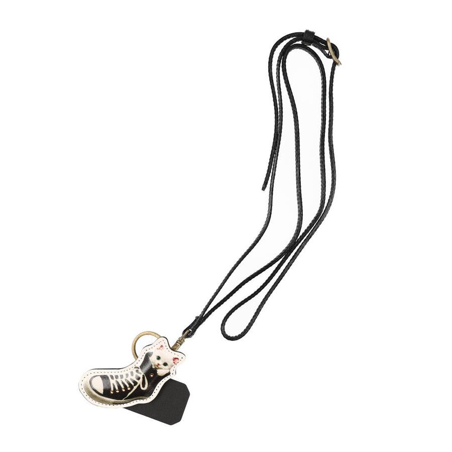 スニーカーをモチーフに、猫がひょっこり顔を出したチャーミングなデザインを牛革にプリントしチャームに仕立てました。