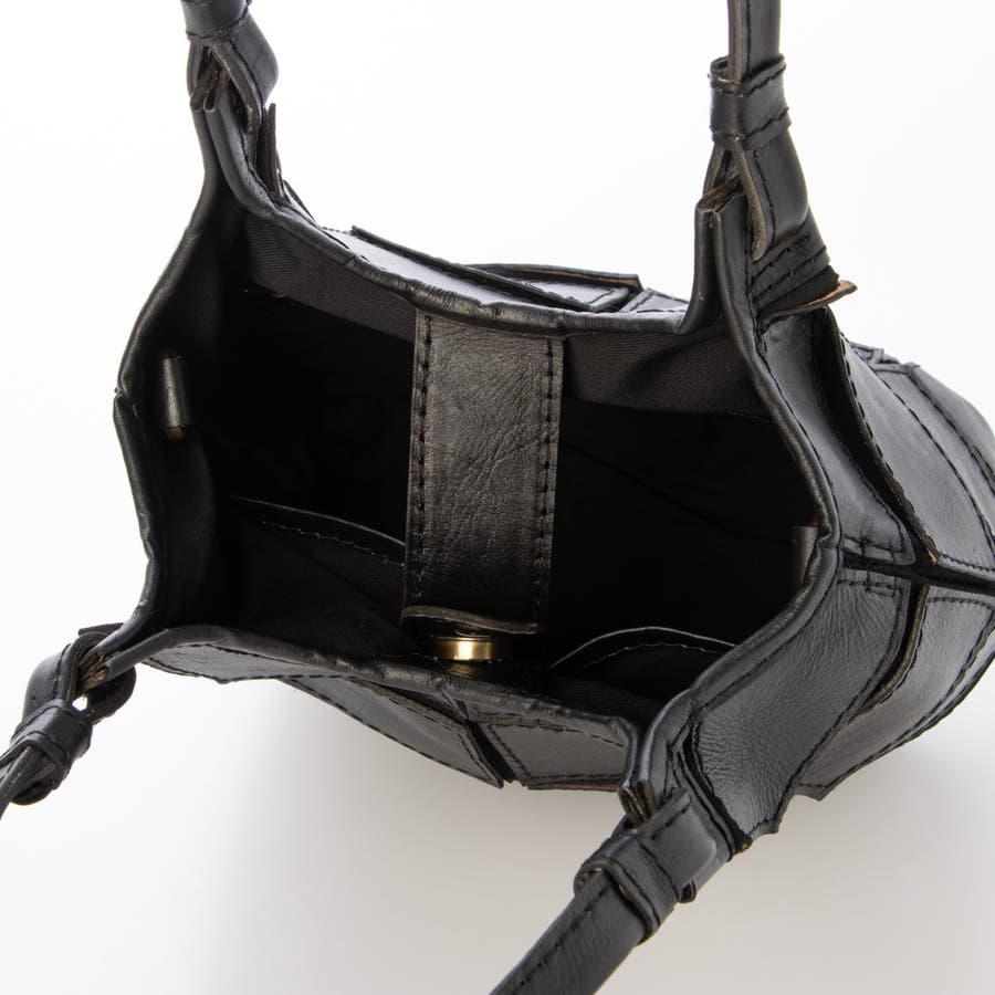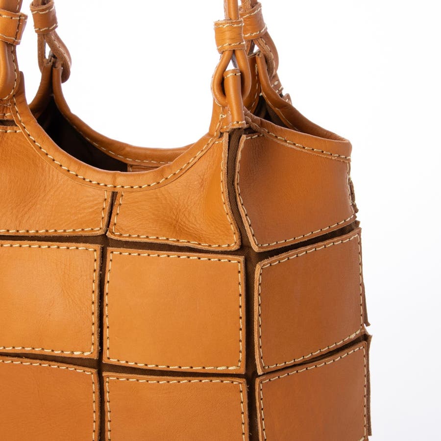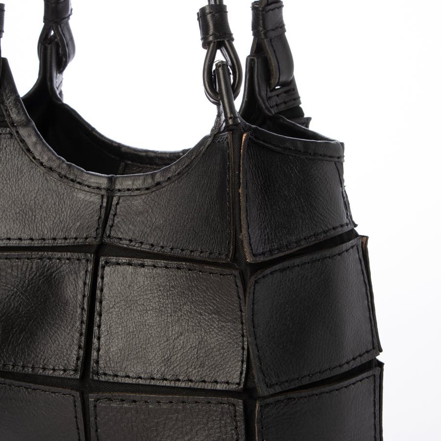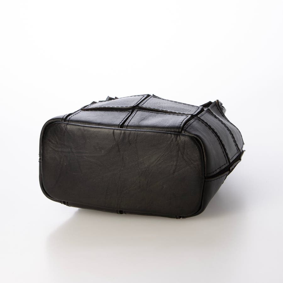 四角くカットされたレザーパーツを丁寧にパッチワーク状に縫製をした、素朴でありながらも洗練された表情のバッグです。