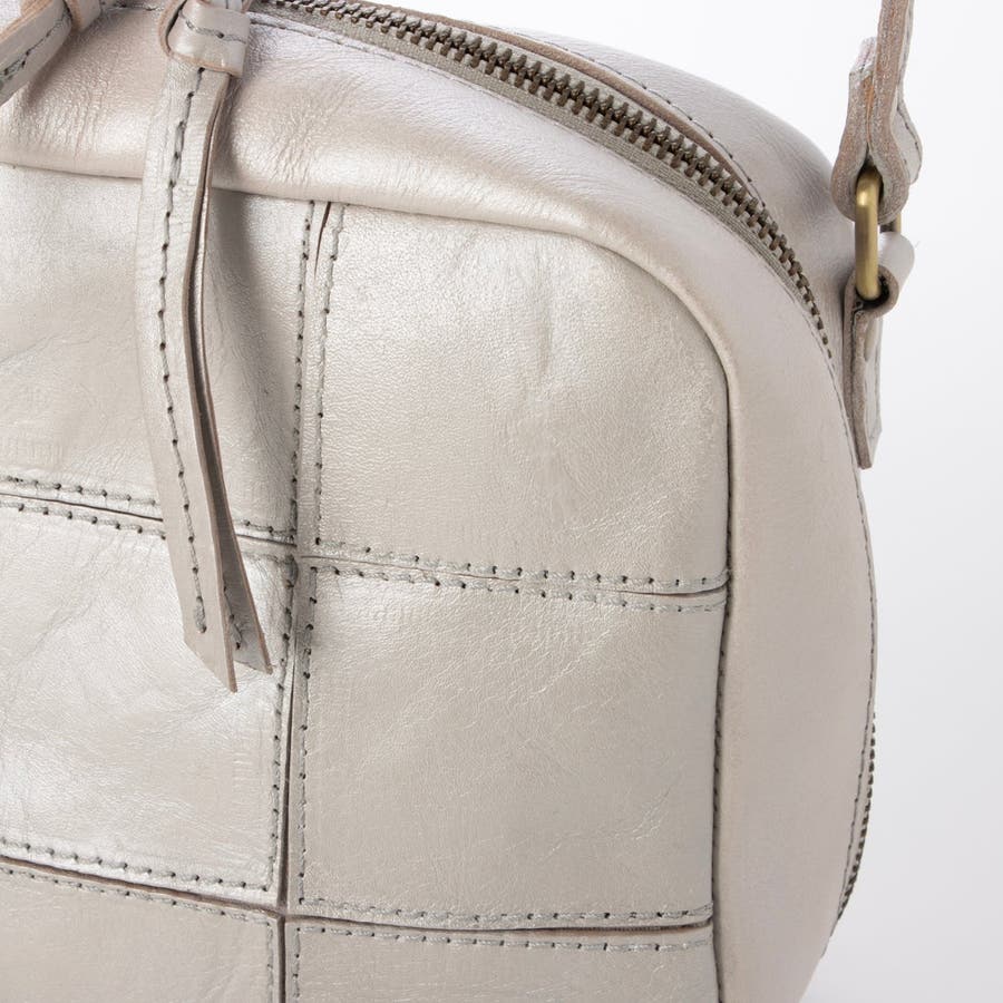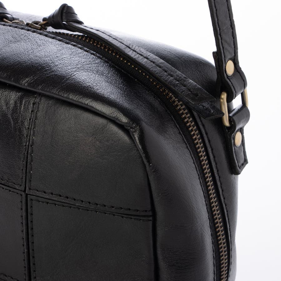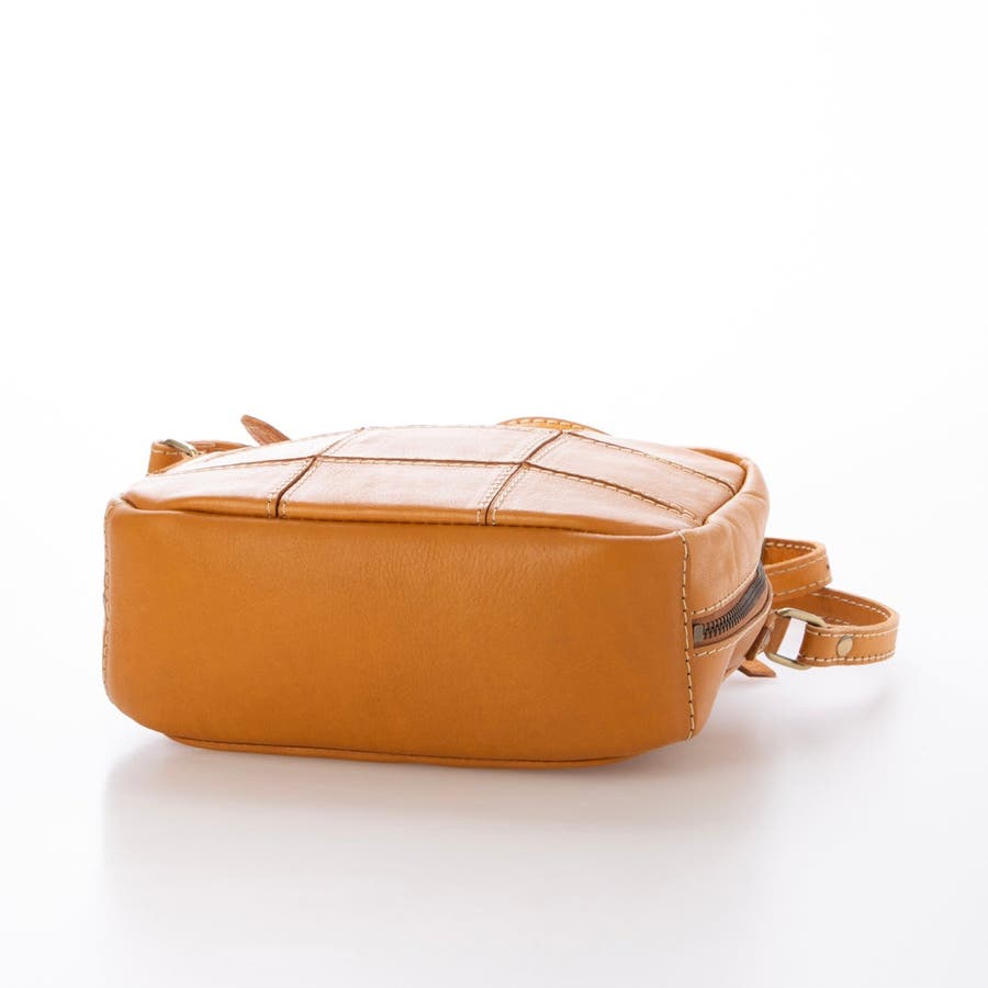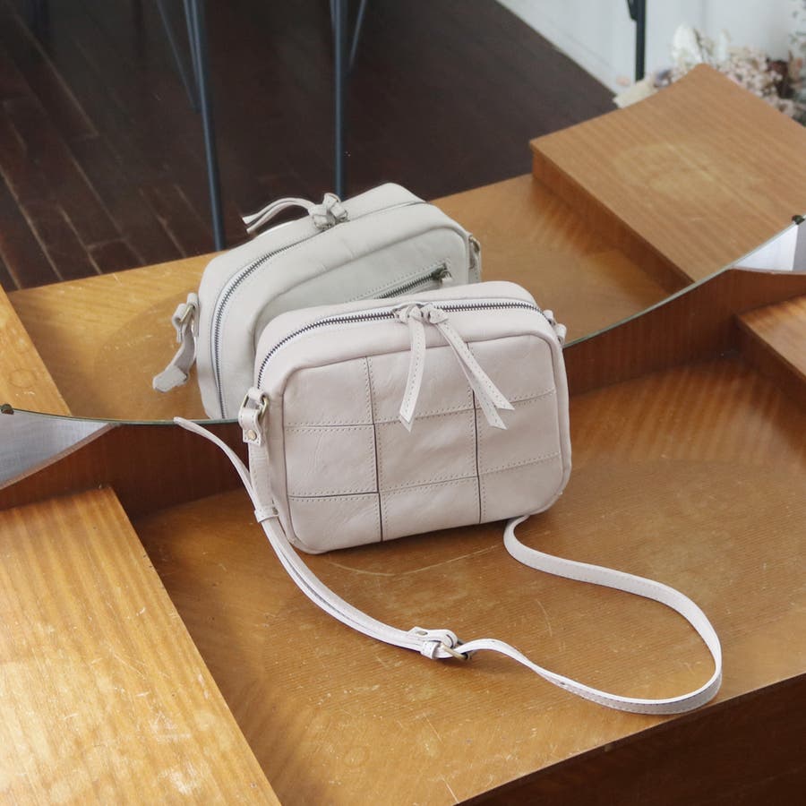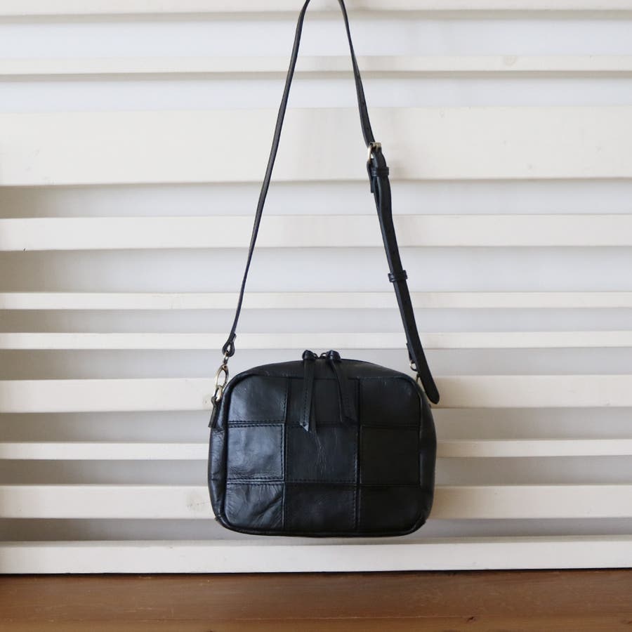 四角くカットされたレザーパーツを丁寧にパッチワーク状に縫製をした、素朴でありながらも洗練された表情のバッグです。