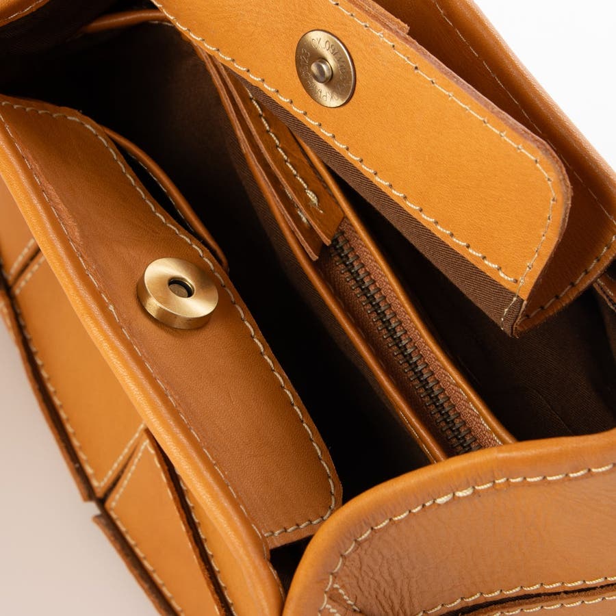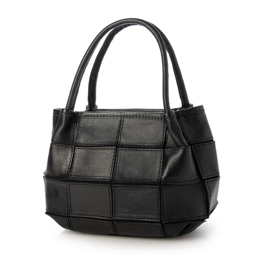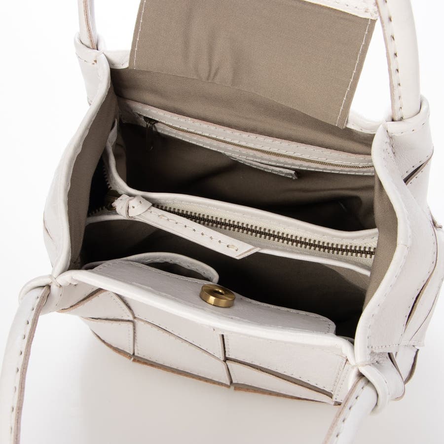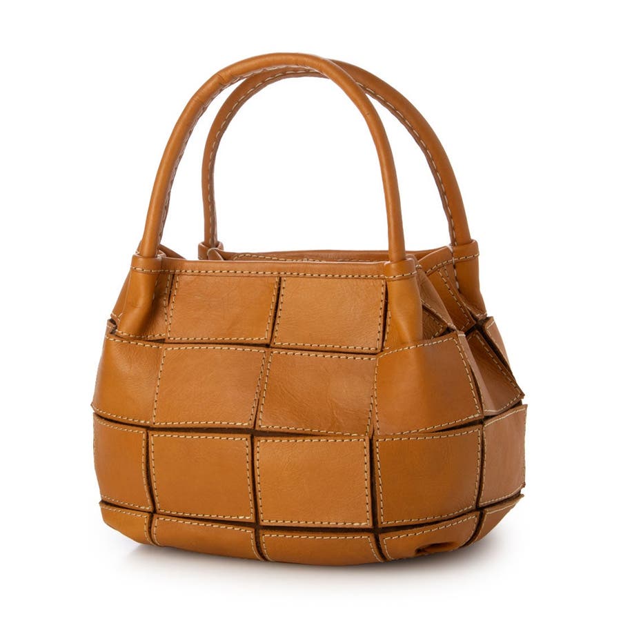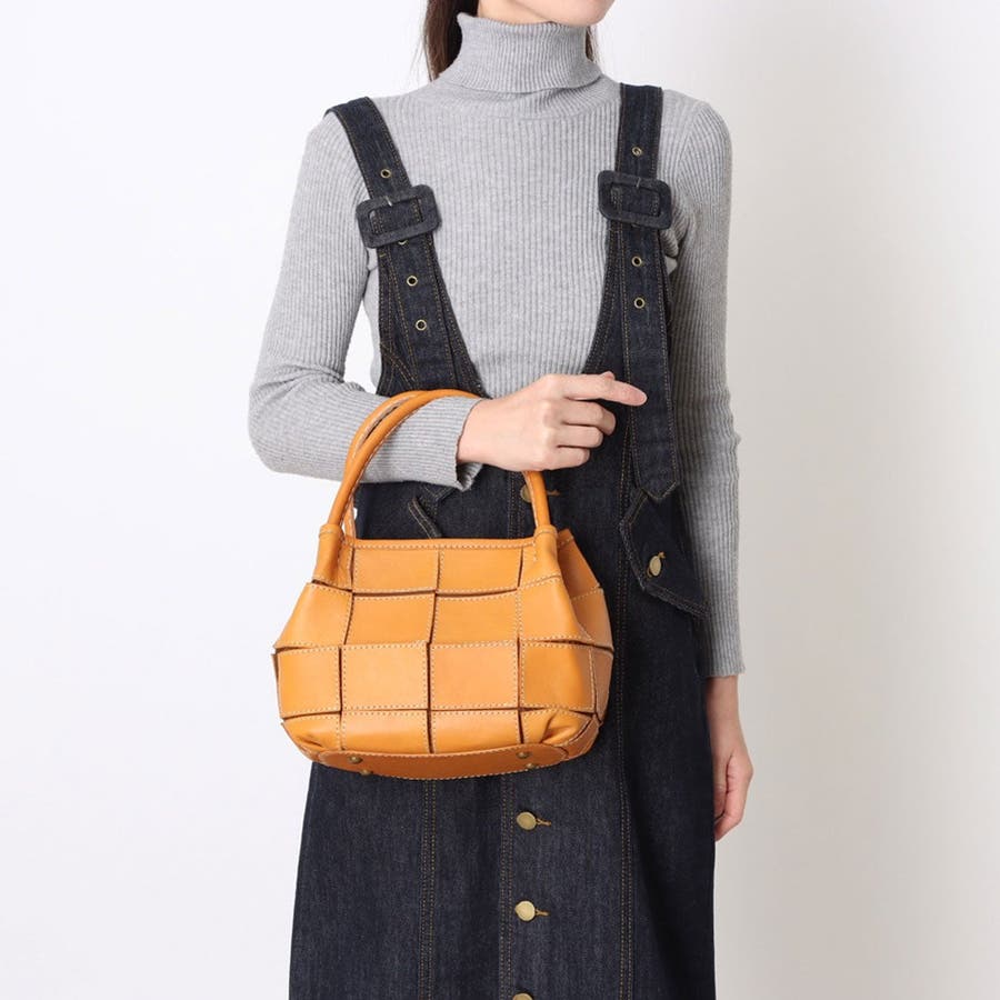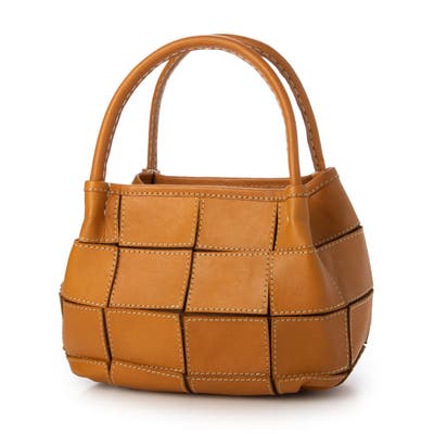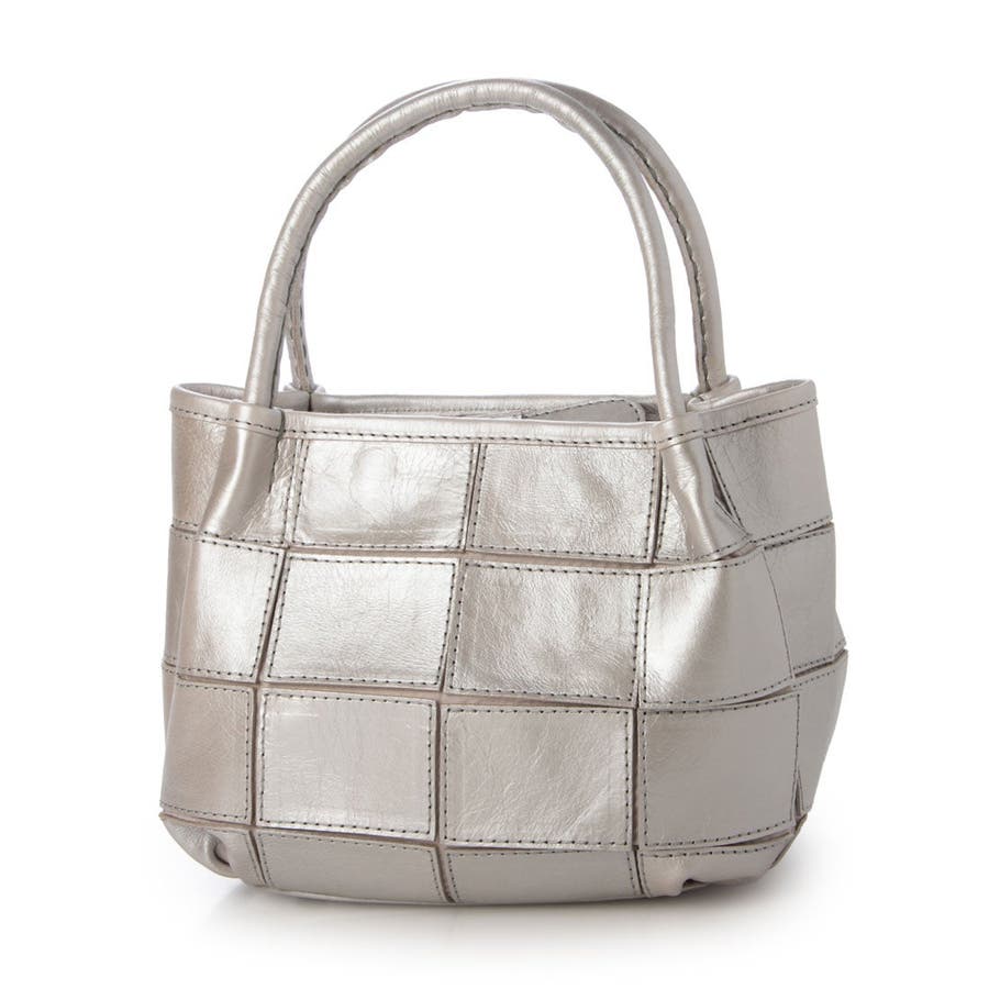 四角くカットされたレザーパーツを丁寧にパッチワーク状に縫製をした、素朴でありながらも洗練された表情のバッグです。