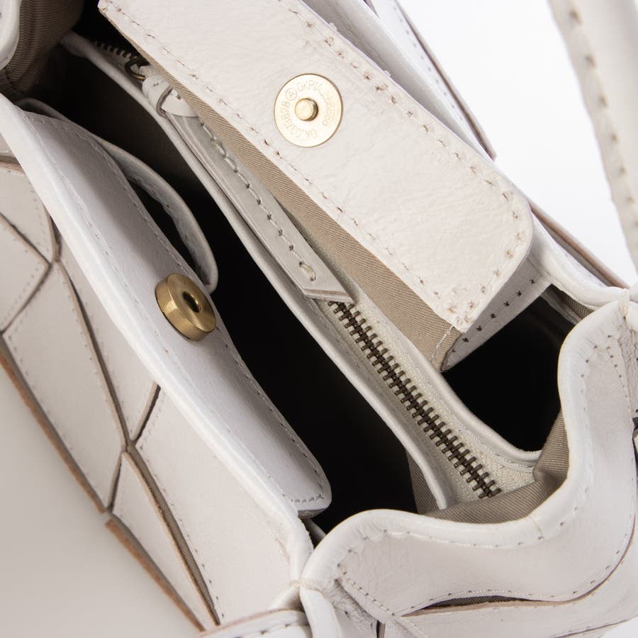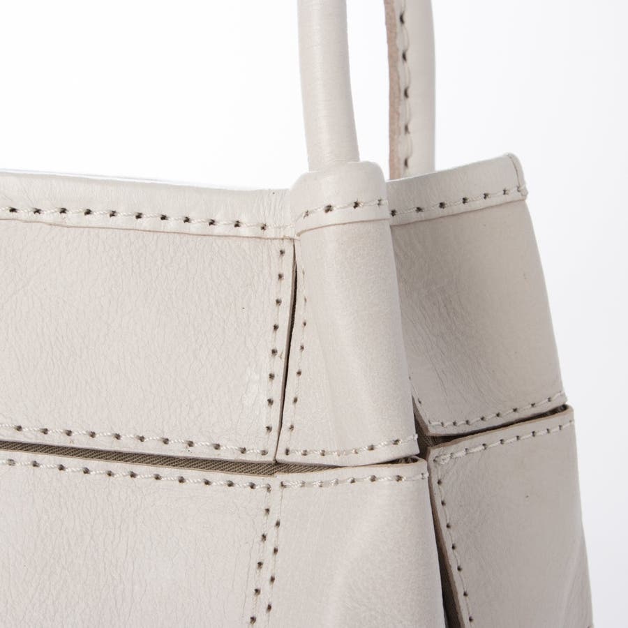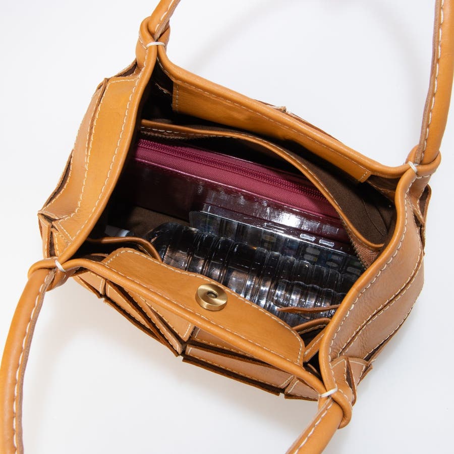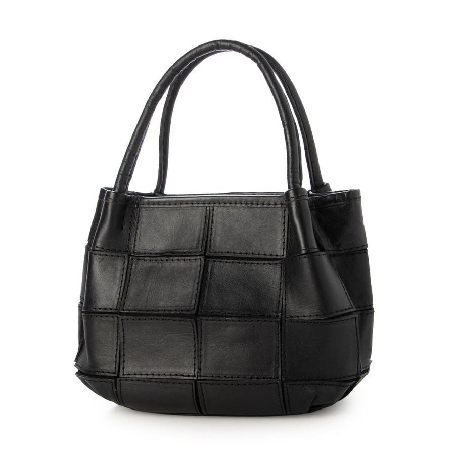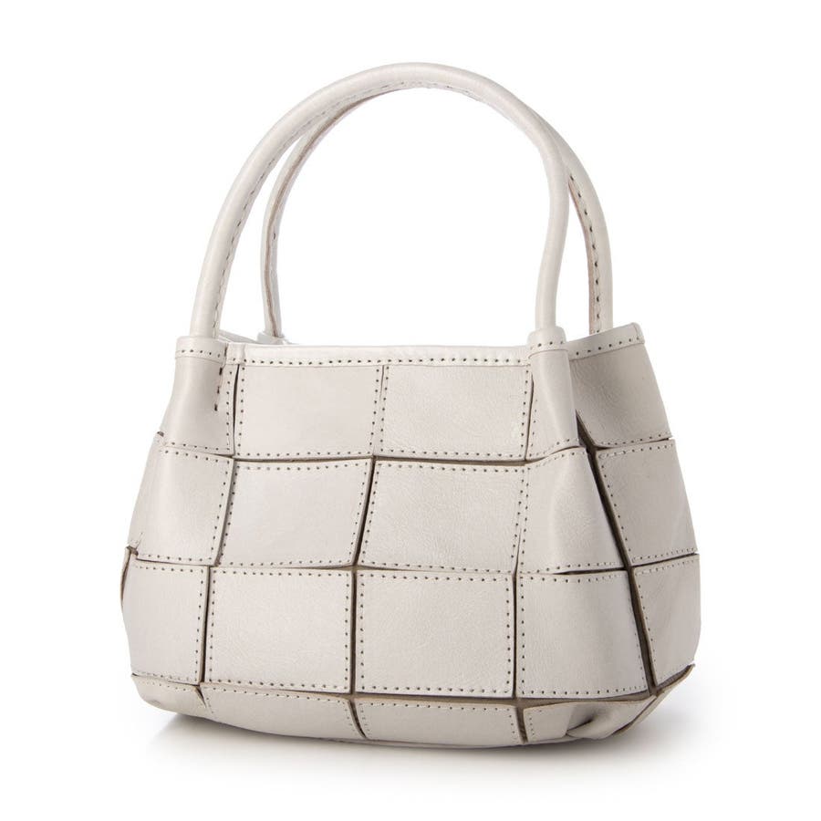 四角くカットされたレザーパーツを丁寧にパッチワーク状に縫製をした、素朴でありながらも洗練された表情のバッグです。