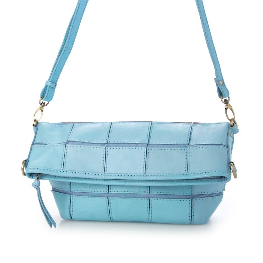 四角くカットされたレザーパーツを丁寧にパッチワーク状に縫製をした、素朴でありながらも洗練された表情のバッグです。