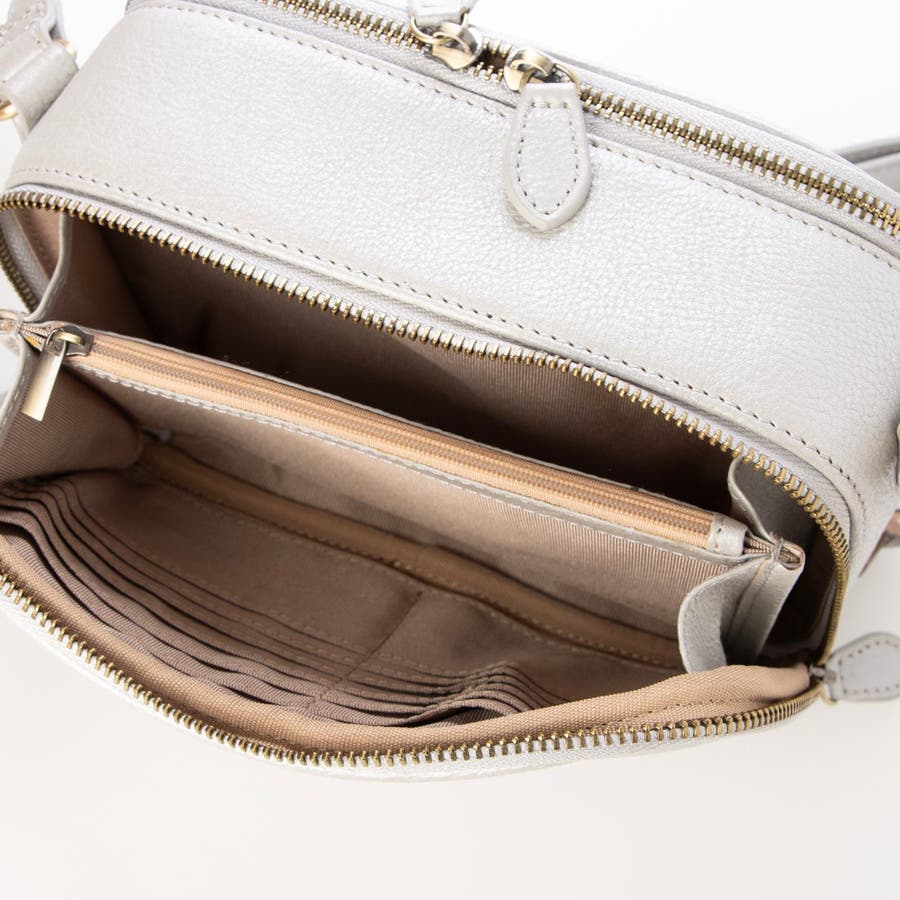 両サイドまで大きく開くファスナーを開けるとファスナー付きポケットで仕切られた2層のつくり