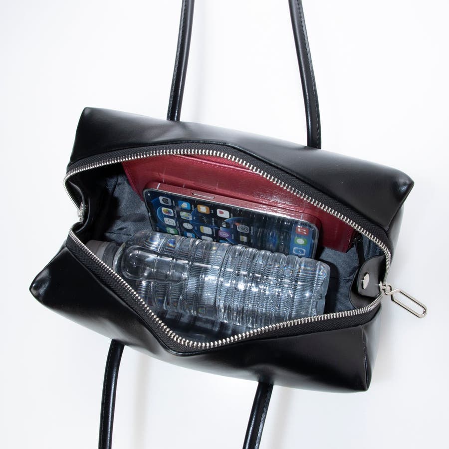 ファスナーはサイドまで大きく開き、長財布や500mlボトルが入る使い勝手の良いハンドバッグです。