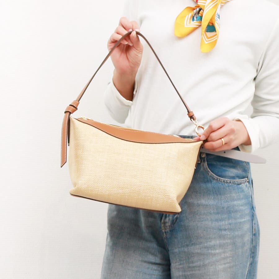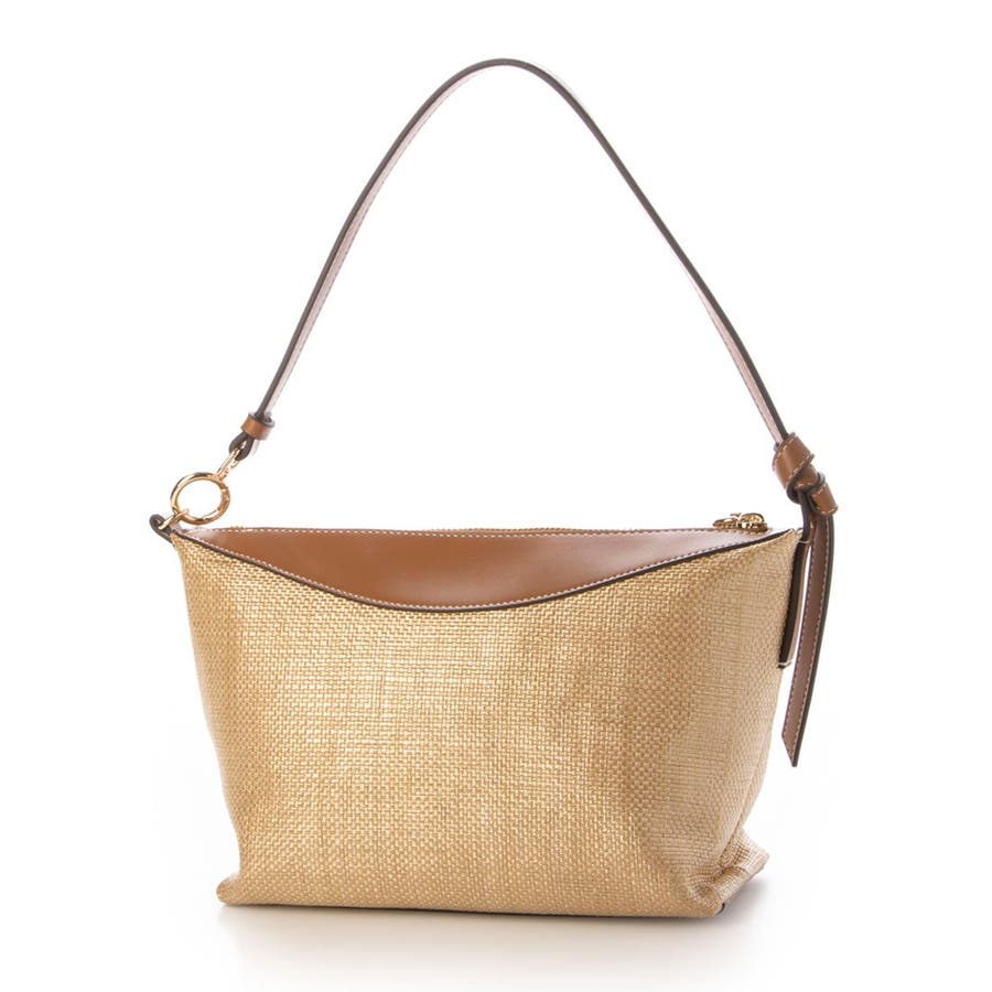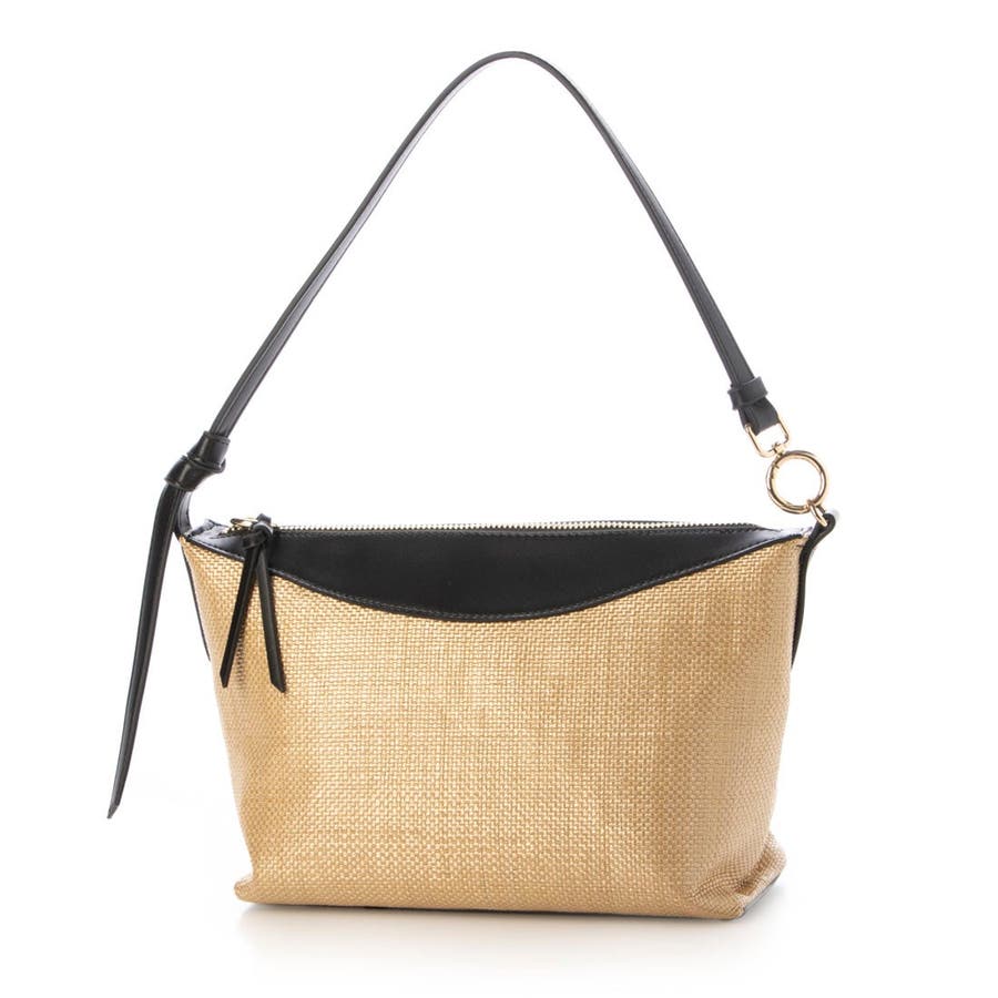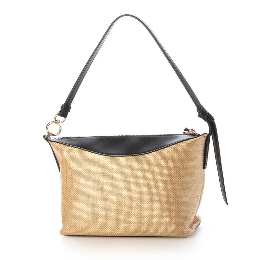 片側に垂らした結び目ハンドルやリング金具がきれいめな雰囲気です。