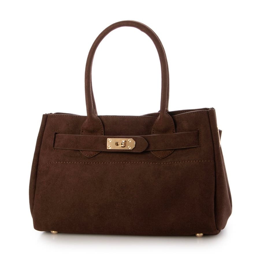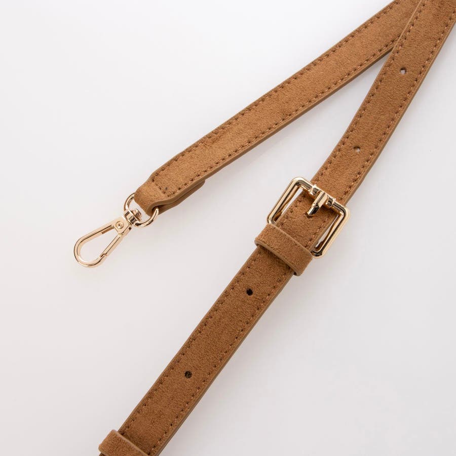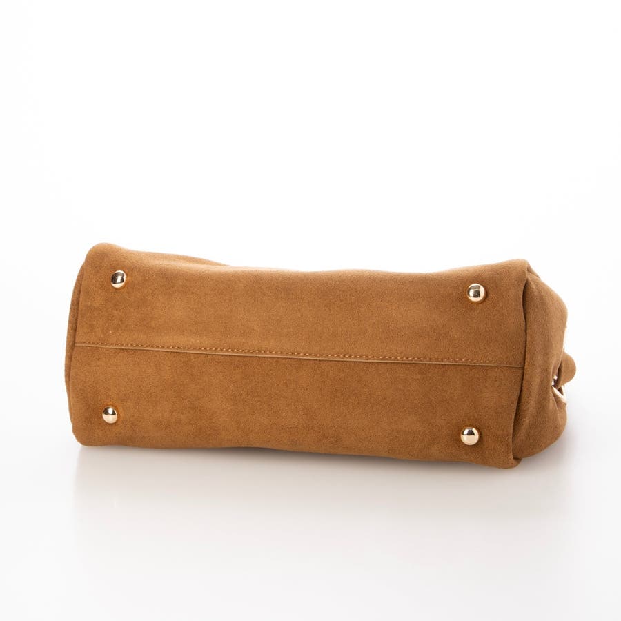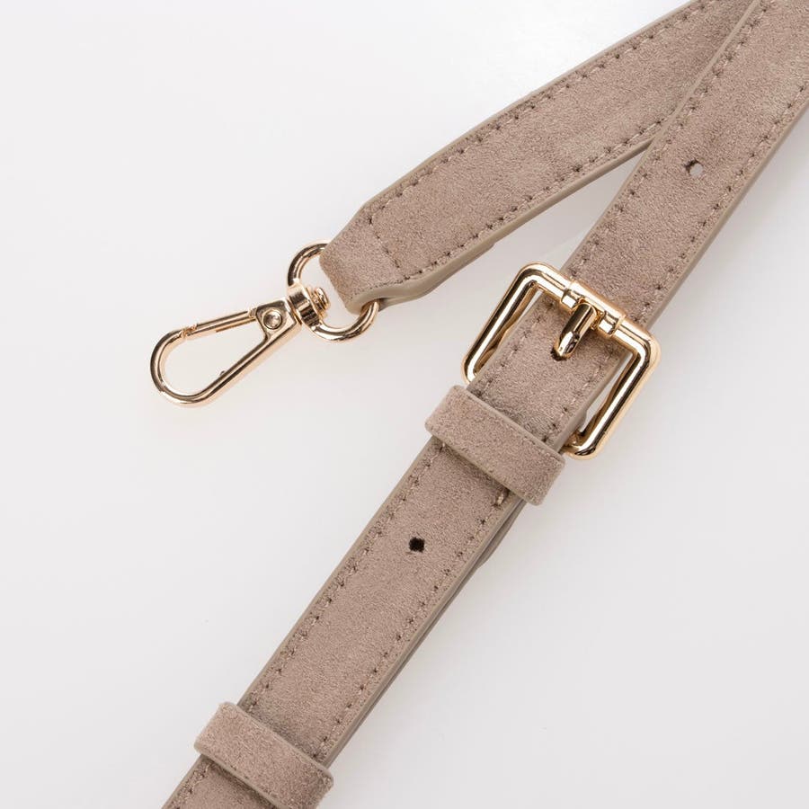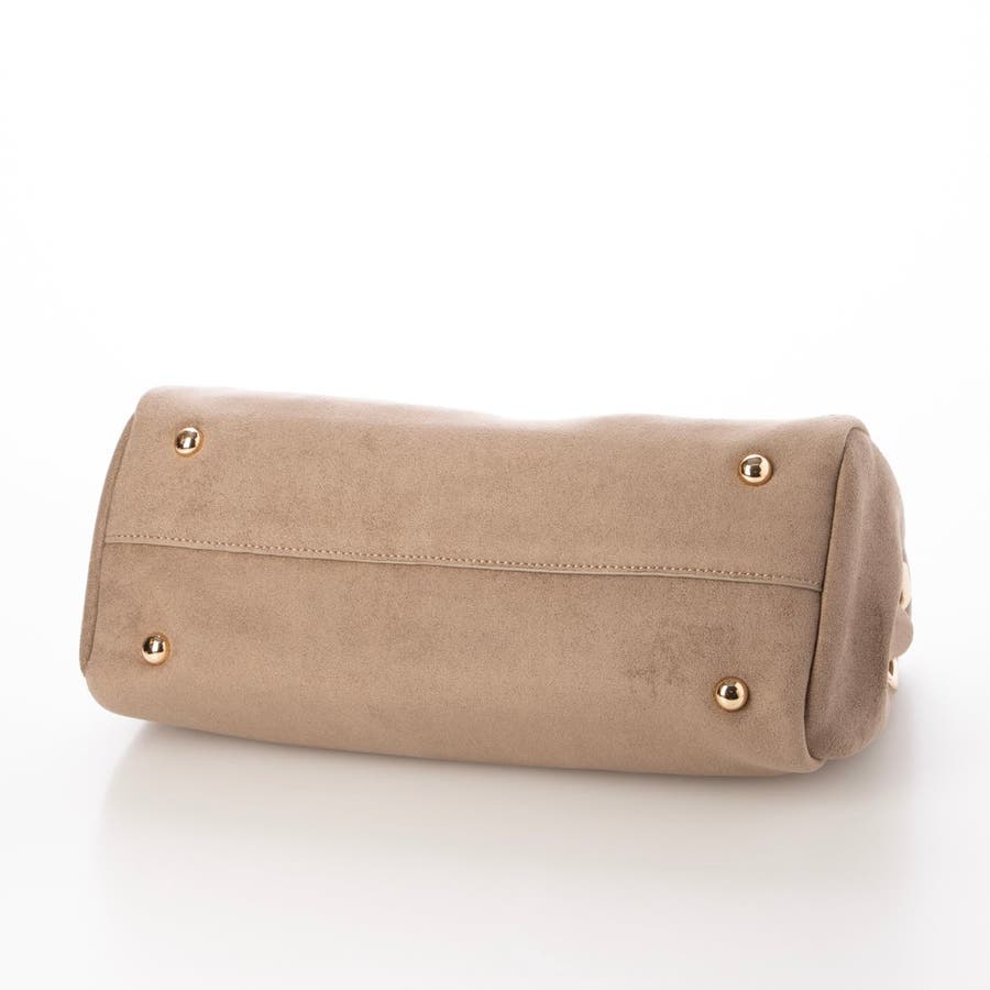 柔らかな風合いのフェイクスエードにゴールドパーツをあしらった高級感のあるデザインで、大人の装いにぴったりです。