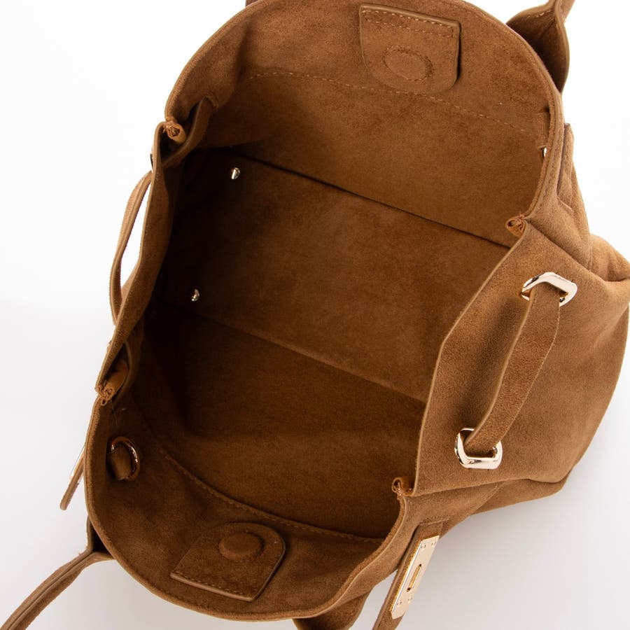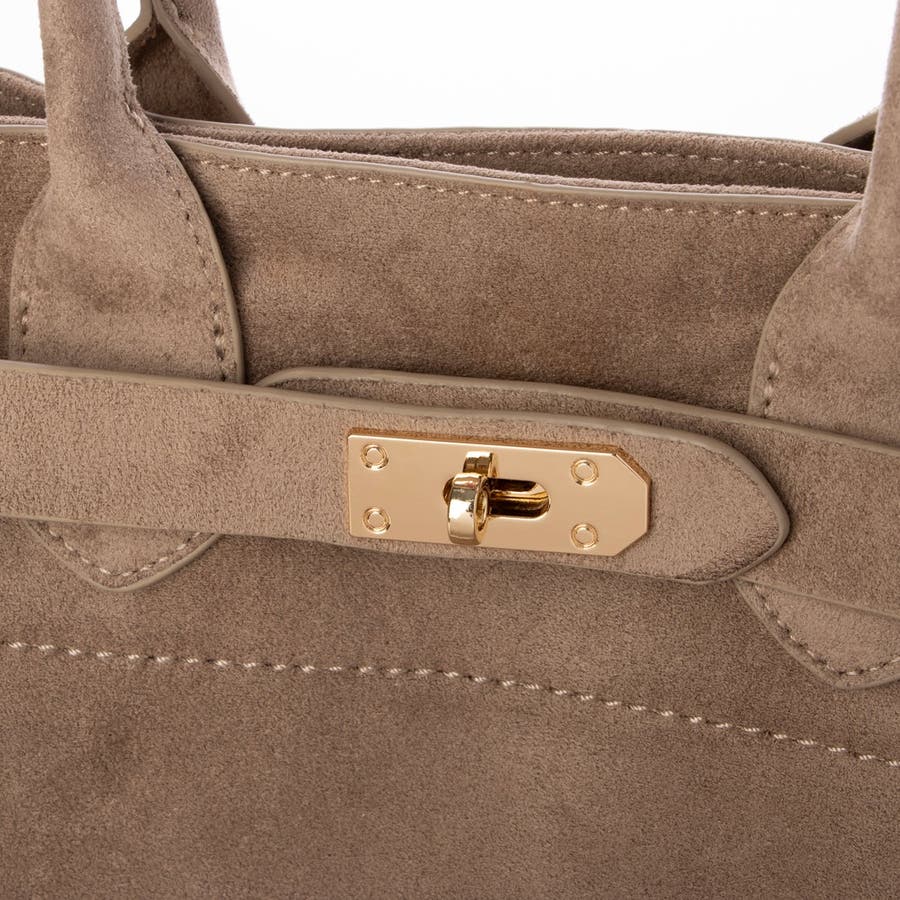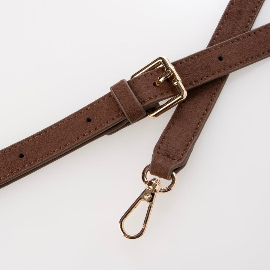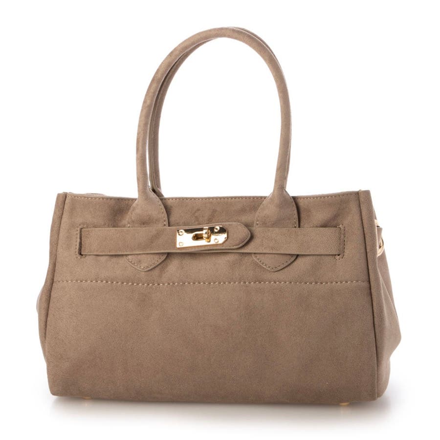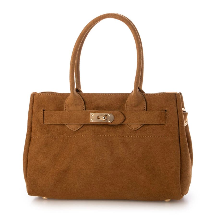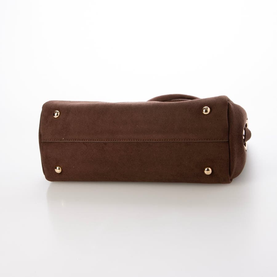 柔らかな風合いのフェイクスエードにゴールドパーツをあしらった高級感のあるデザインで、大人の装いにぴったりです。