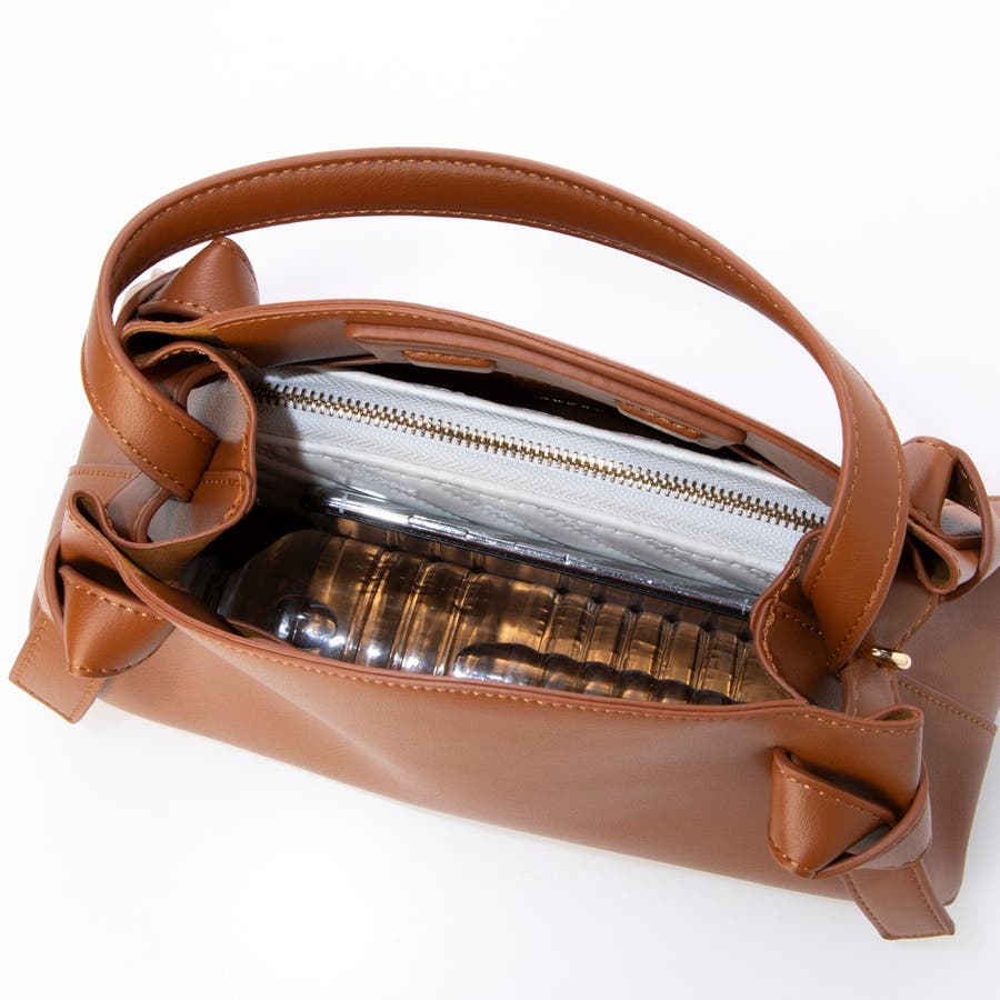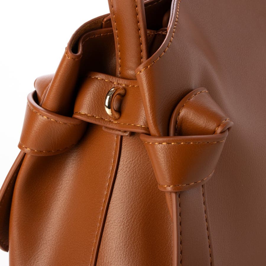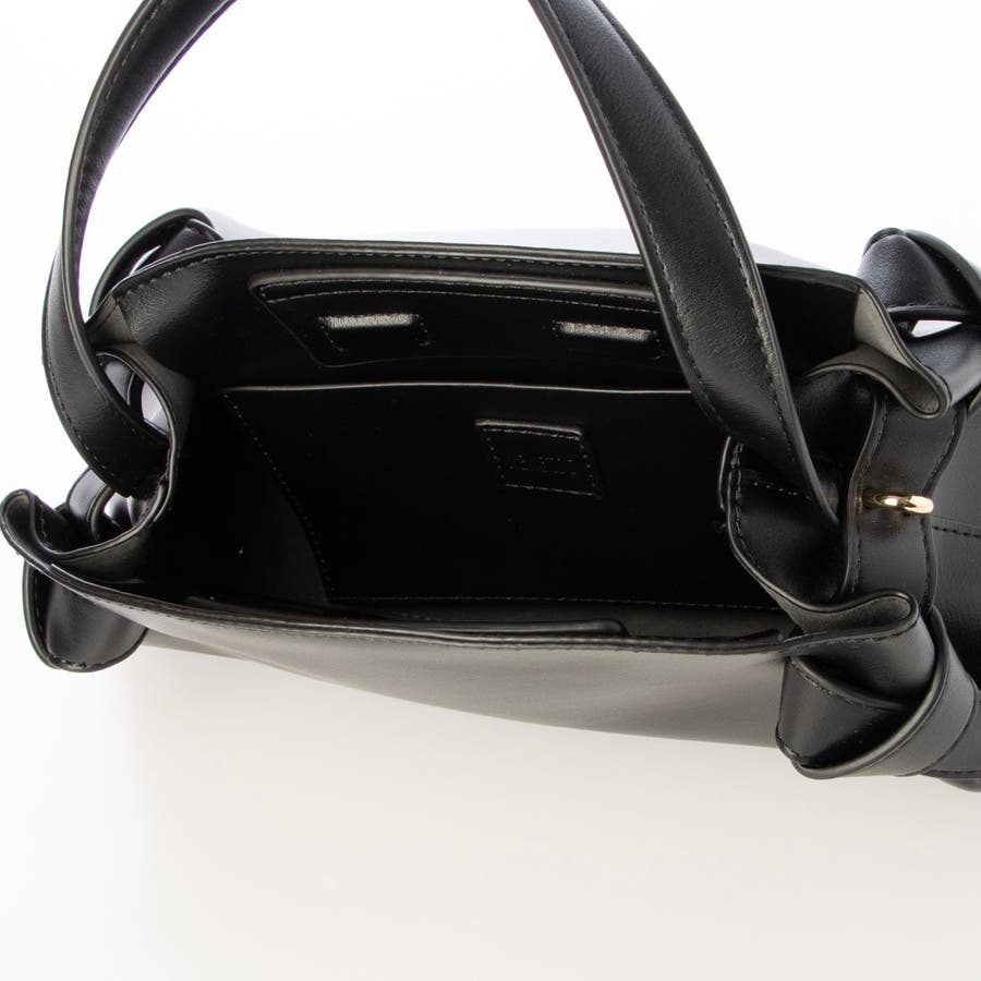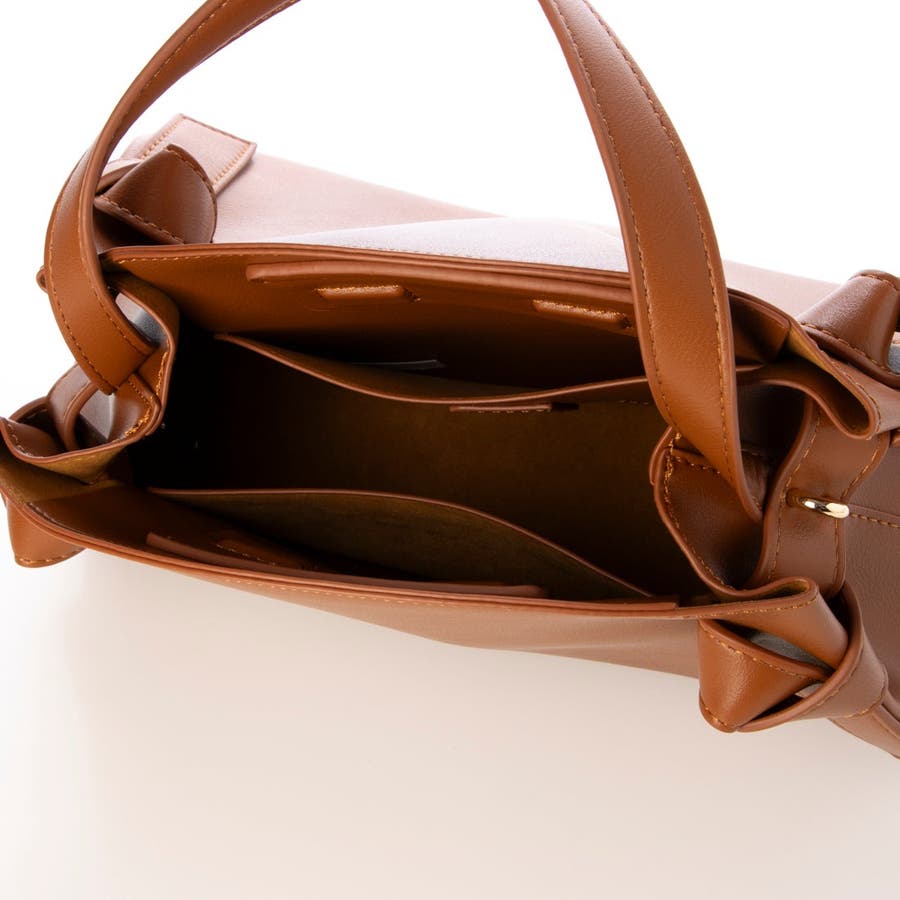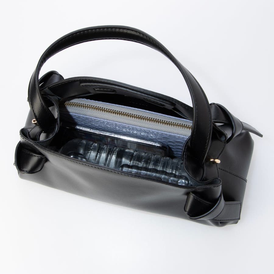 両サイドのリボンモチーフがデザインポイントのハンドバッグ。