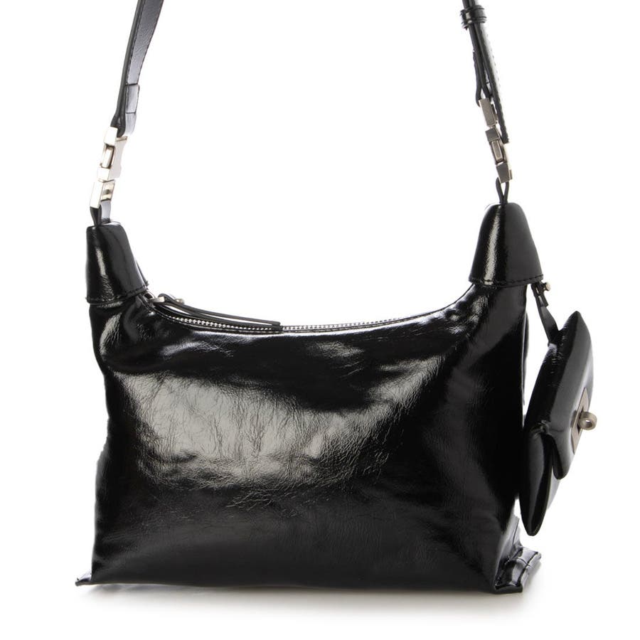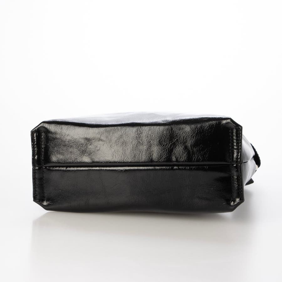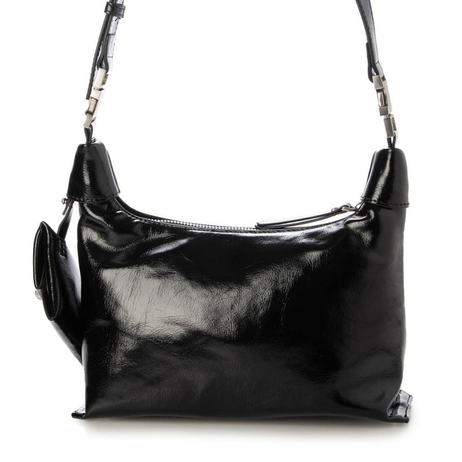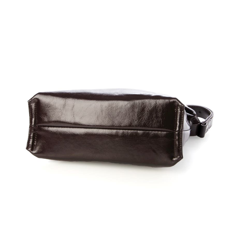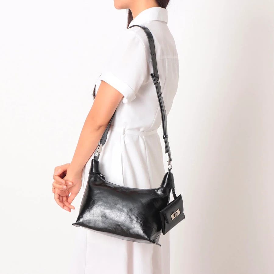 ツルンとしたきれいめな光沢感がある素材とゴールドの金具使いが高見えする2wayショルダーバッグ。