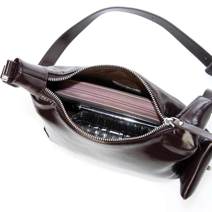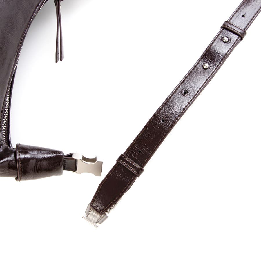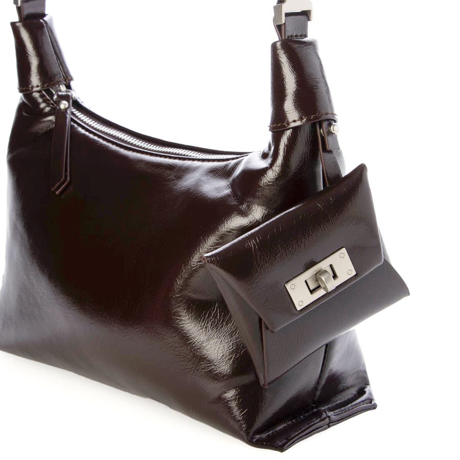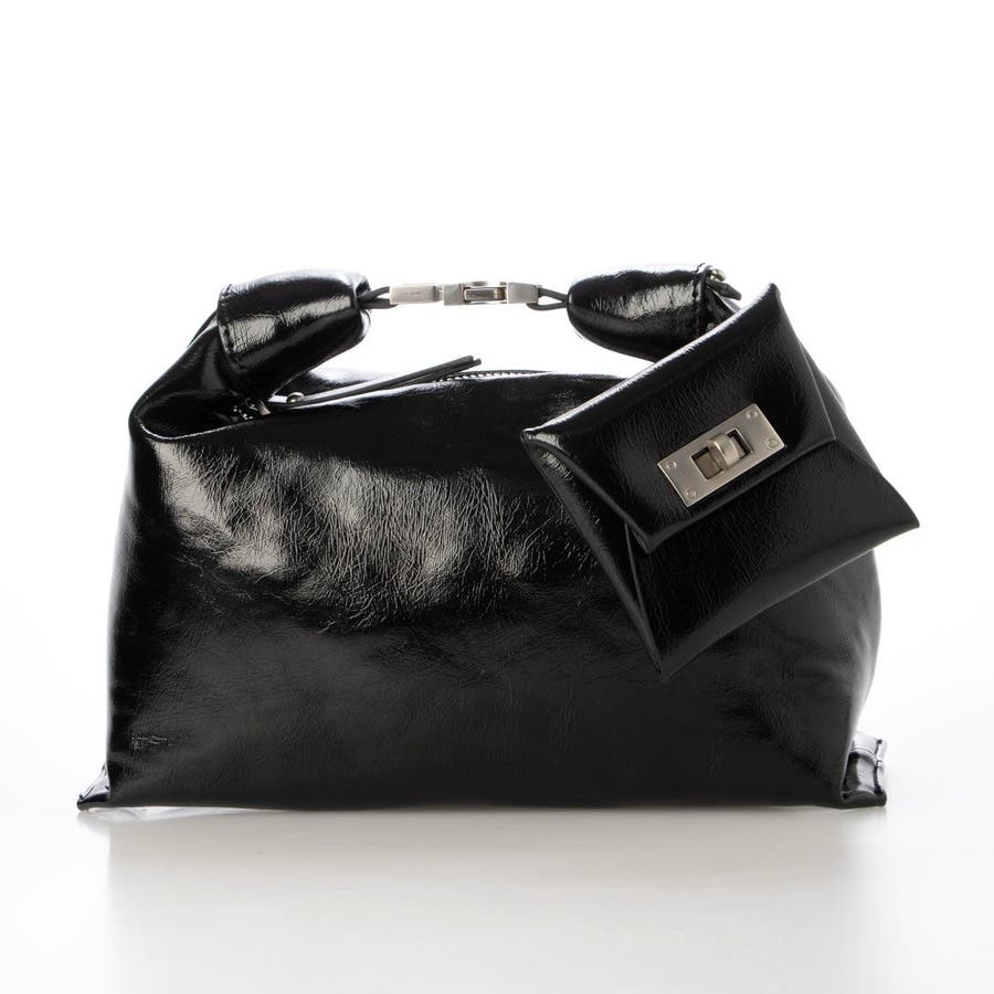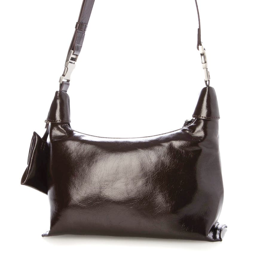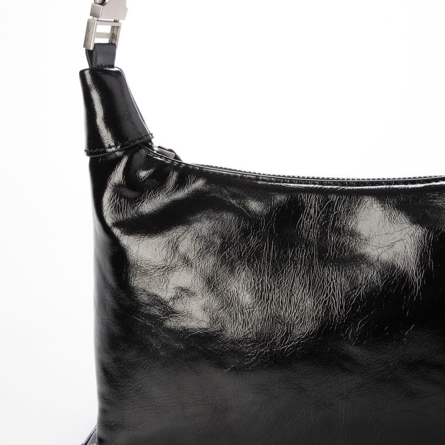 ツルンとしたきれいめな光沢感がある素材とゴールドの金具使いが高見えする2wayショルダーバッグ。