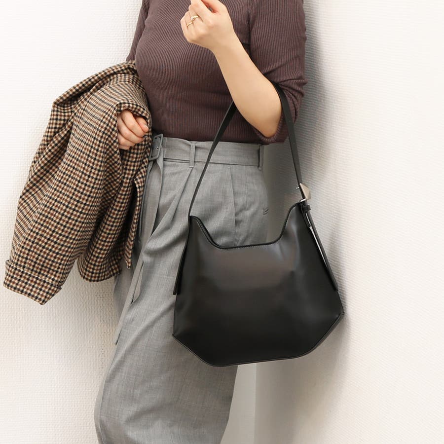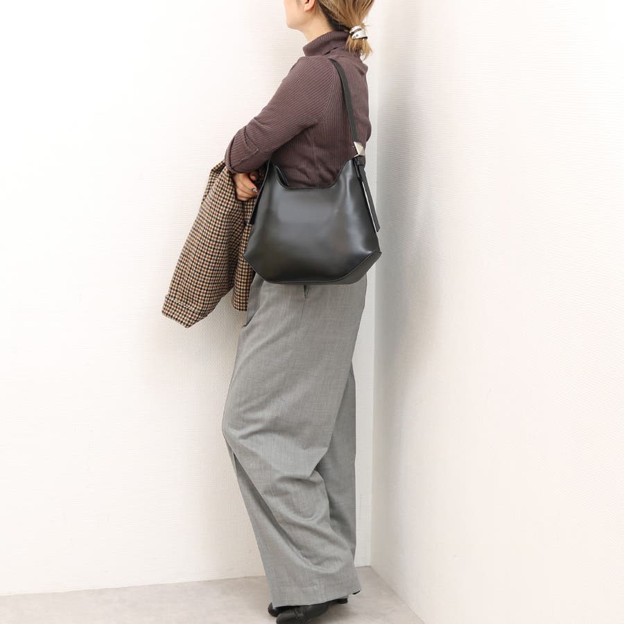 ツルンとした素材とスクエアの金具がきれいめな雰囲気をプラスしていて通勤にも使えそうな雰囲気。