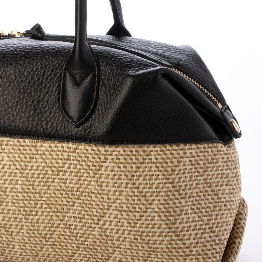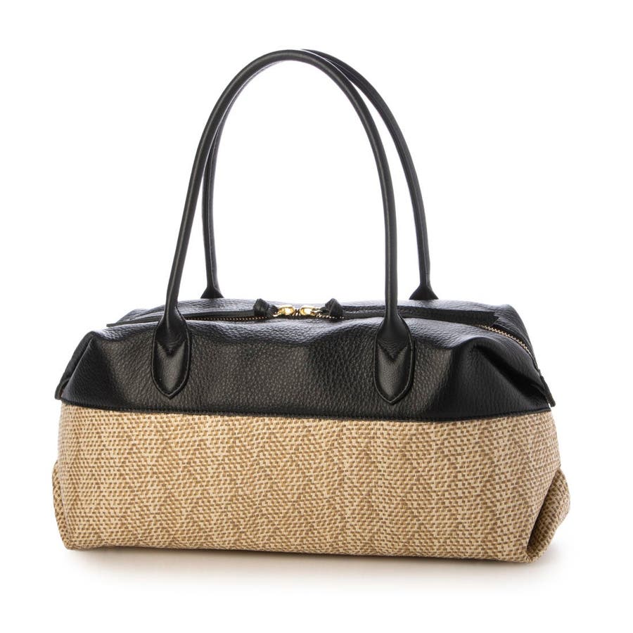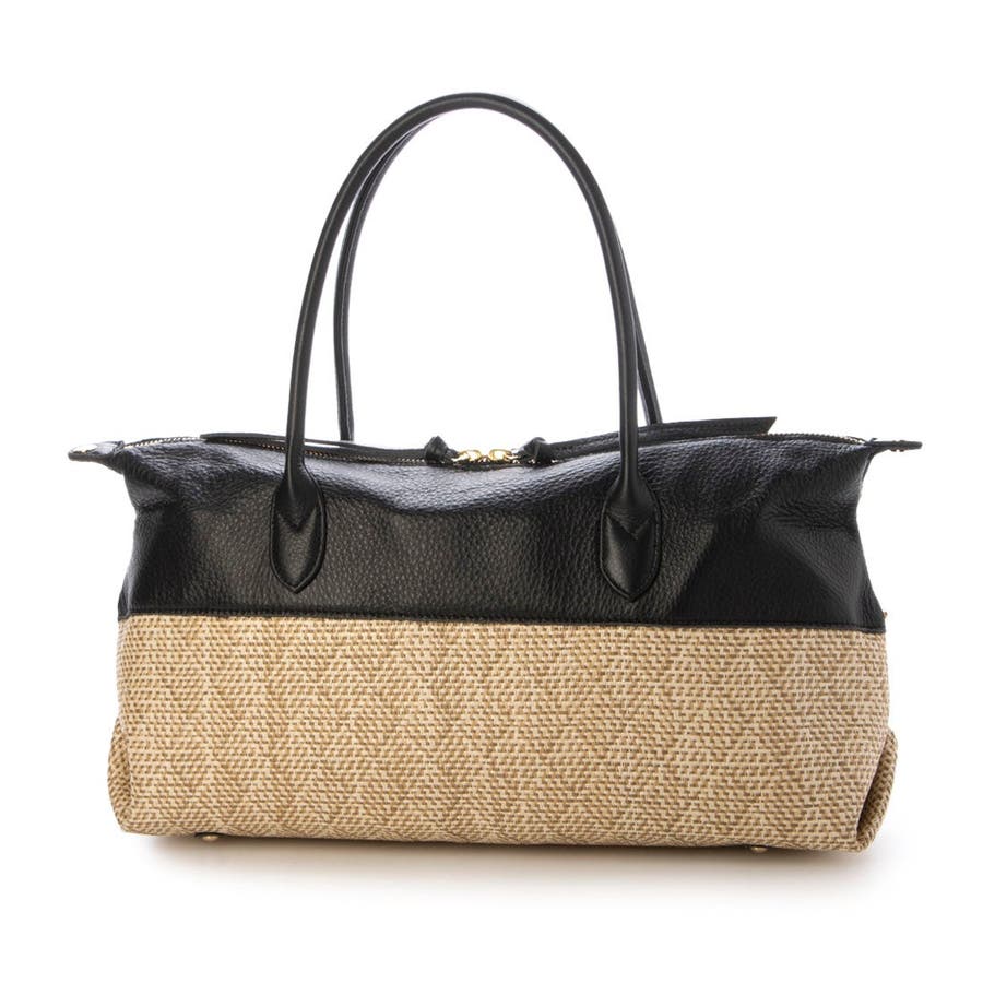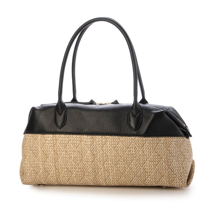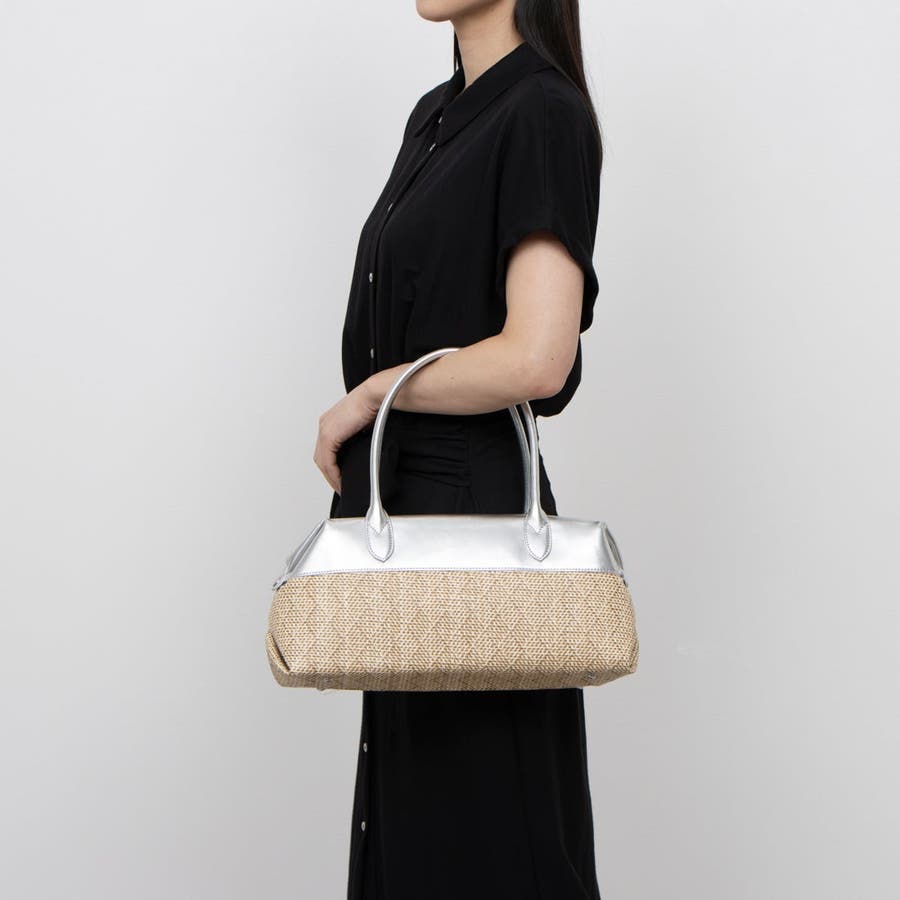 天然素材のような素材と牛革を組み合わせた涼しげなカゴ風の横長ボストン。