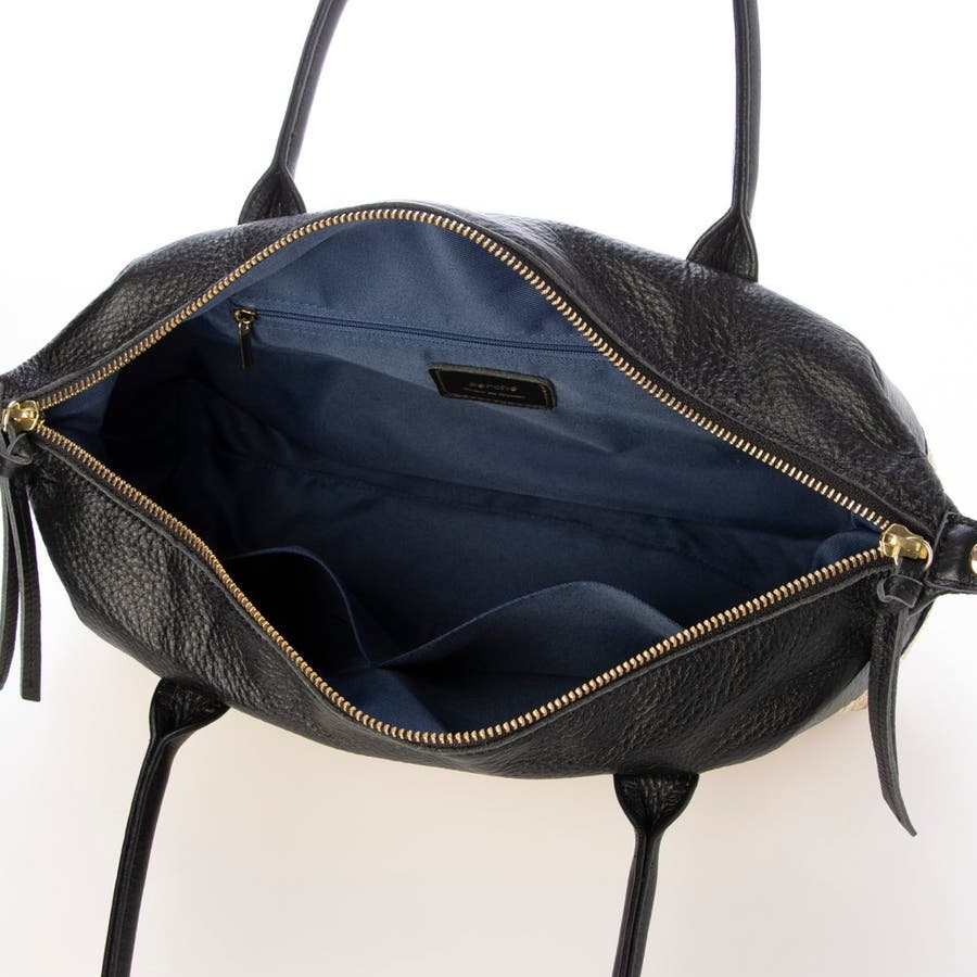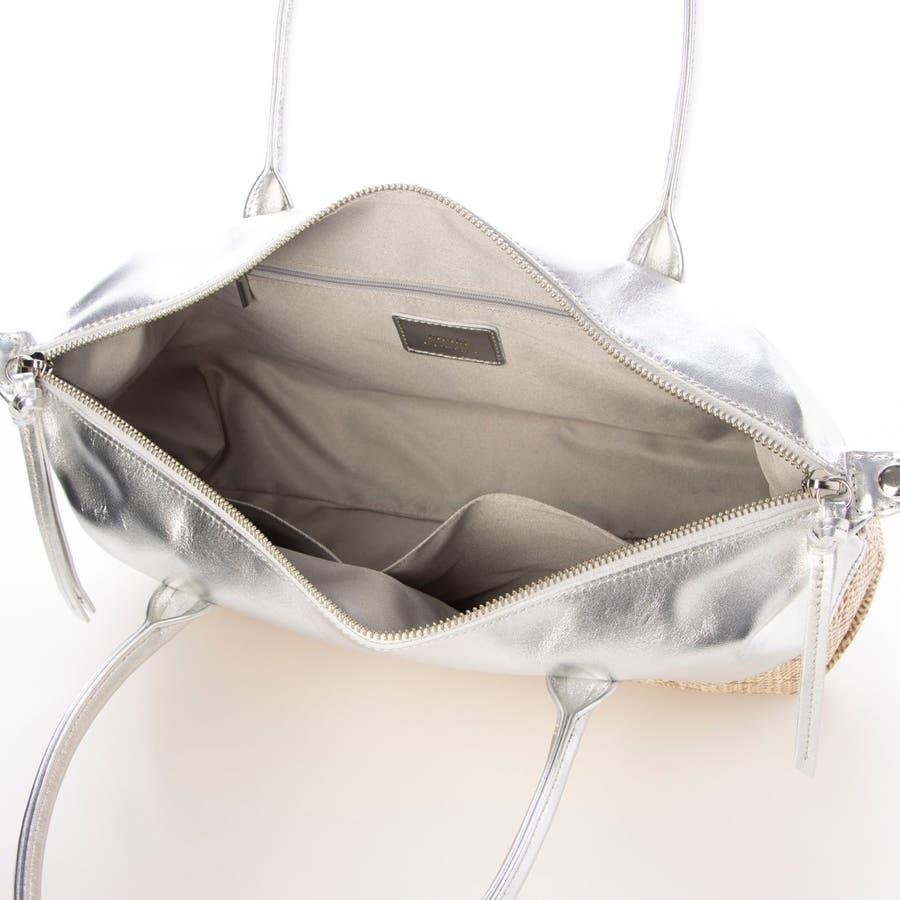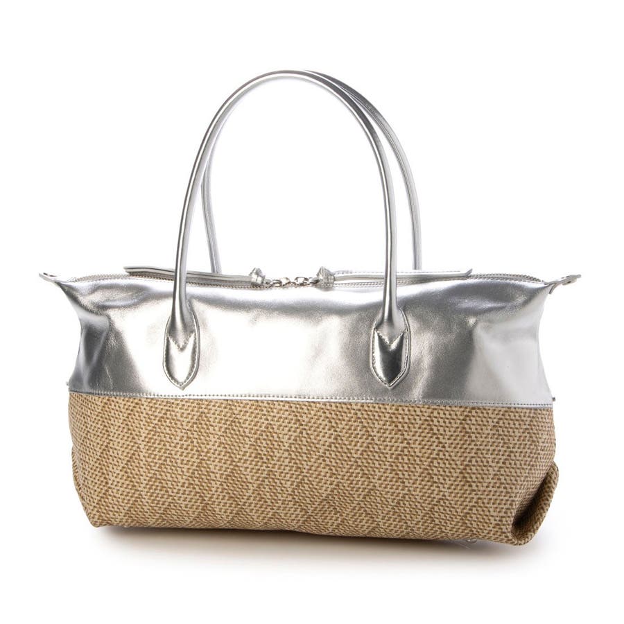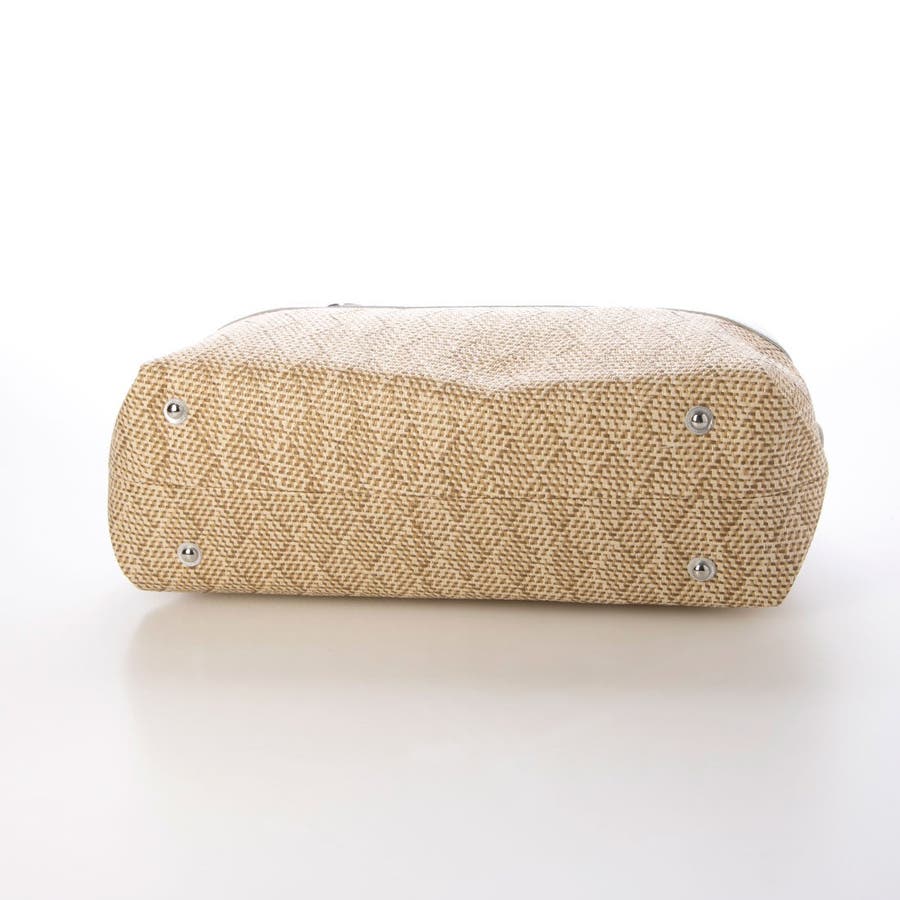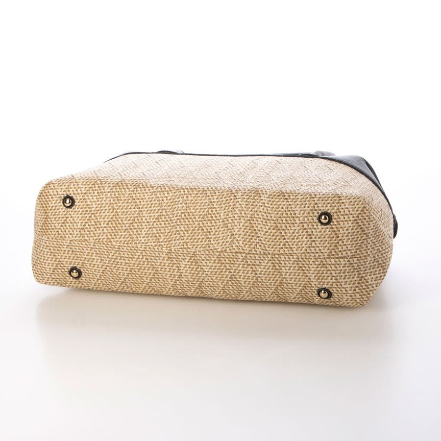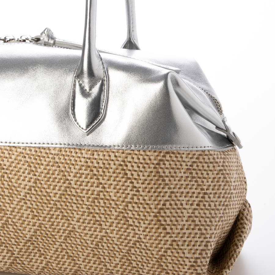 天然素材のような素材と牛革を組み合わせた涼しげなカゴ風の横長ボストン。