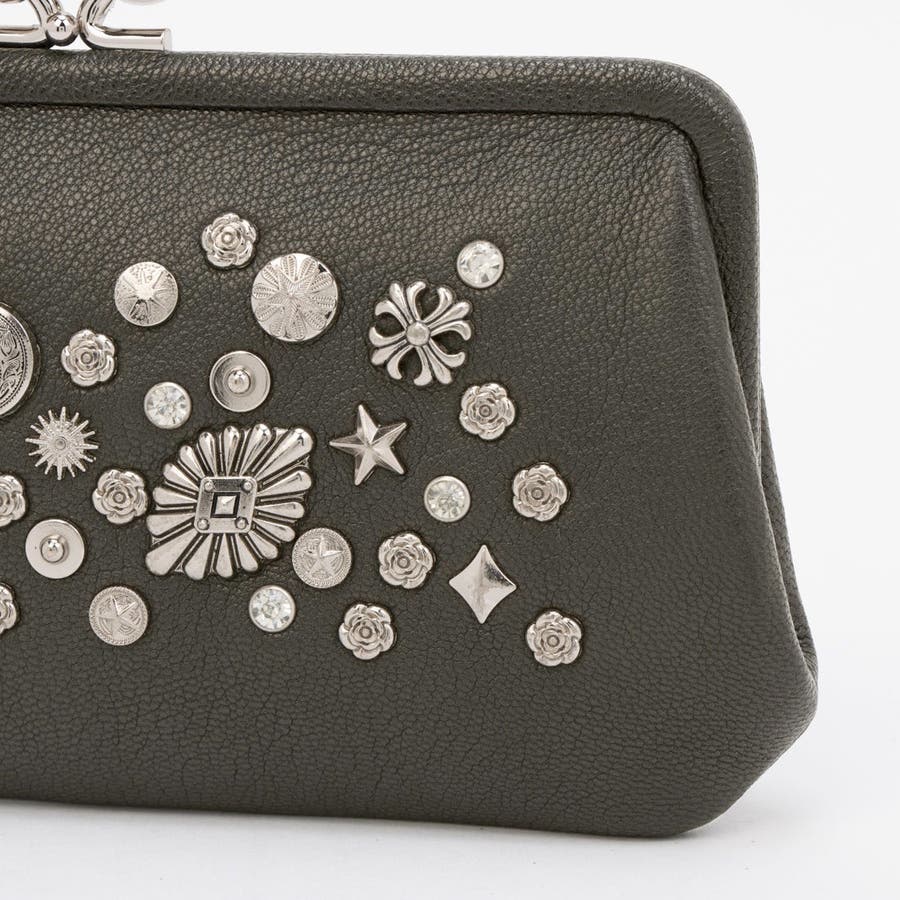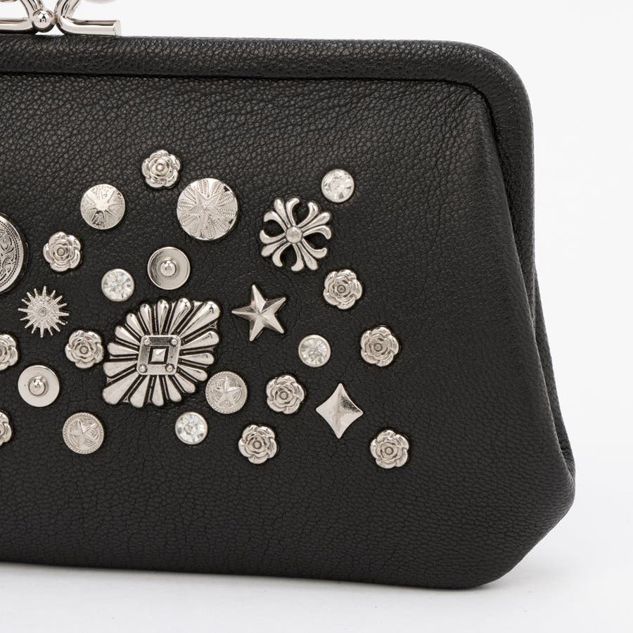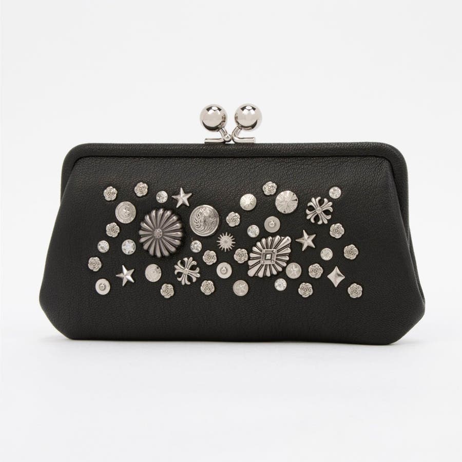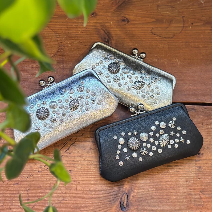 コンチョやいろいろなサイズのスタッズをちりばめたクールでインパクトのあるマルチスタッズ長財布。