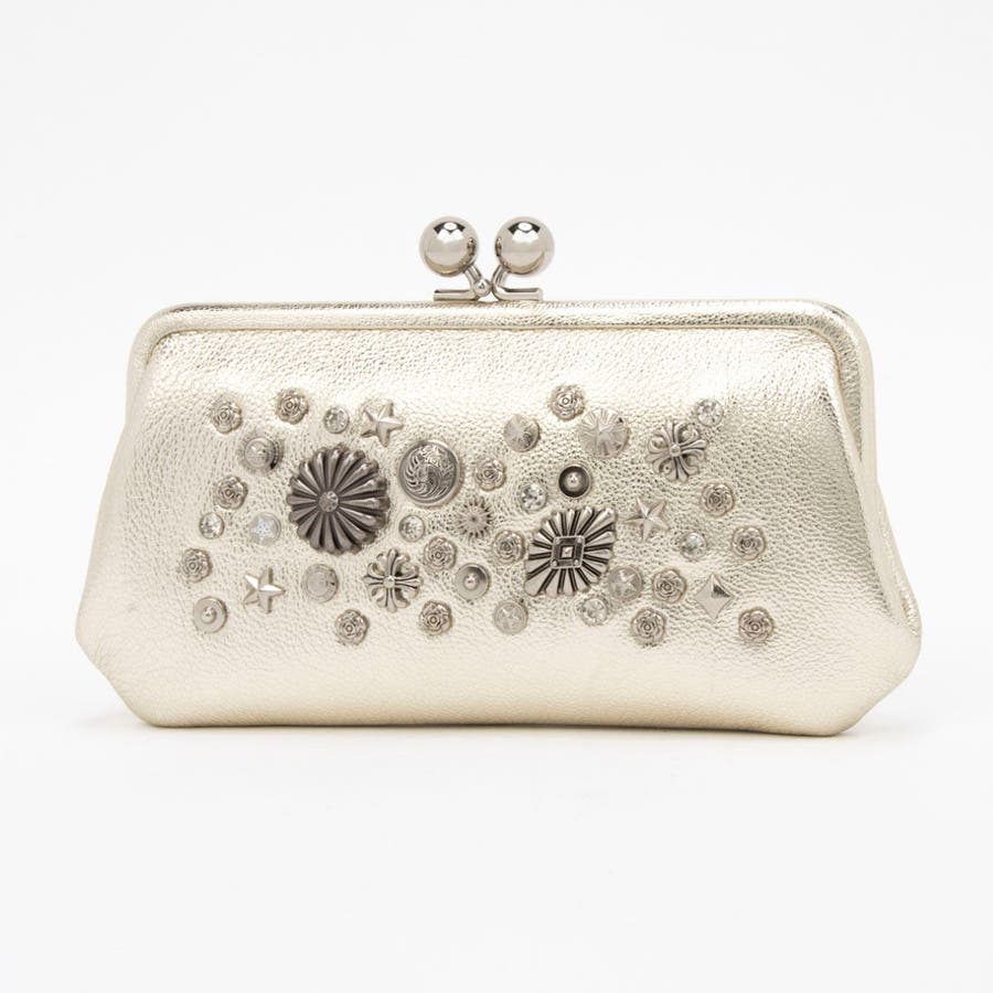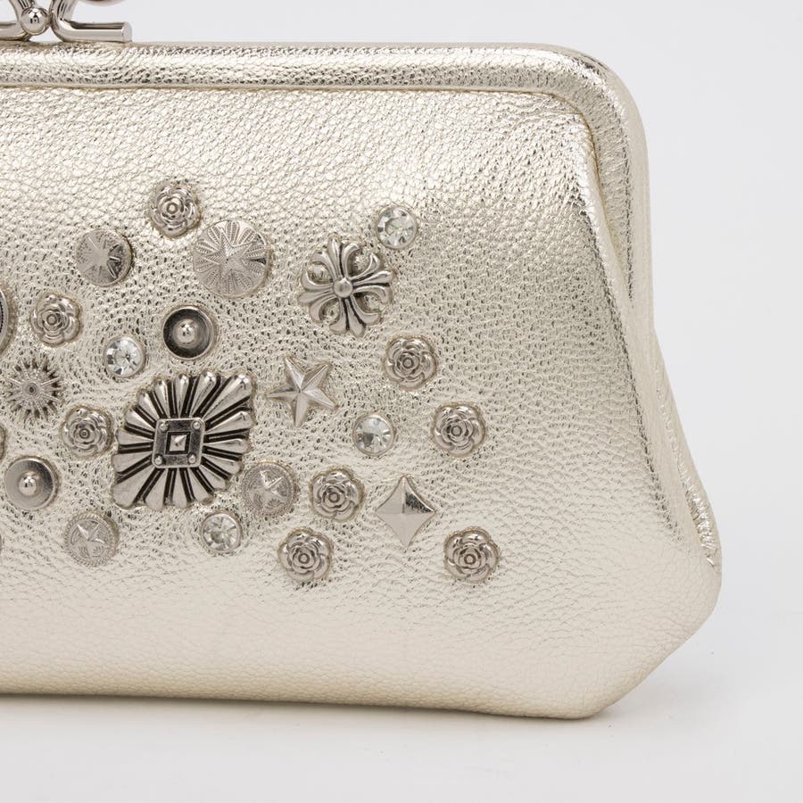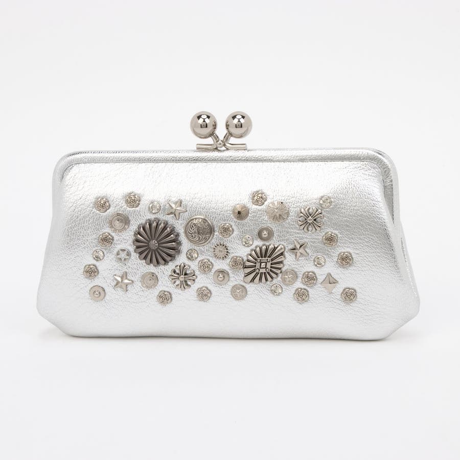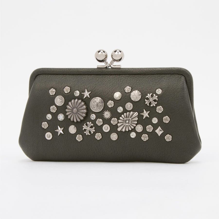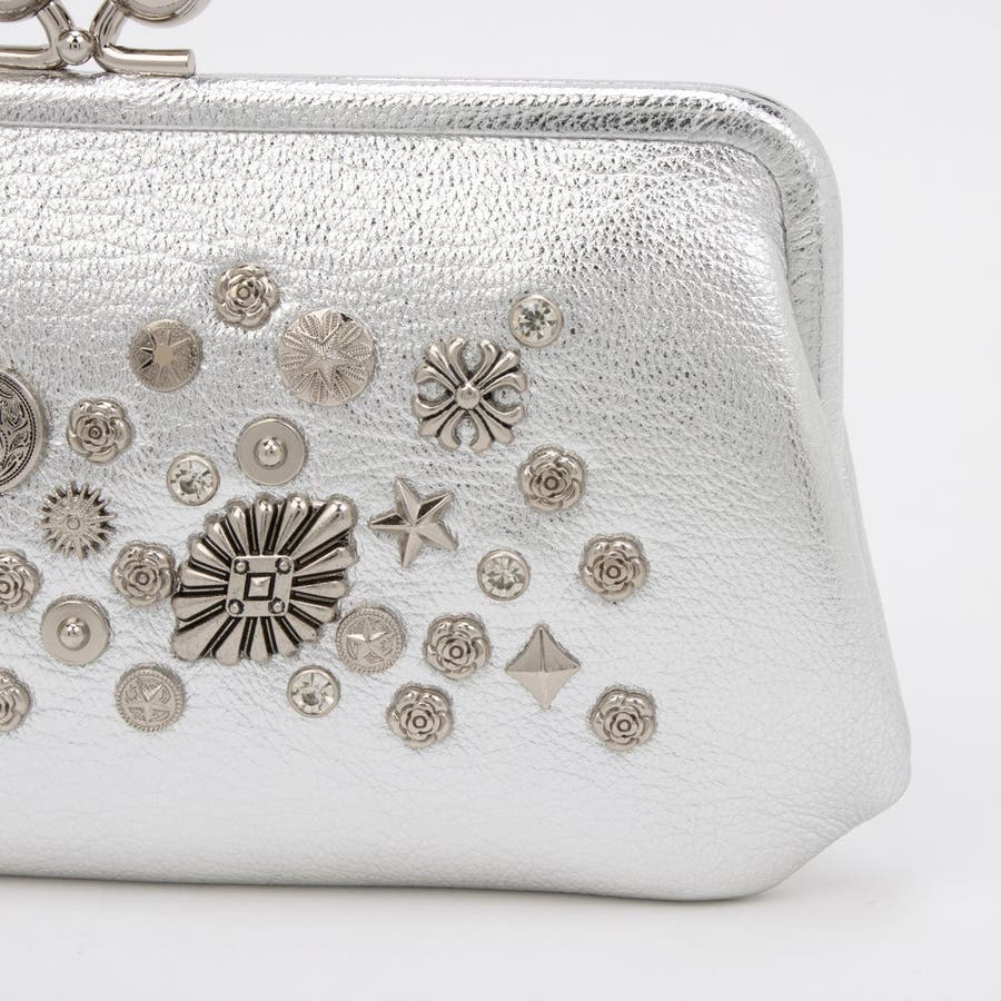 コンチョやいろいろなサイズのスタッズをちりばめたクールでインパクトのあるマルチスタッズ長財布。