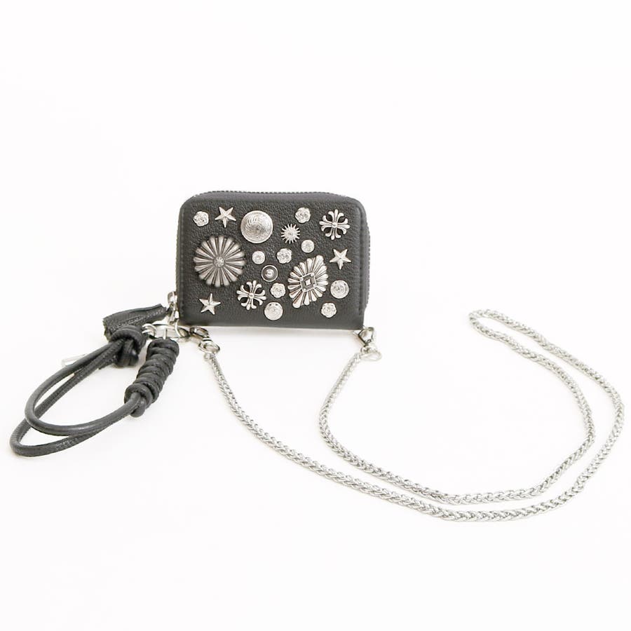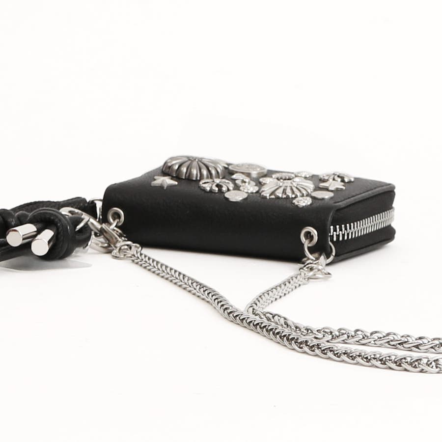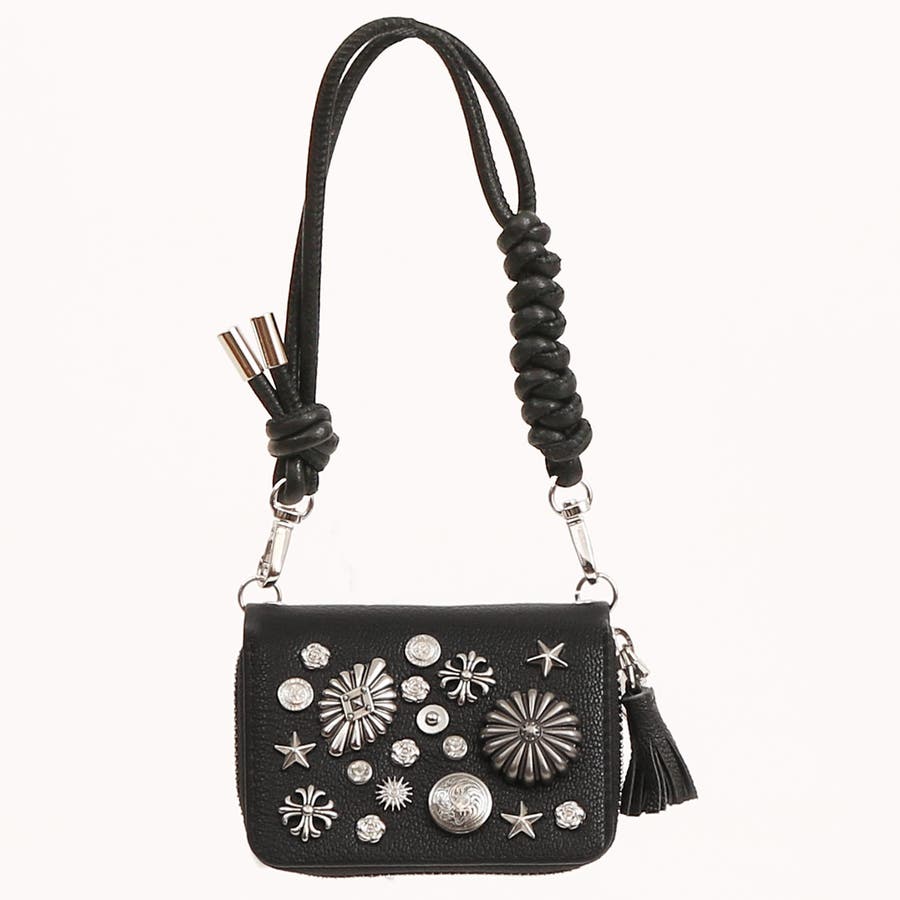 コンチョやいろいろなサイズのスタッズをちりばめたクールでインパクトのあるマルチスタッズにジャバラチャームウォレットショルダーが登場。