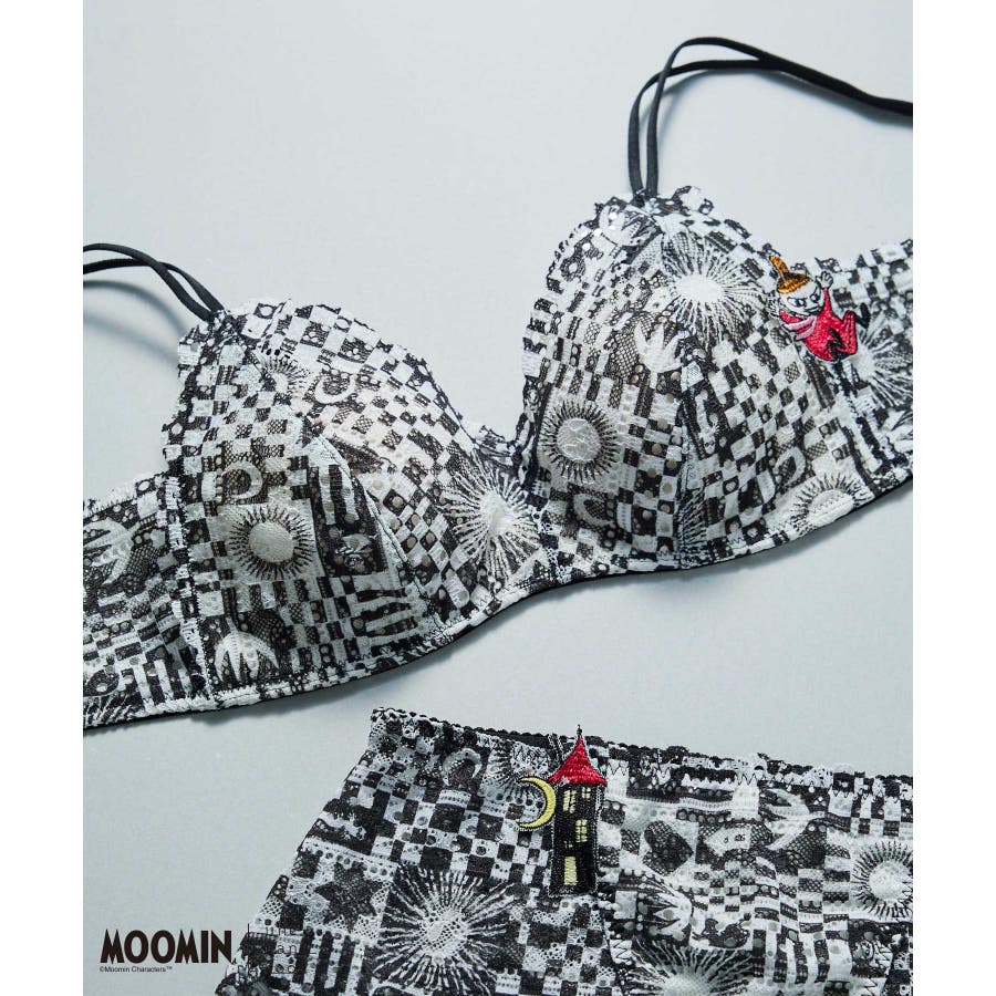 BL/GR ムーミン谷の住人が楽しそうにしている幾何調柄のプリントレースと元気いっぱいのリトルミイのアップリケの組み合わせがコレクションしたくなるデザイン。