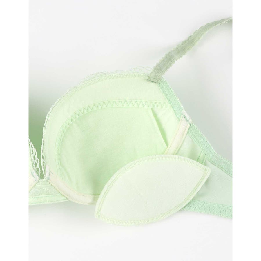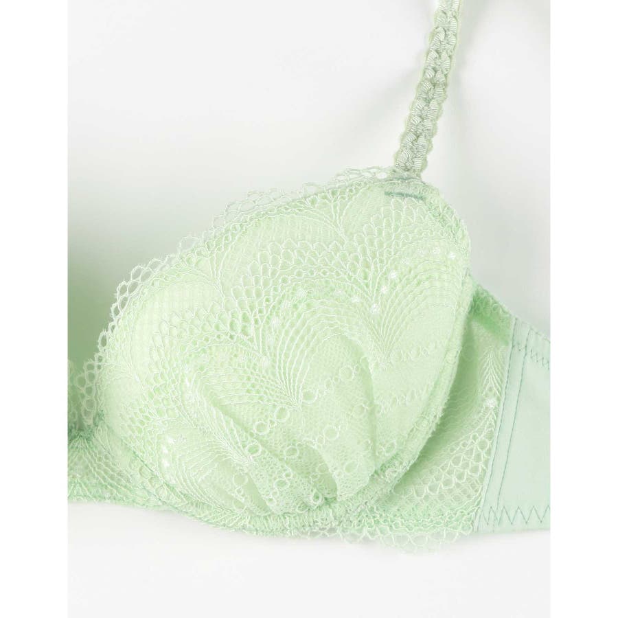 雨粒をイメージしたドット柄と、流れを感じるアーチ柄を組み合わせ、軽快な印象に仕上げたレースを使用したデザインのブラジャー。