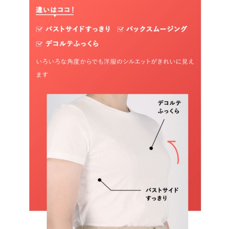 脇高設計による幅の広い脇布でハミ肉をキャッチし、しっかり収めることでバストサイドのラインをすっきりととのえる。