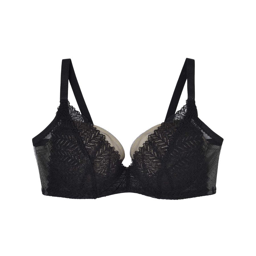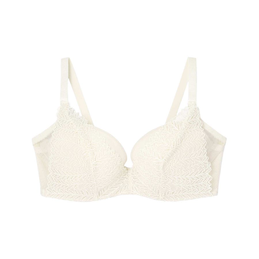 広めのワイヤーがバストをしっかり収めて、バストボリュームをささえることでデコルテふっくら。