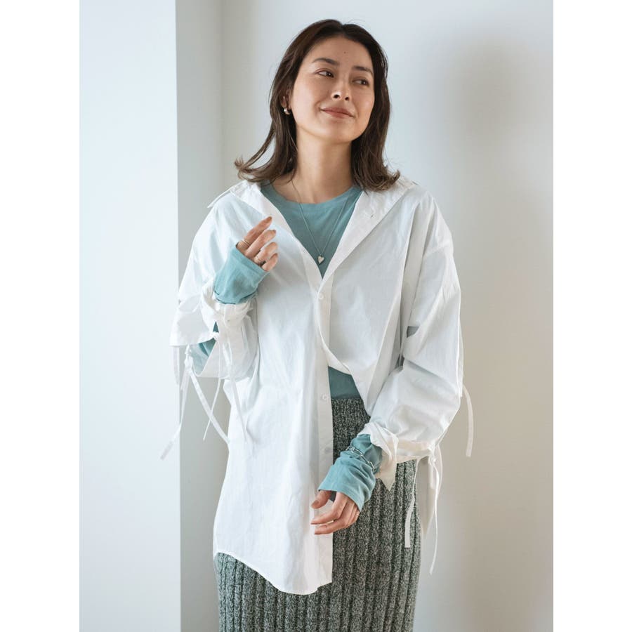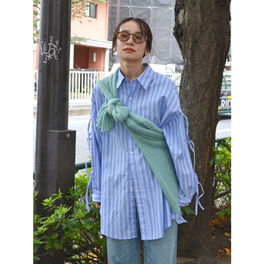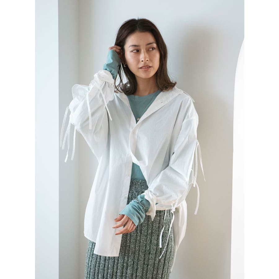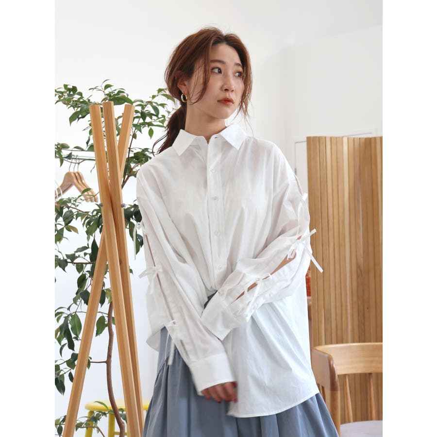 腕の部分がリボンで開いていて春らしく可愛いです。たっぷりしたシャツなのでどの方にも着られると思います。