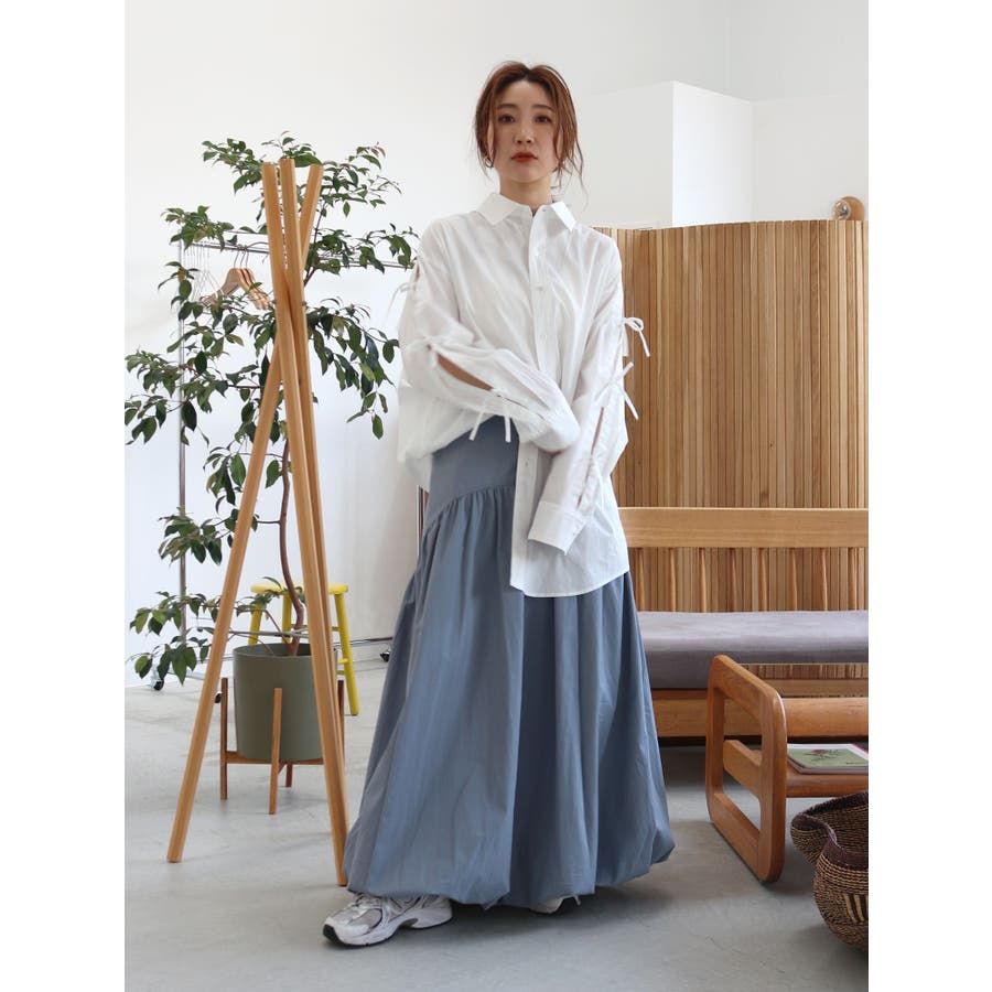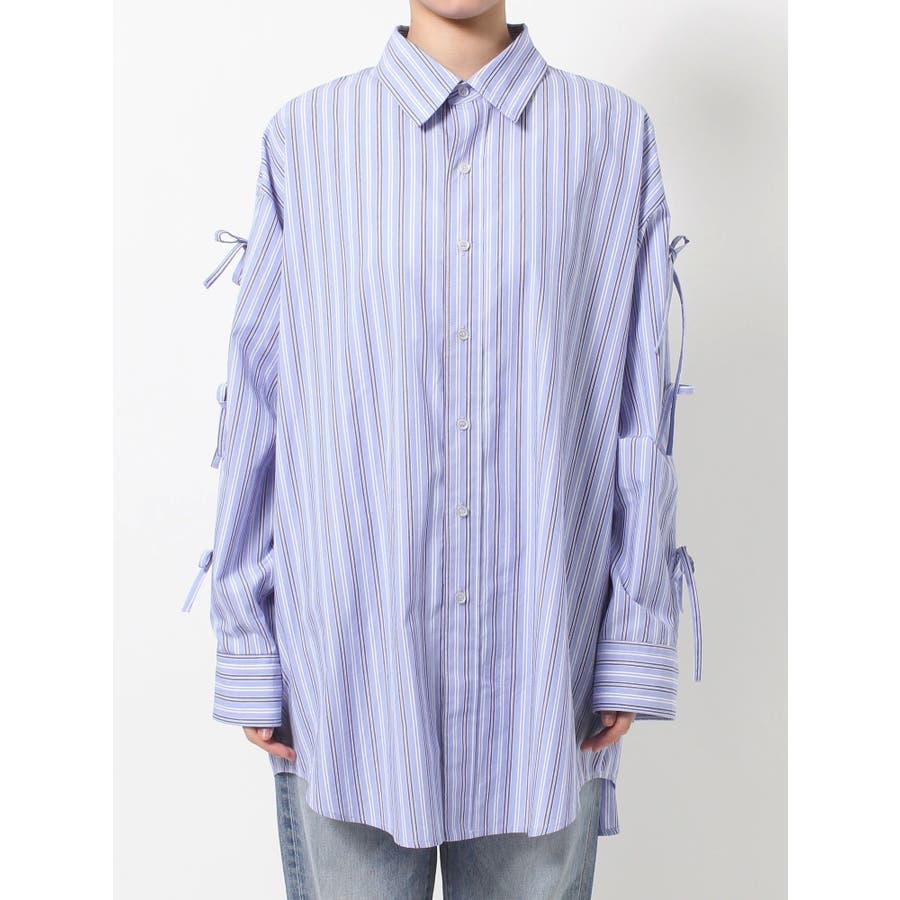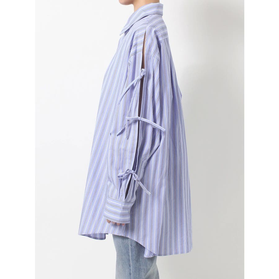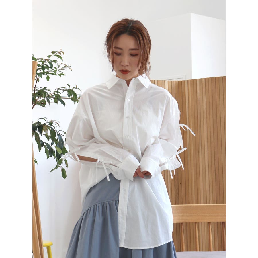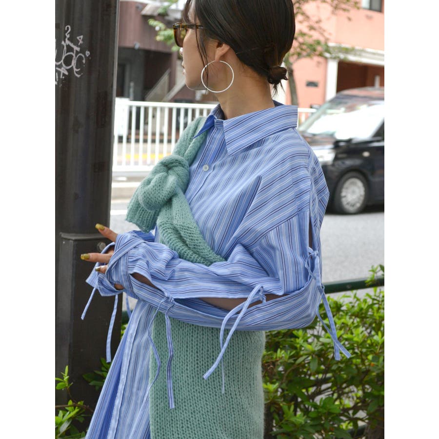 腕の部分がリボンで開いていて春らしく可愛いです。たっぷりしたシャツなのでどの方にも着られると思います。