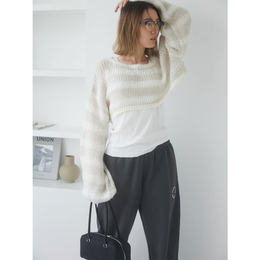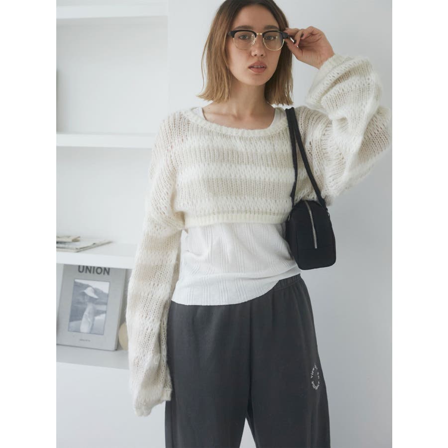 透かし編みボーダーショートニット