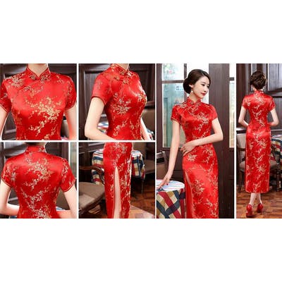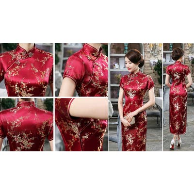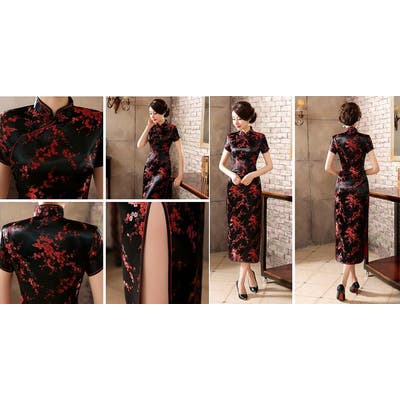 カラーバリエーション豊富なロング丈チャイナドレス。人気商品につきカラーバリエーション追加いたしました、トップ画像左からゴールド、赤、黒、青、ピンク、赤紫、の6色で展開しております。