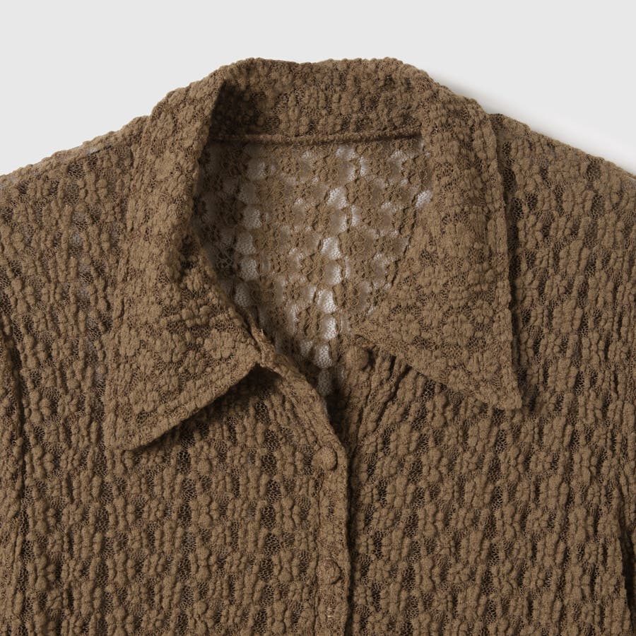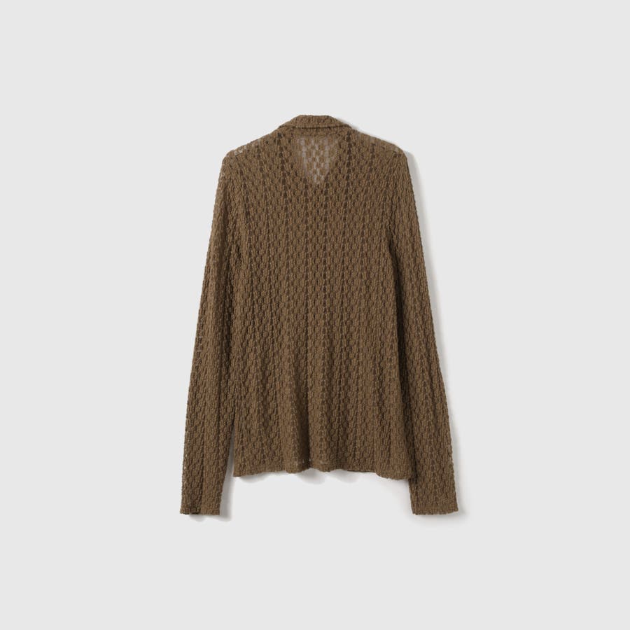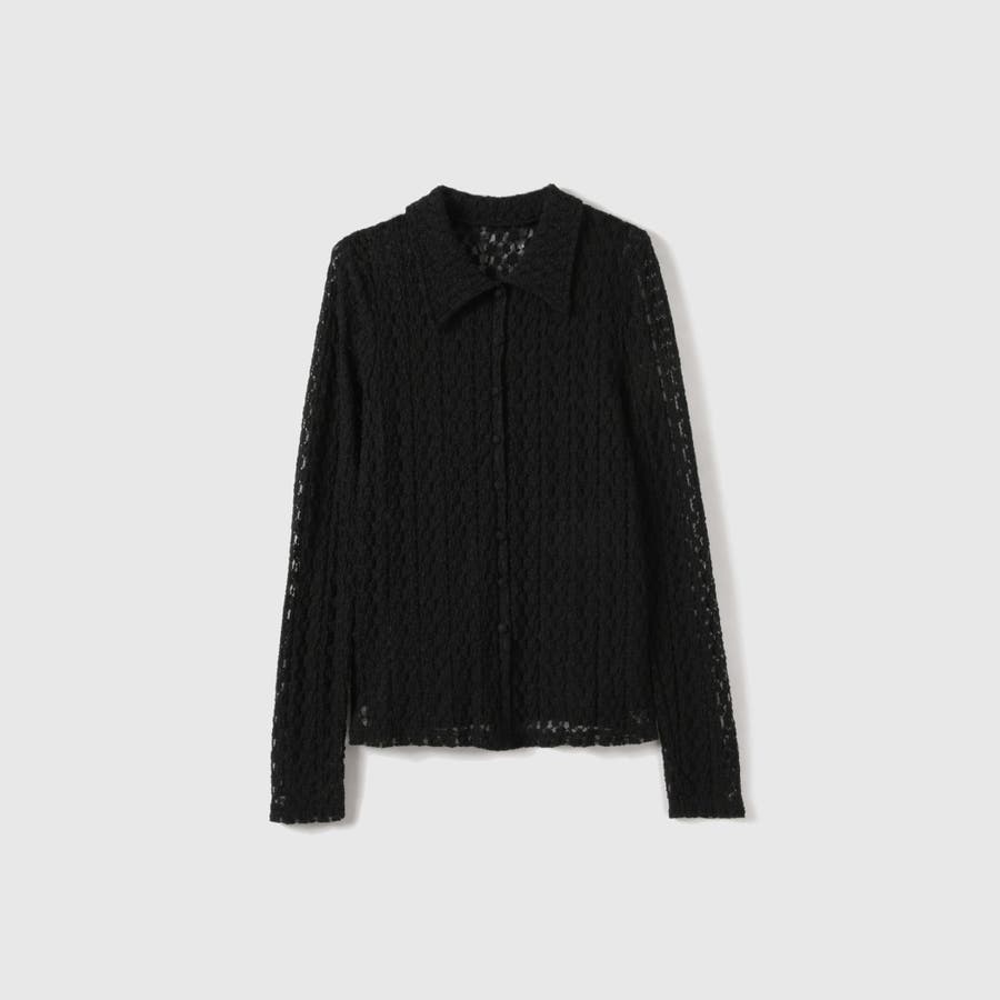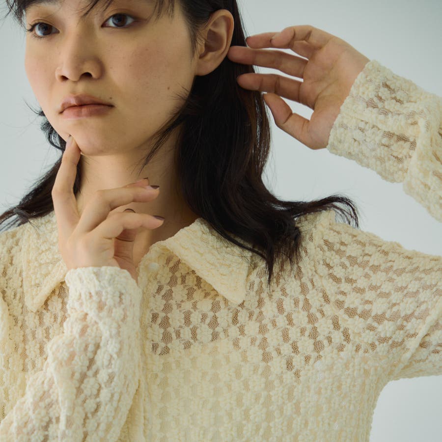 トレンドのポロ襟デザインのトップスもストレッチレース素材でモードにアップデートした一枚です。